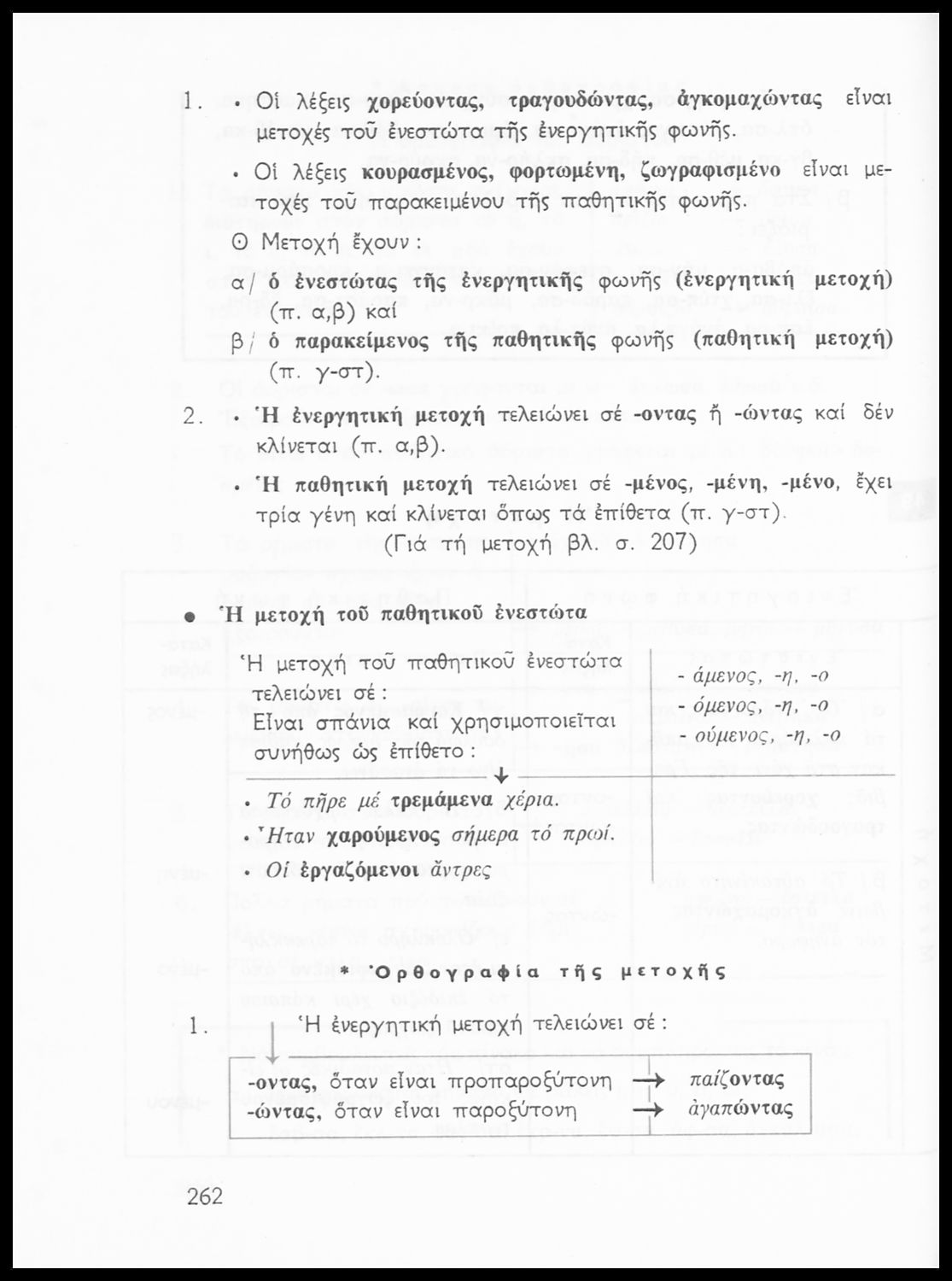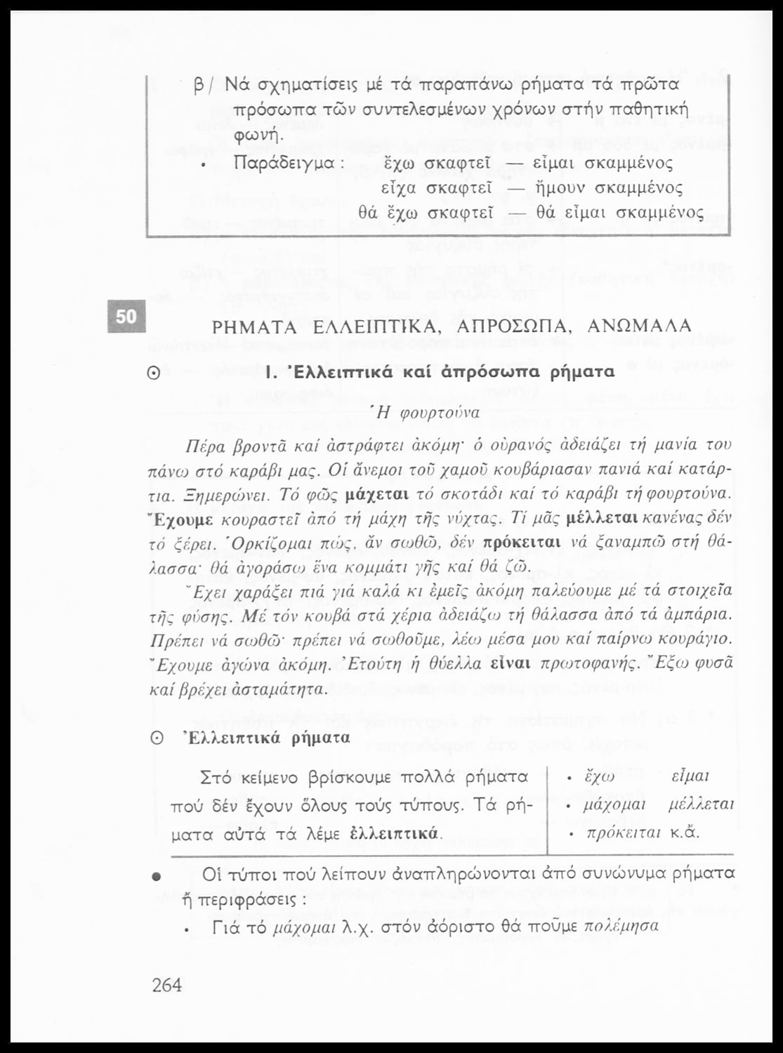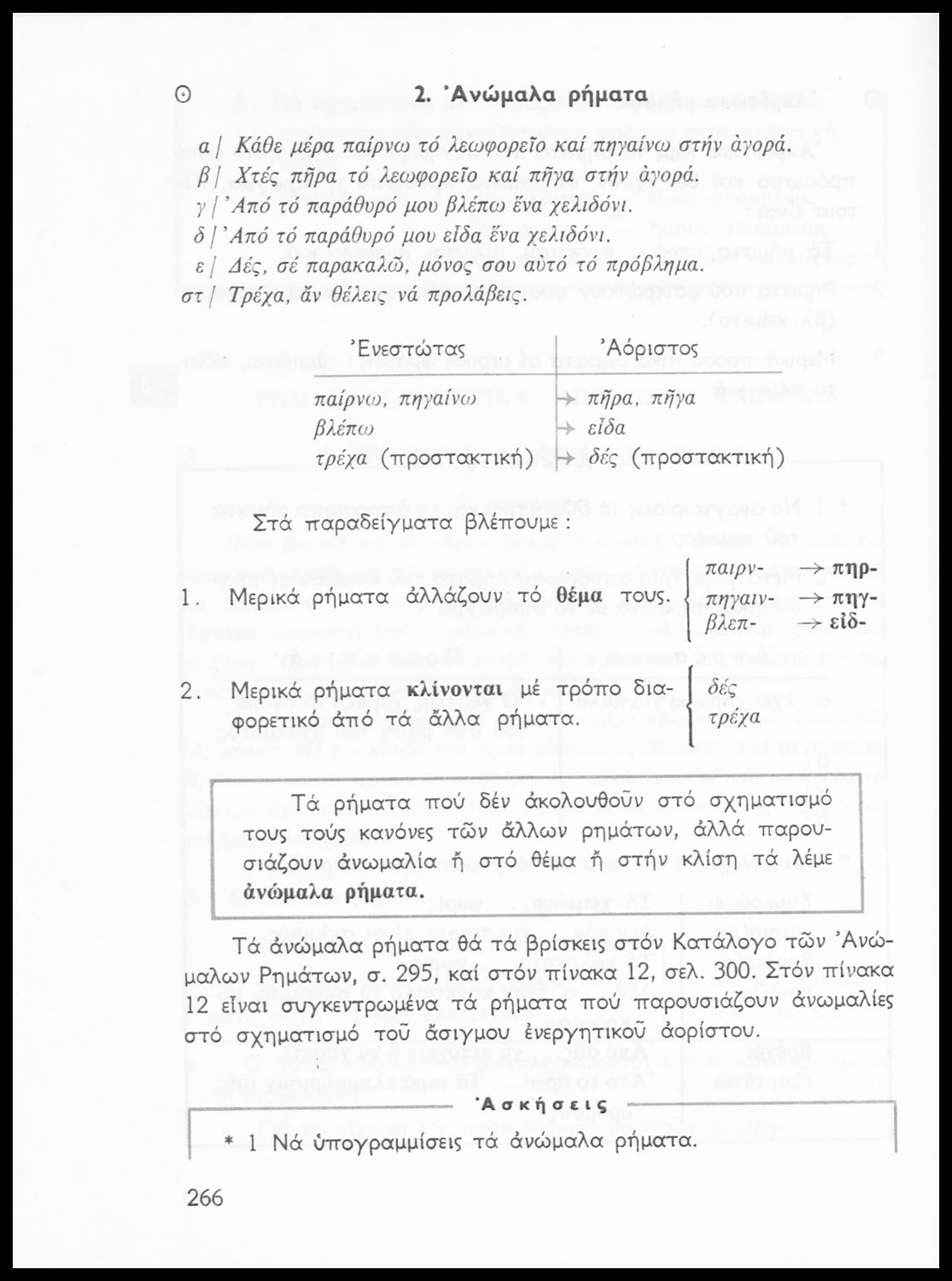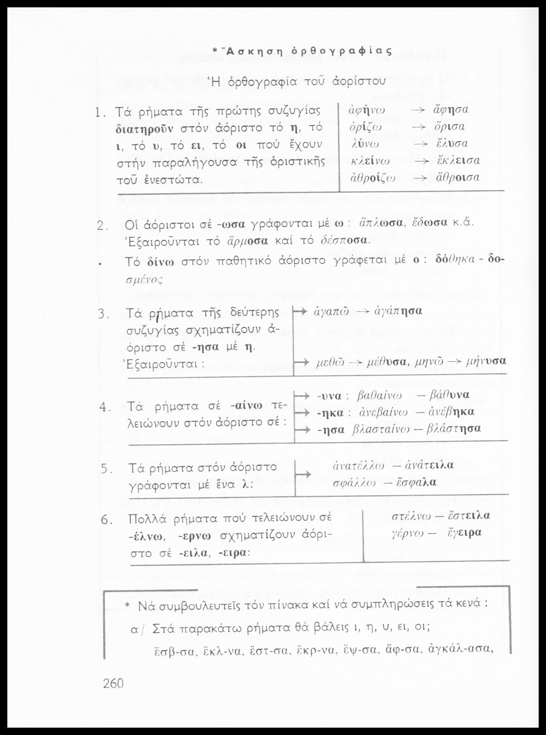 Σχολικό εγχειρίδιο της Ε΄ και ΣΤ΄ τάξης Δημοτικού για την γραμματική της ελληνικής γλώσσας με κανόνες και παραδείγματα. Στο επίμετρο υπάρχουν πίνακες με ανώμαλους σχηματισμούς ρημάτων.