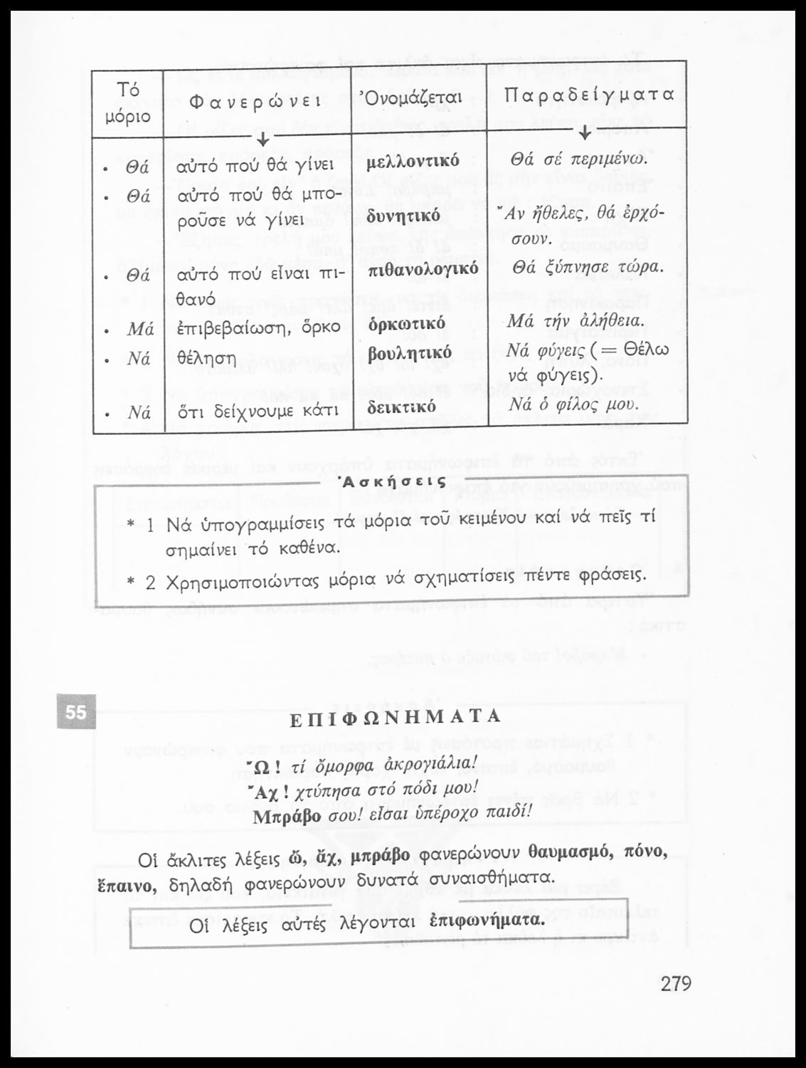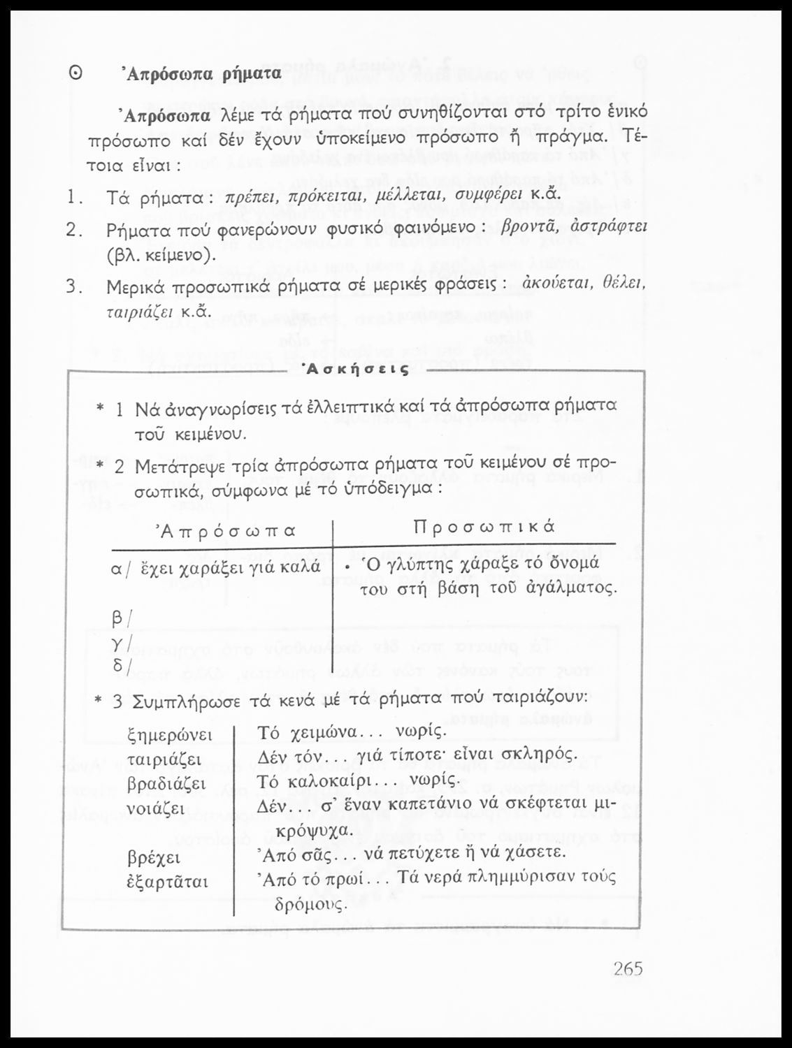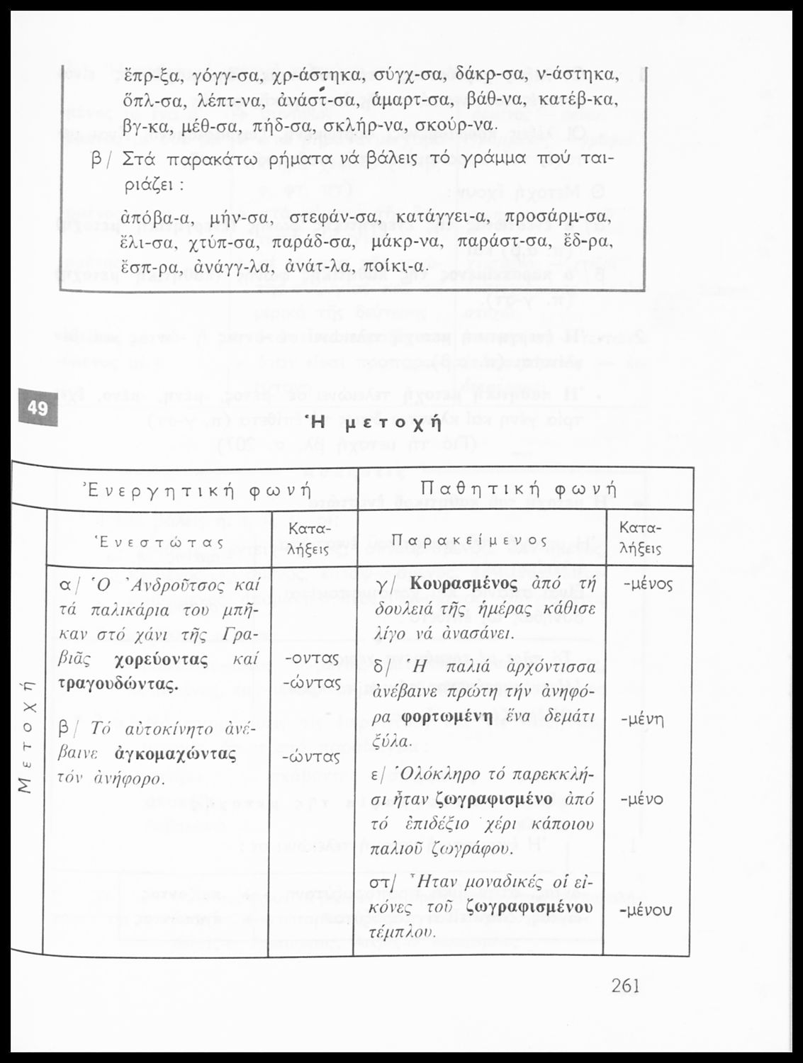 Σχολικό εγχειρίδιο της Ε΄ και ΣΤ΄ τάξης Δημοτικού για την γραμματική της ελληνικής γλώσσας με κανόνες και παραδείγματα. Στο επίμετρο υπάρχουν πίνακες με ανώμαλους σχηματισμούς ρημάτων.