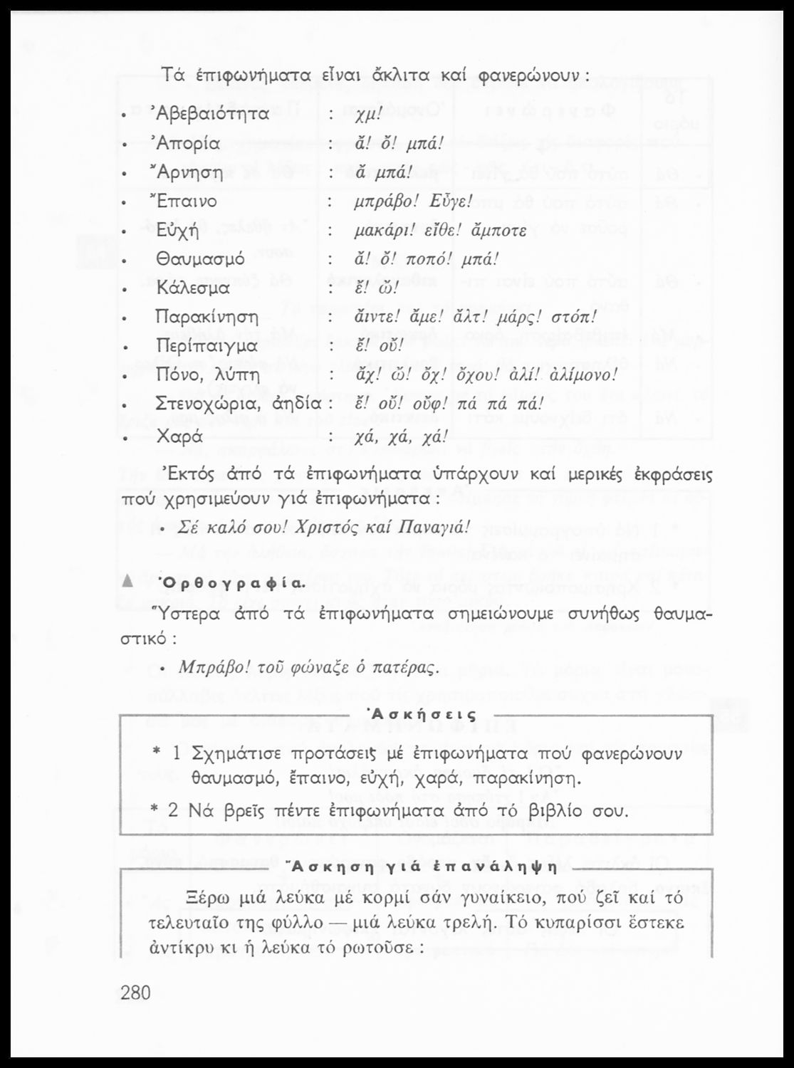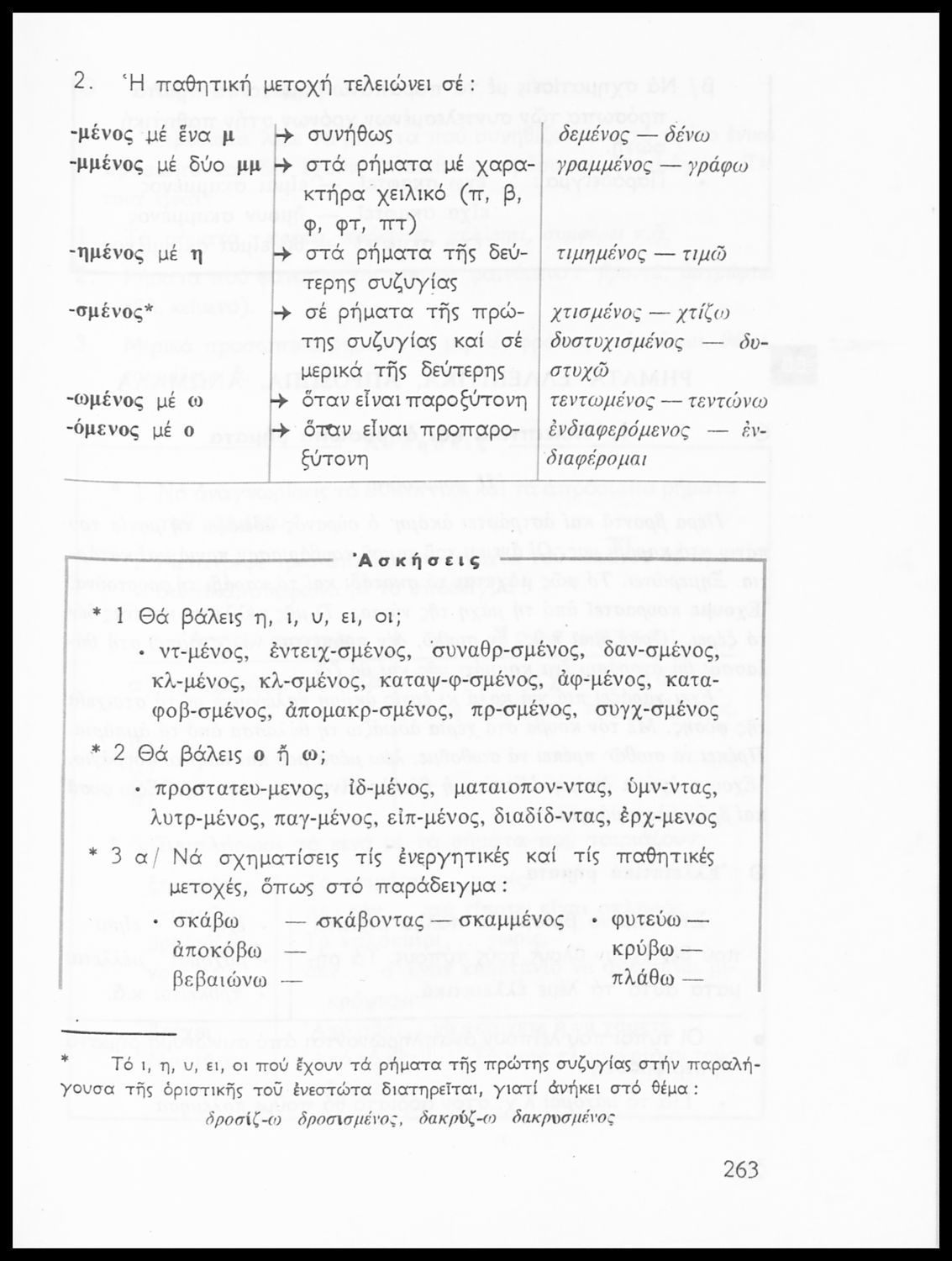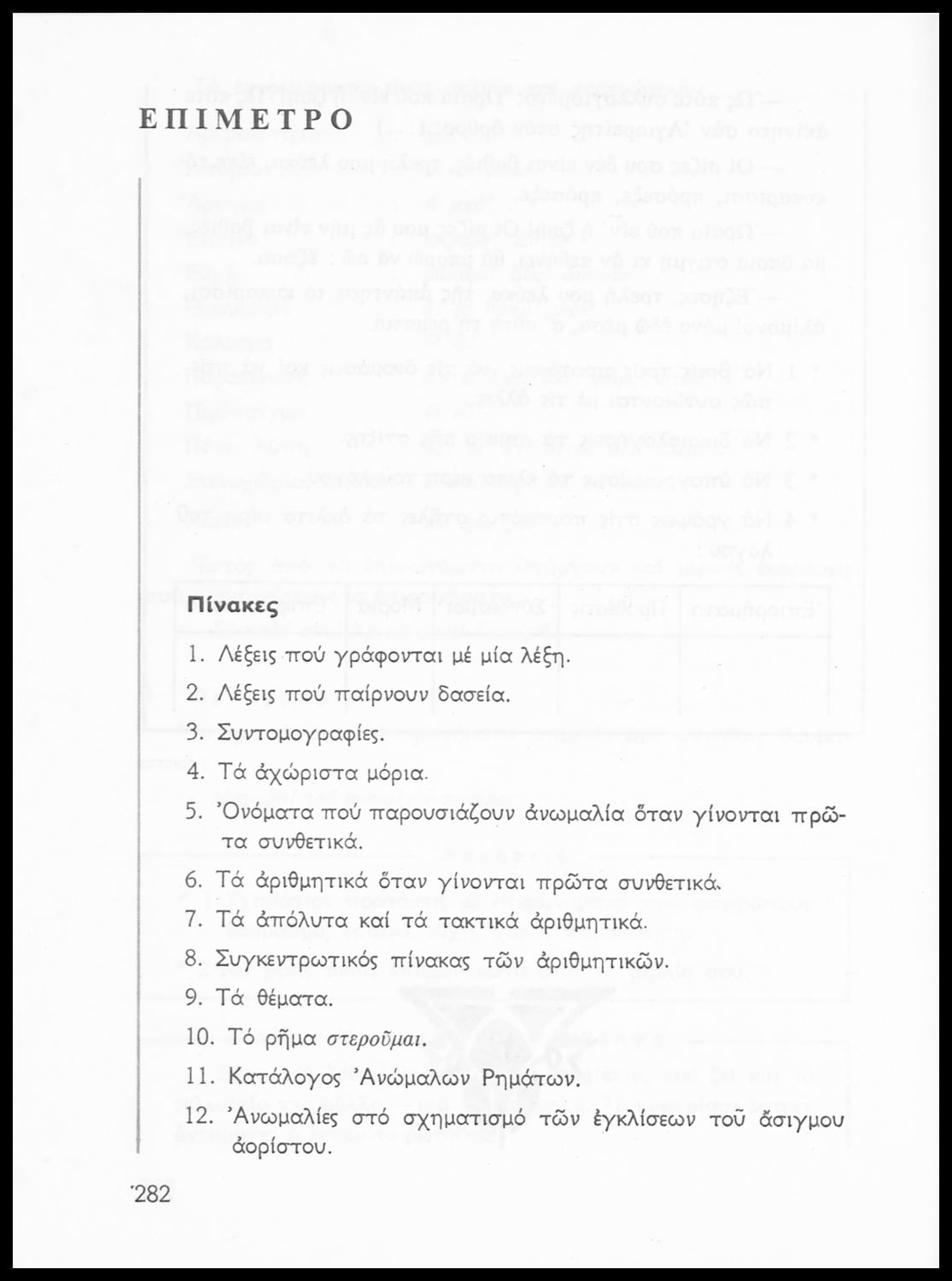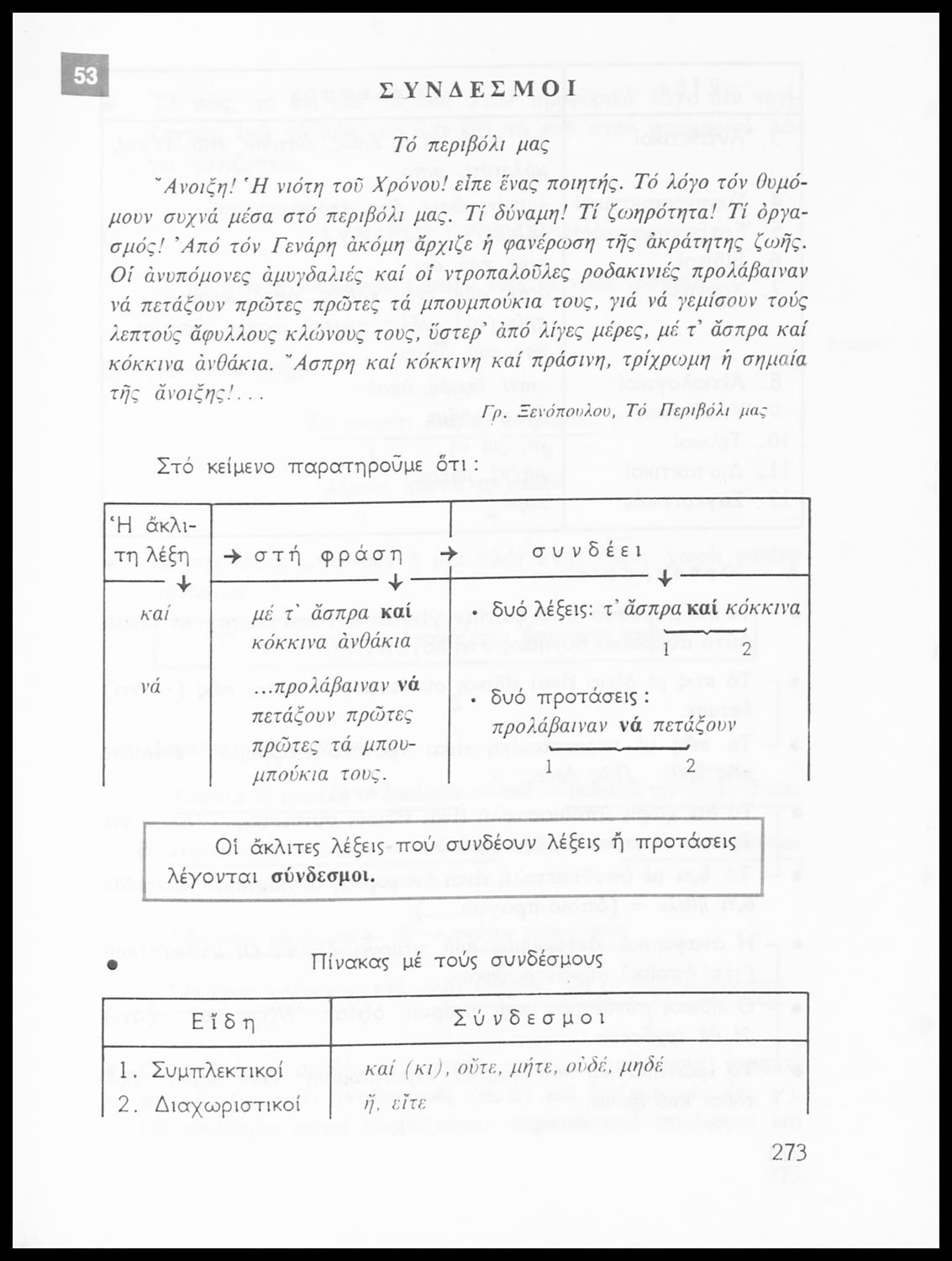 Σχολικό εγχειρίδιο της Ε΄ και ΣΤ΄ τάξης Δημοτικού για την γραμματική της ελληνικής γλώσσας με κανόνες και παραδείγματα. Στο επίμετρο υπάρχουν πίνακες με ανώμαλους σχηματισμούς ρημάτων.