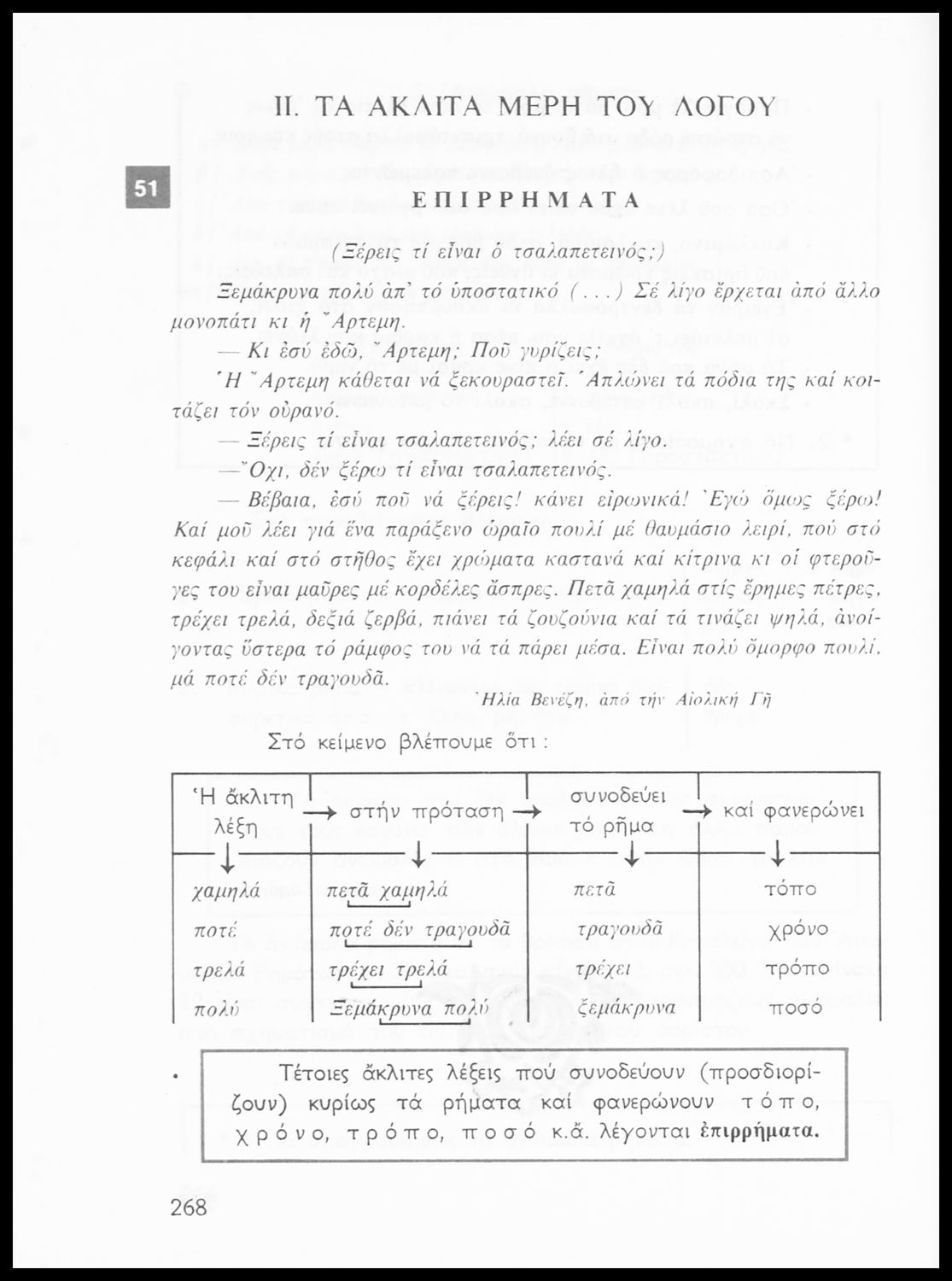 Σχολικό εγχειρίδιο για την Ε΄ και ΣΤ΄ τάξη Δημοτικού με γραμματικούς κανόνες και παραδείγματα για τα κλιτά και άκλιτα μέρη του λόγου.