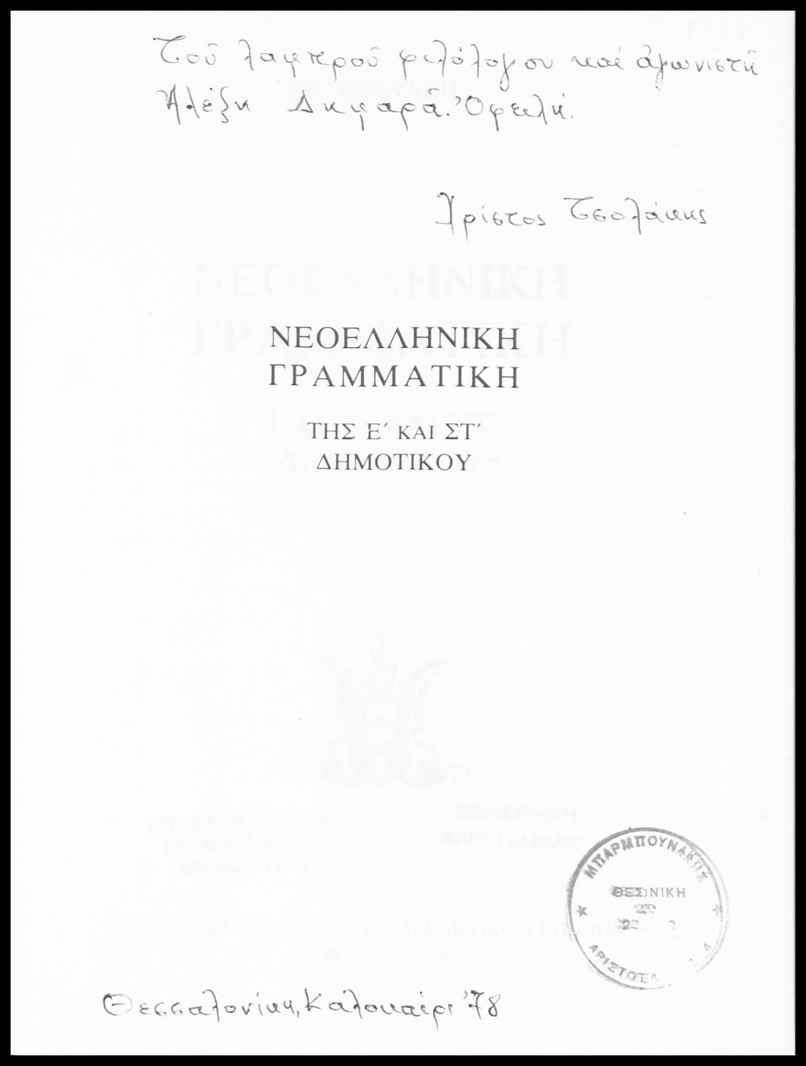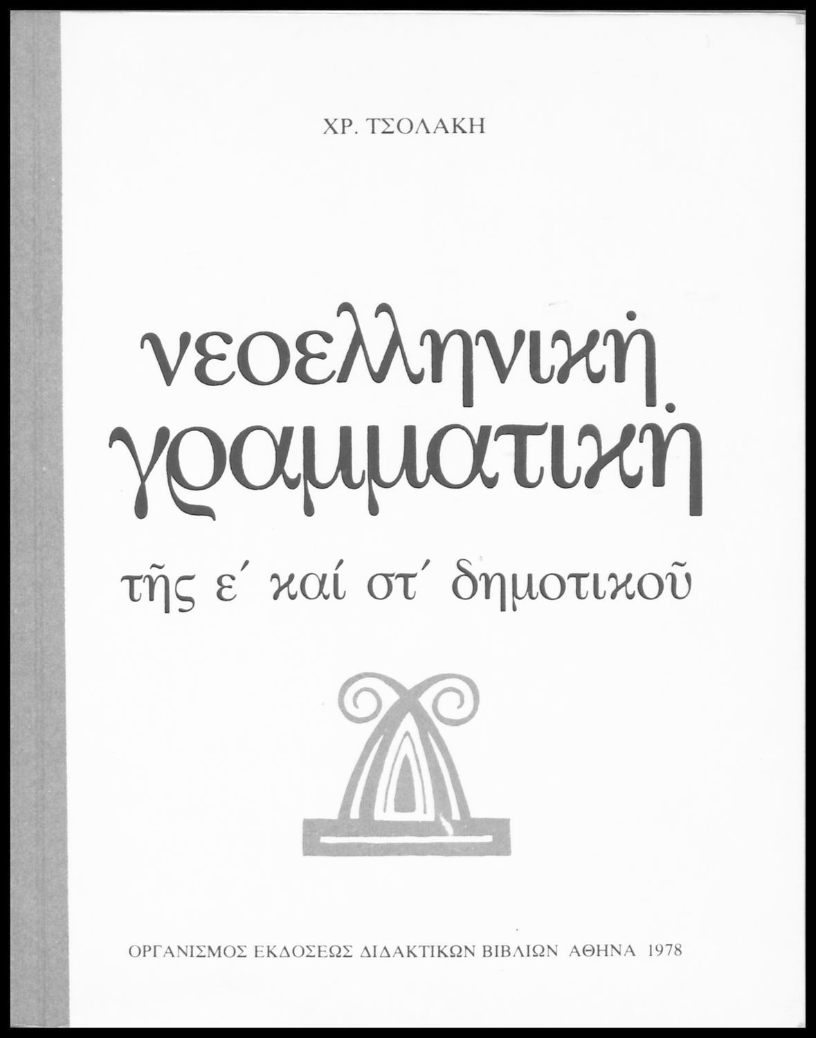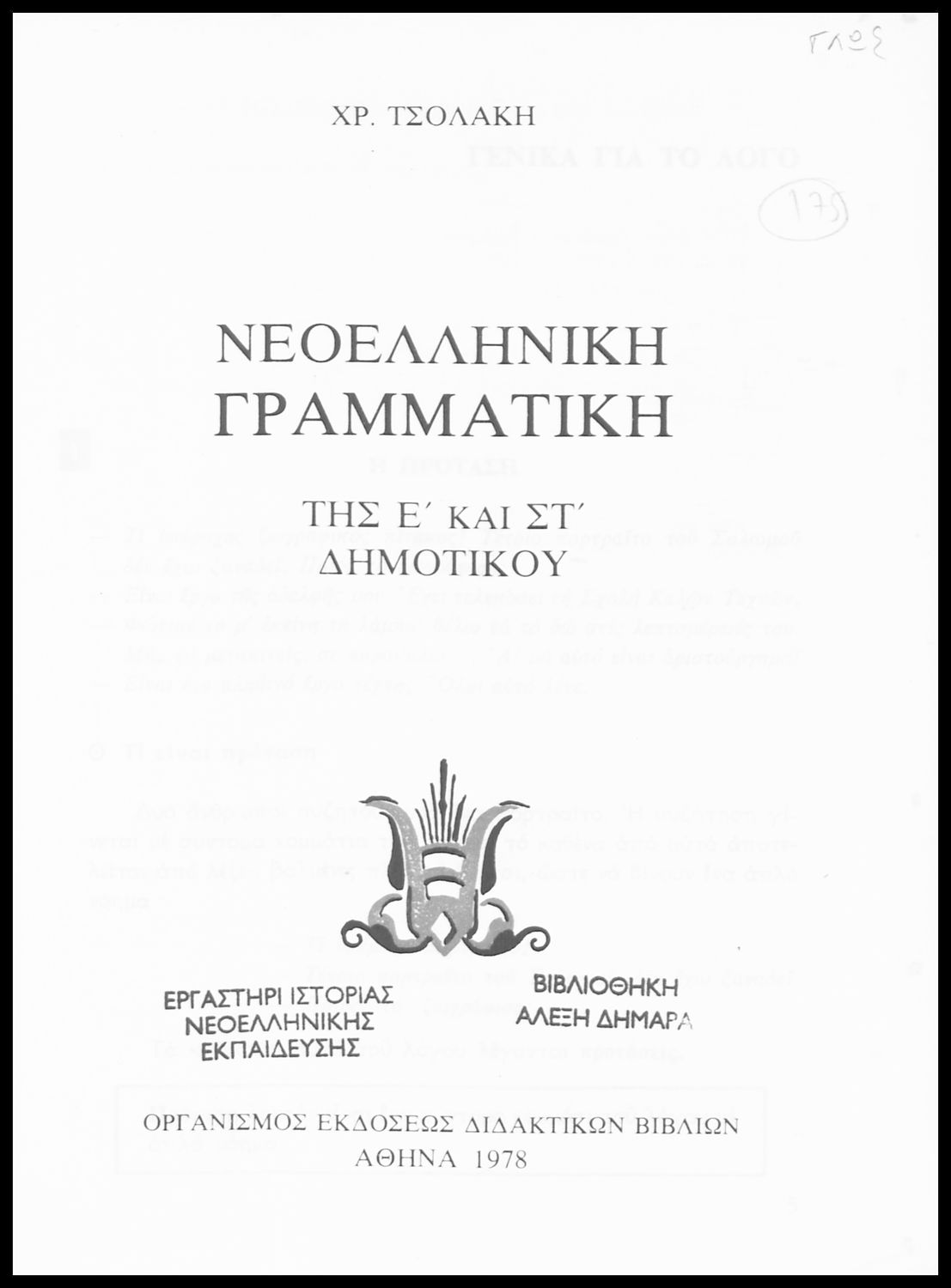 Κωδικός αναγνώρισης: 05-00175 Τίτλος: Νεοελληνική γραμματική της Ε΄ και ΣΤ΄ Δημοτικού Συγγραφέας: Χρ. Τσολάκης Εικονογράφος: Αναστ. Μουσταφέλλος Μέγεθος και υπόστρωμα: Σχολικό εγχειρίδιο, σκληρό εξώφυλλο, 303 σελίδες. Εξώφυλλο (έγχρωμο), σκίτσα (έγχρωμα). |