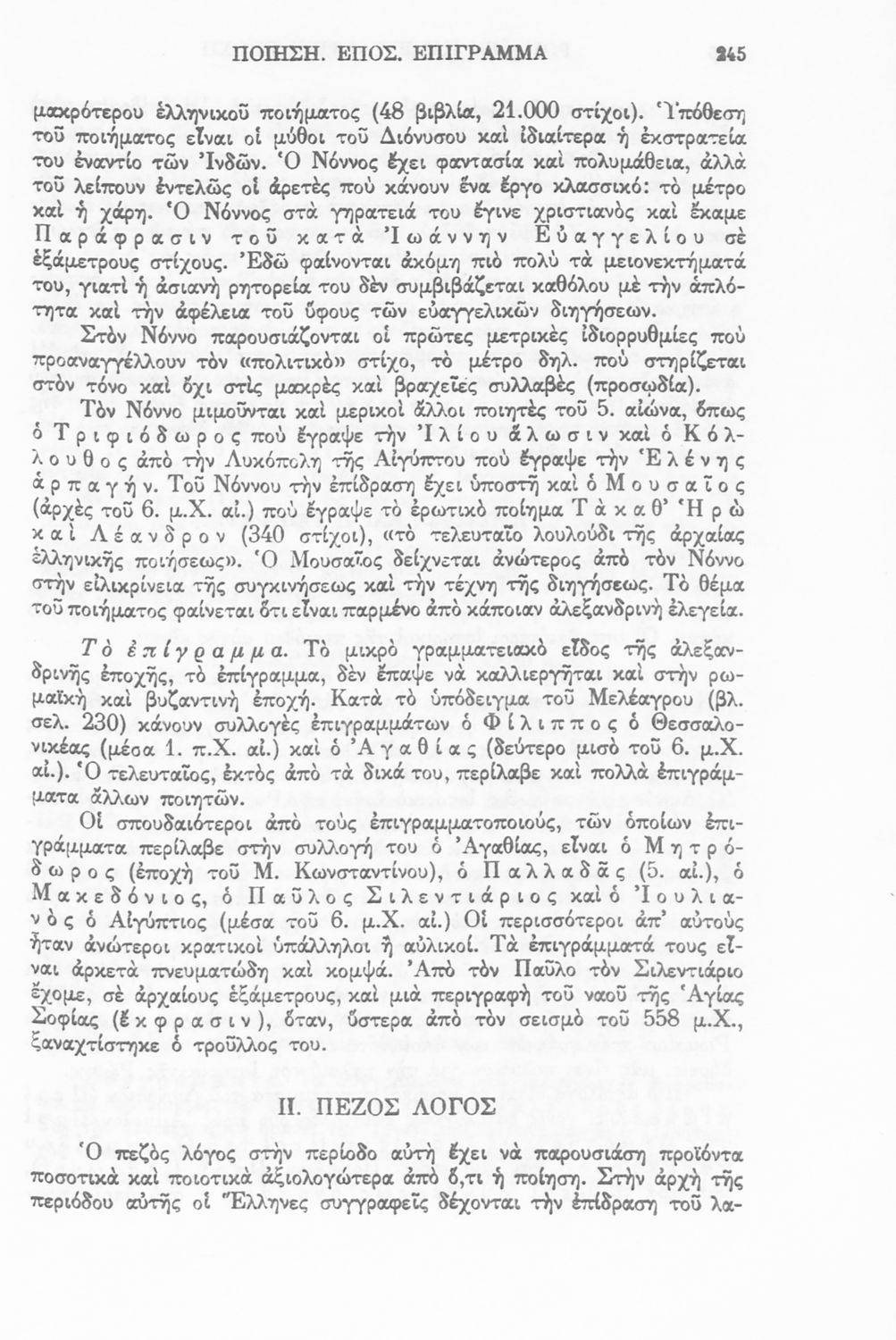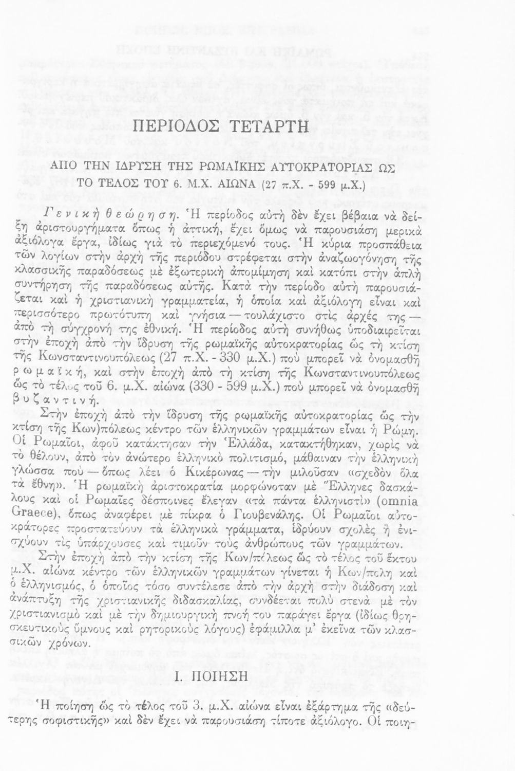 Επιστημονικό σύγγραμμα που εξετάζει την εξέλιξη της ποίησης και του πεζού λόγου κατά την Αρχαϊκή, Κλασσική, Αλεξανδρινή και Ρωμαϊκή και Βυζαντινή περίοδο.