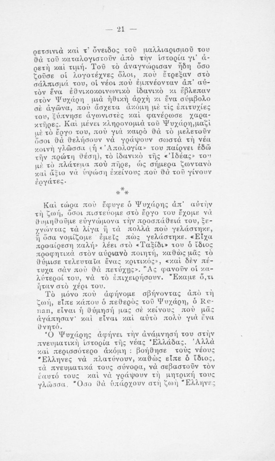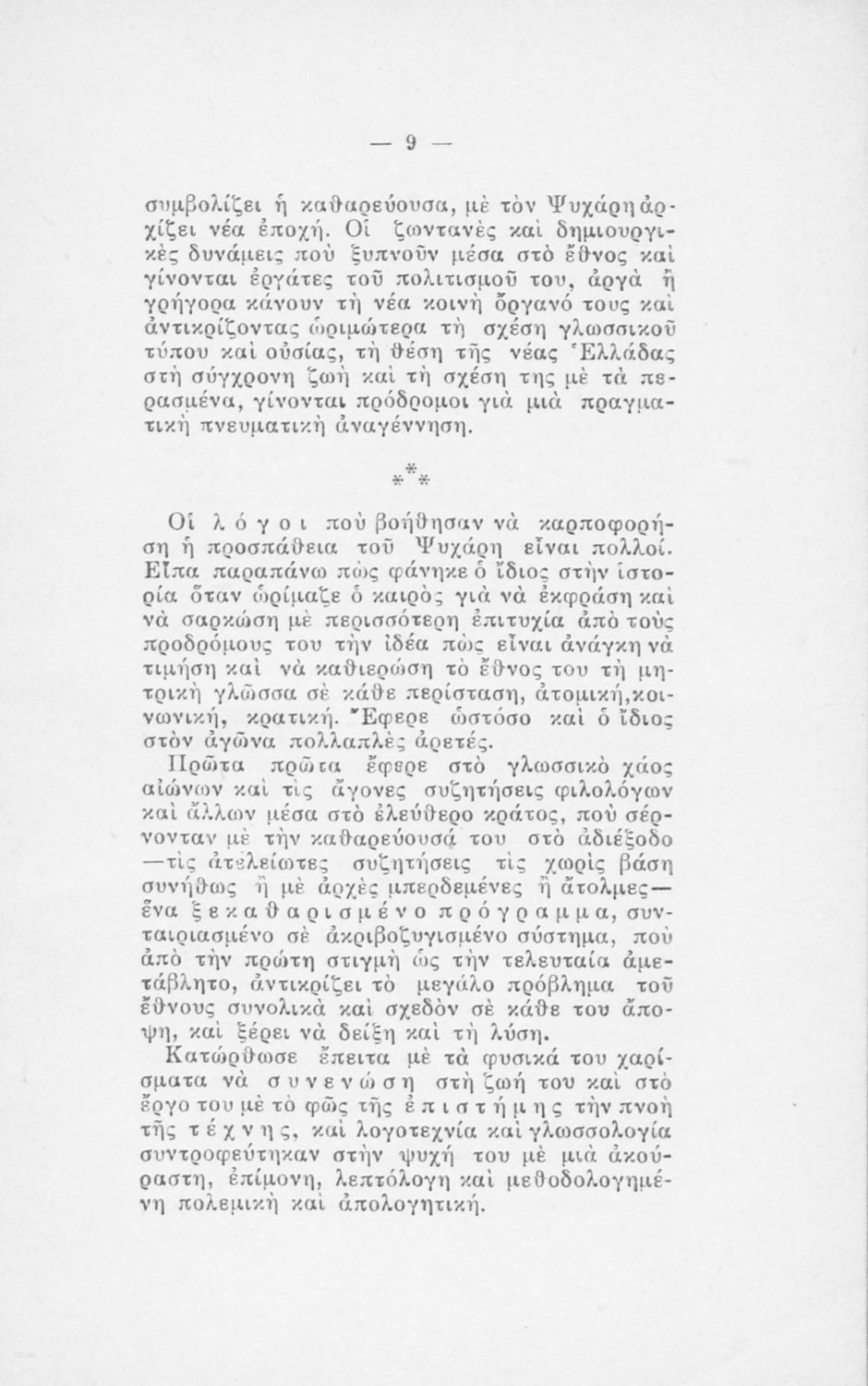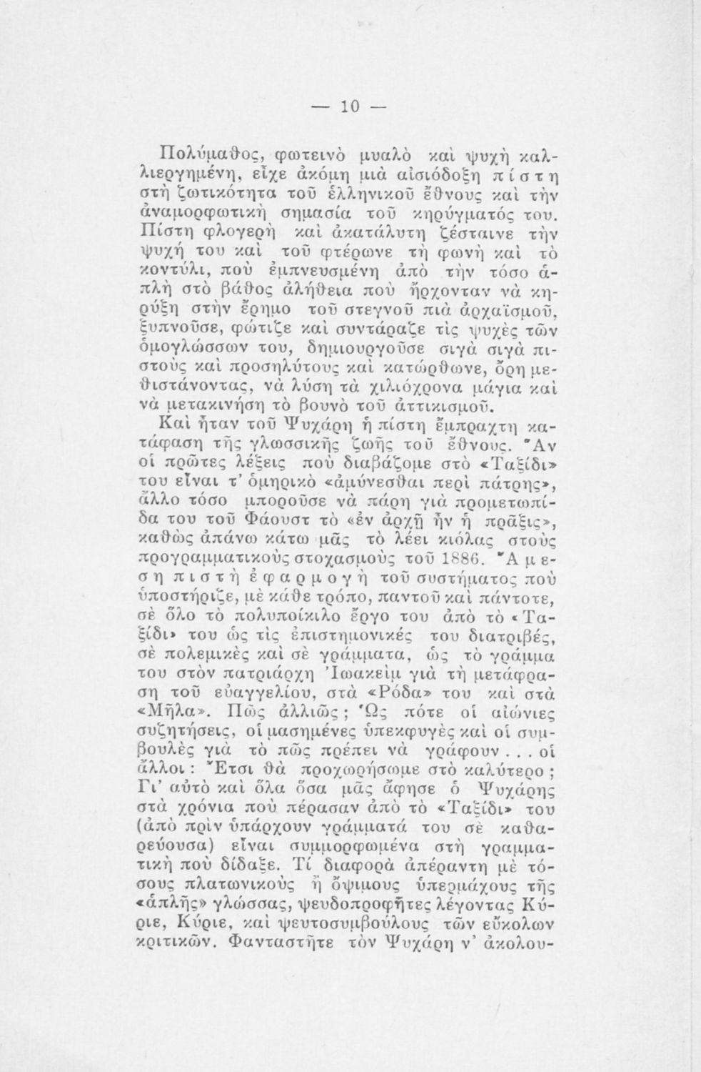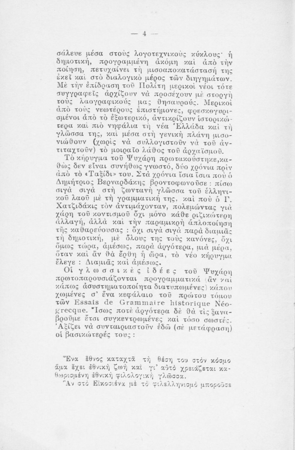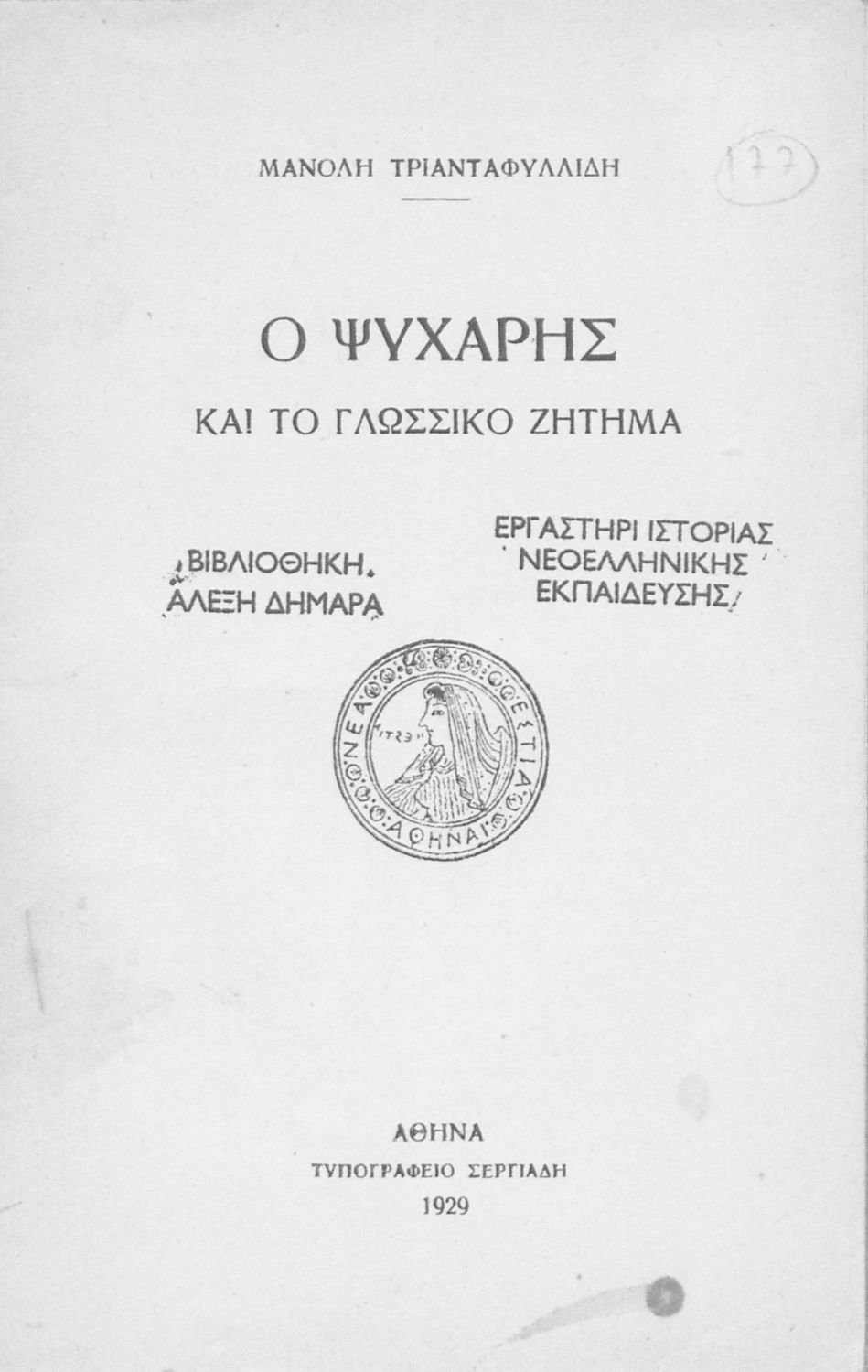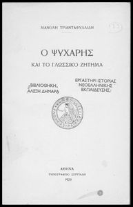 Γλώσσα: Δημοτική με στοιχεία καθαρεύουσας Παρουσίαση περιεχομένου: Ανατύπωση άρθρου του Μανόλη Τριανταφυλλίδη στη Νέα Εστία το οποίο αποτελεί μια αποτίμηση των απόψεων του Ψυχάρη για το γλωσσικό ζήτημα και της επίδρασής τους στο κίνημα του δημοτικισμού. |