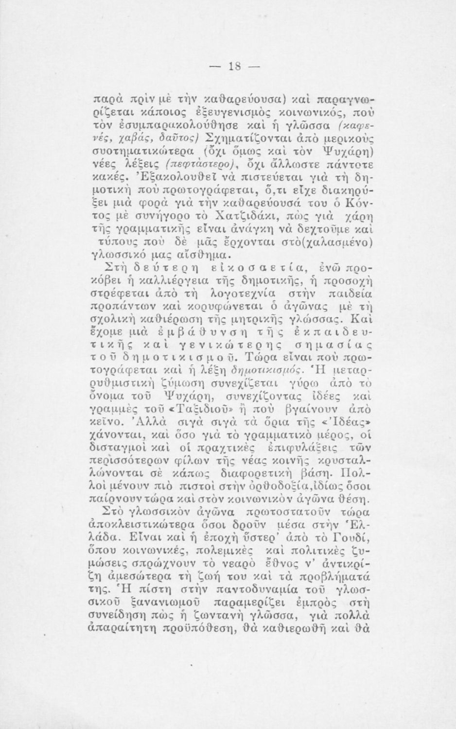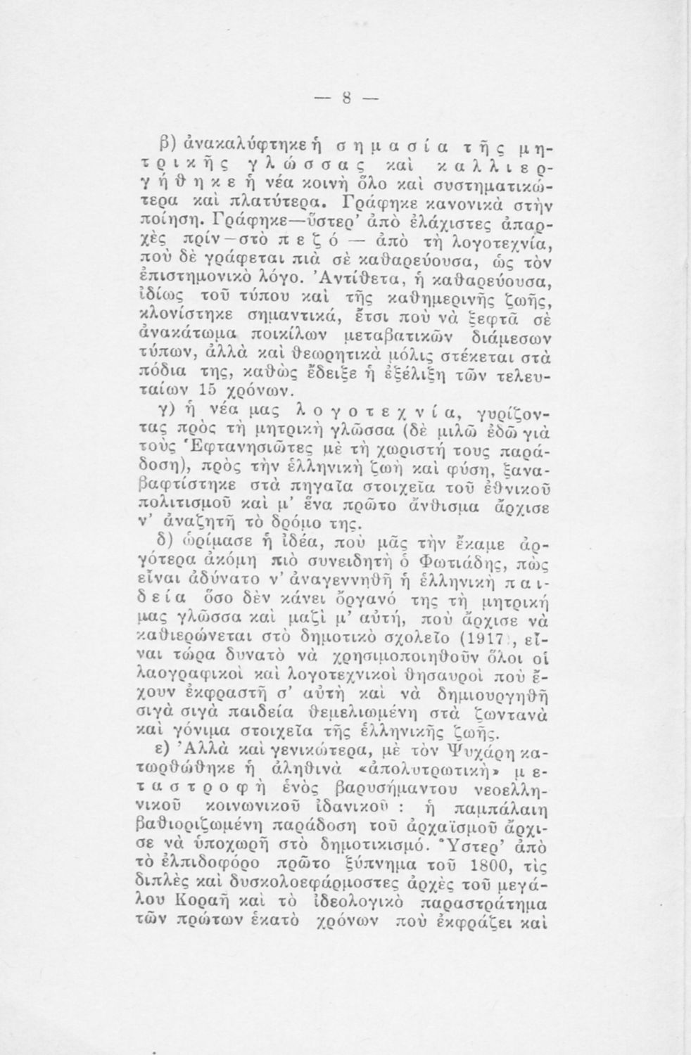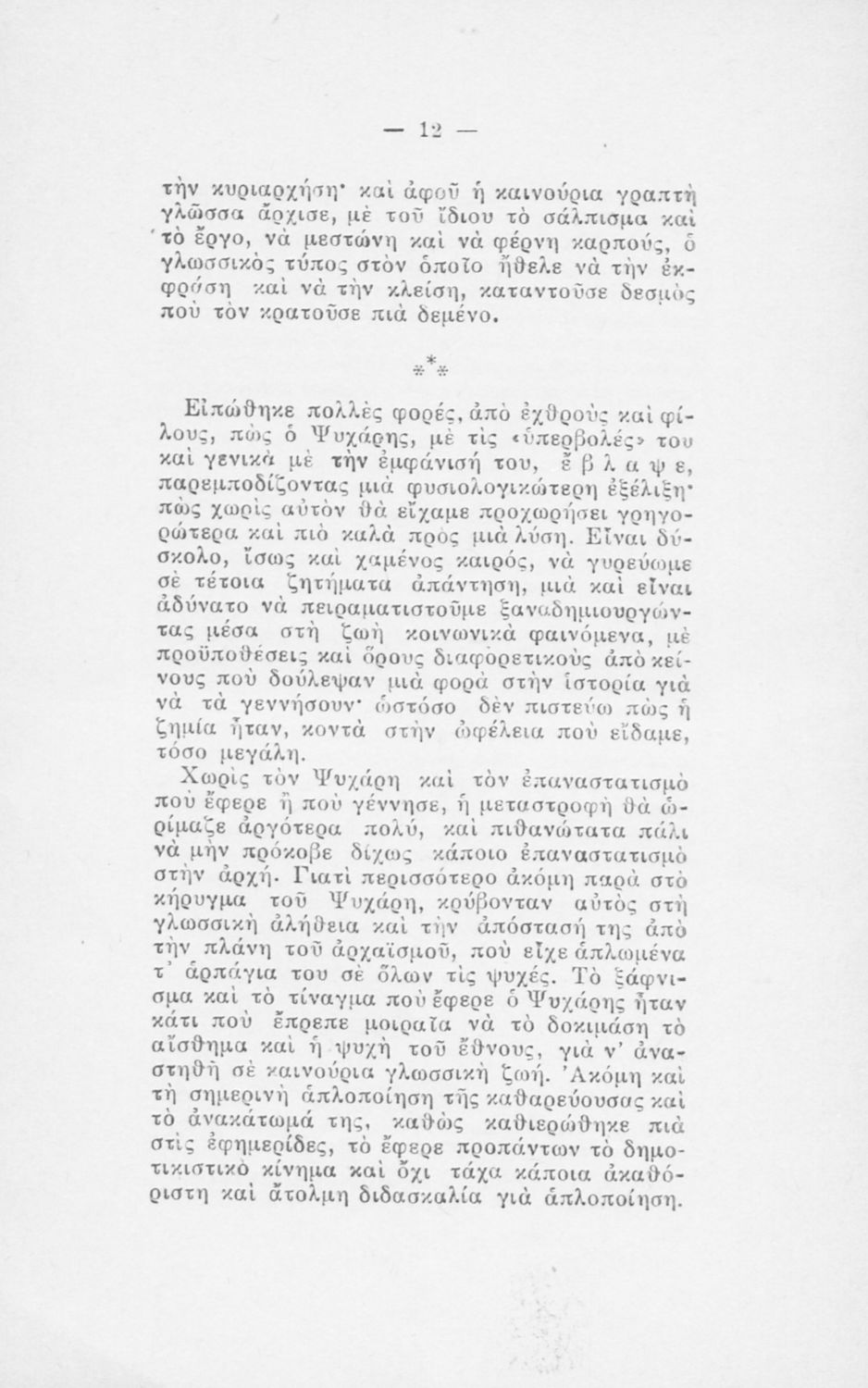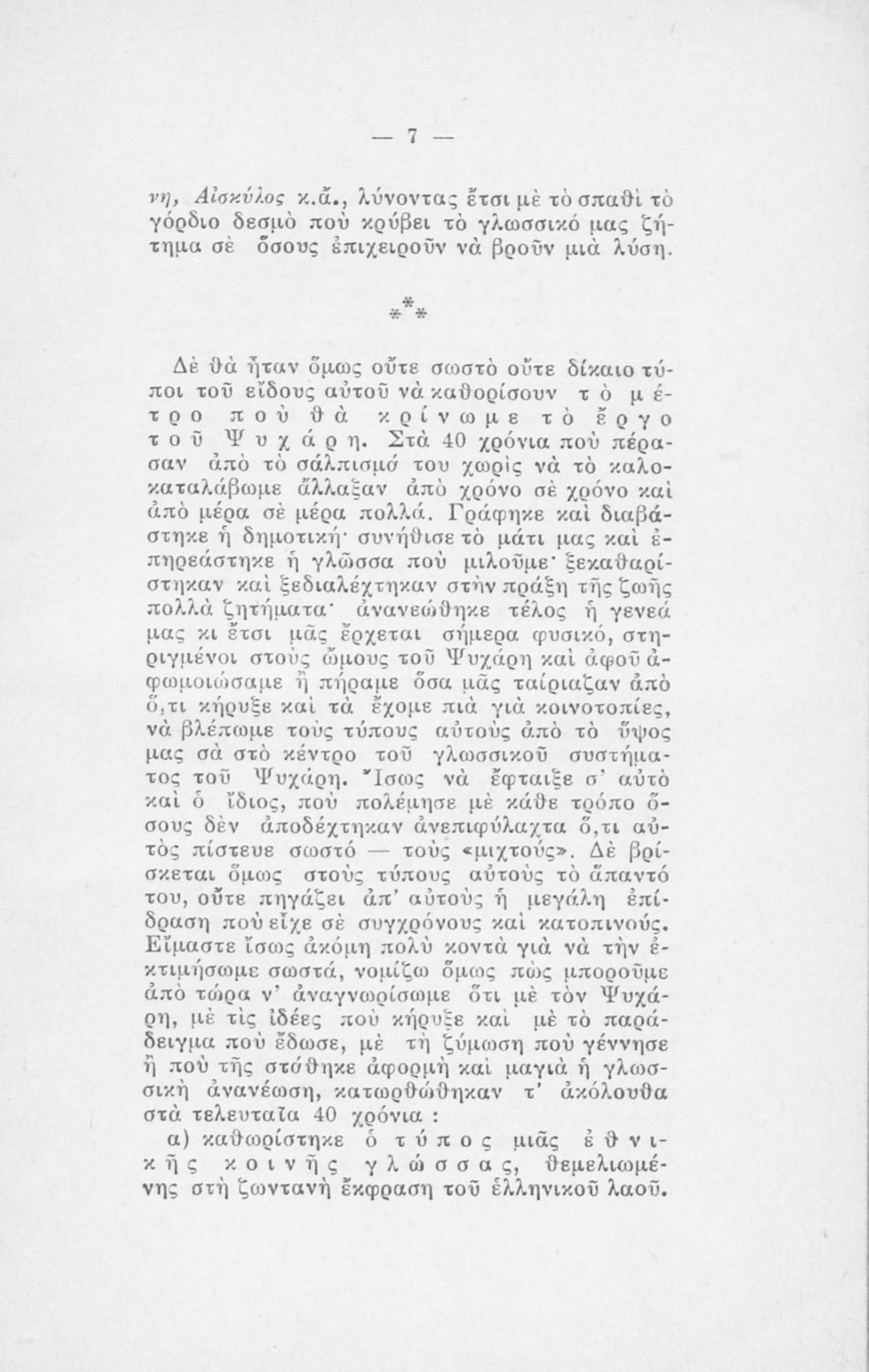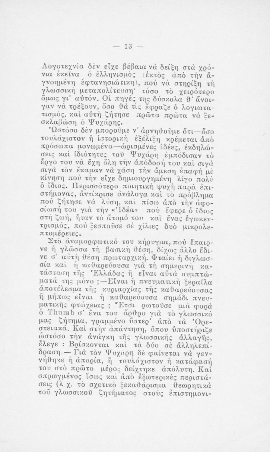 Γλώσσα: Δημοτική με στοιχεία καθαρεύουσας Παρουσίαση περιεχομένου: Ανατύπωση άρθρου του Μανόλη Τριανταφυλλίδη στη Νέα Εστία το οποίο αποτελεί μια αποτίμηση των απόψεων του Ψυχάρη για το γλωσσικό ζήτημα και της επίδρασής τους στο κίνημα του δημοτικισμού. |