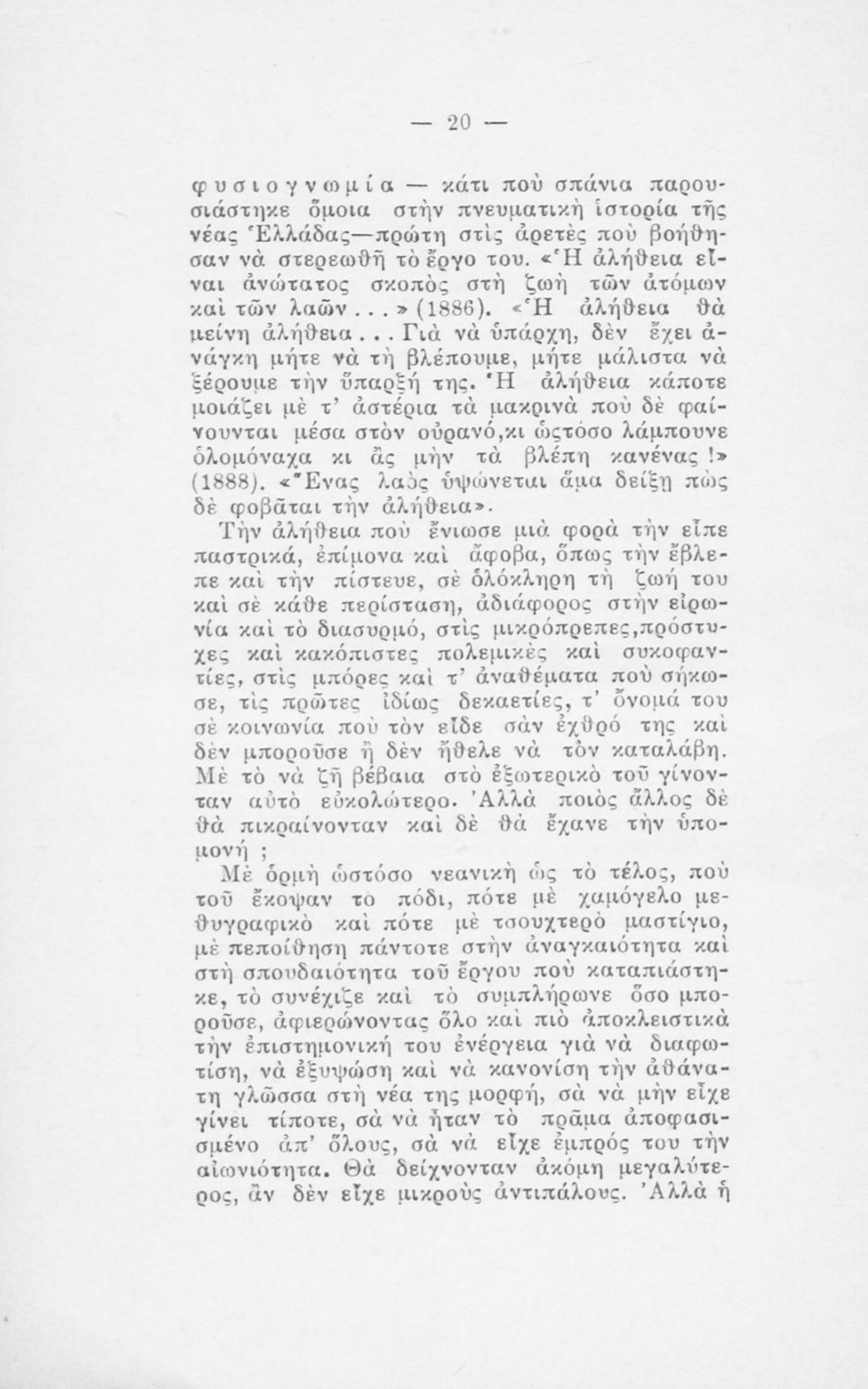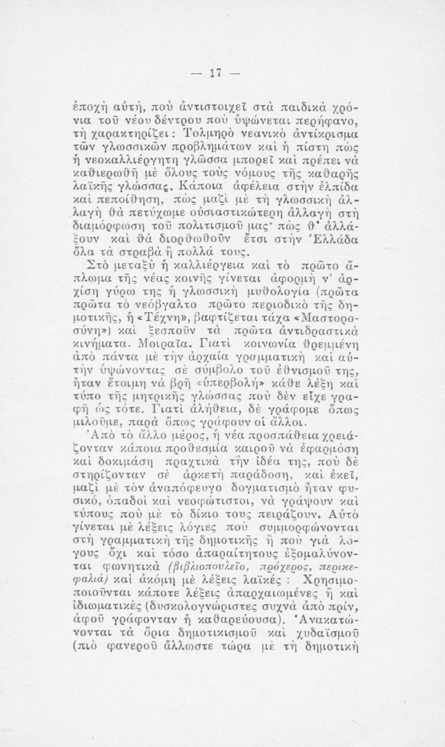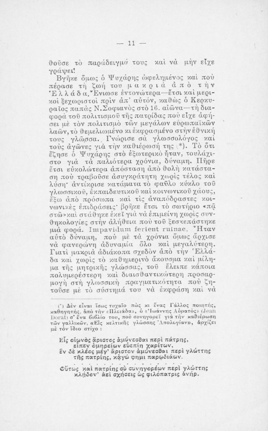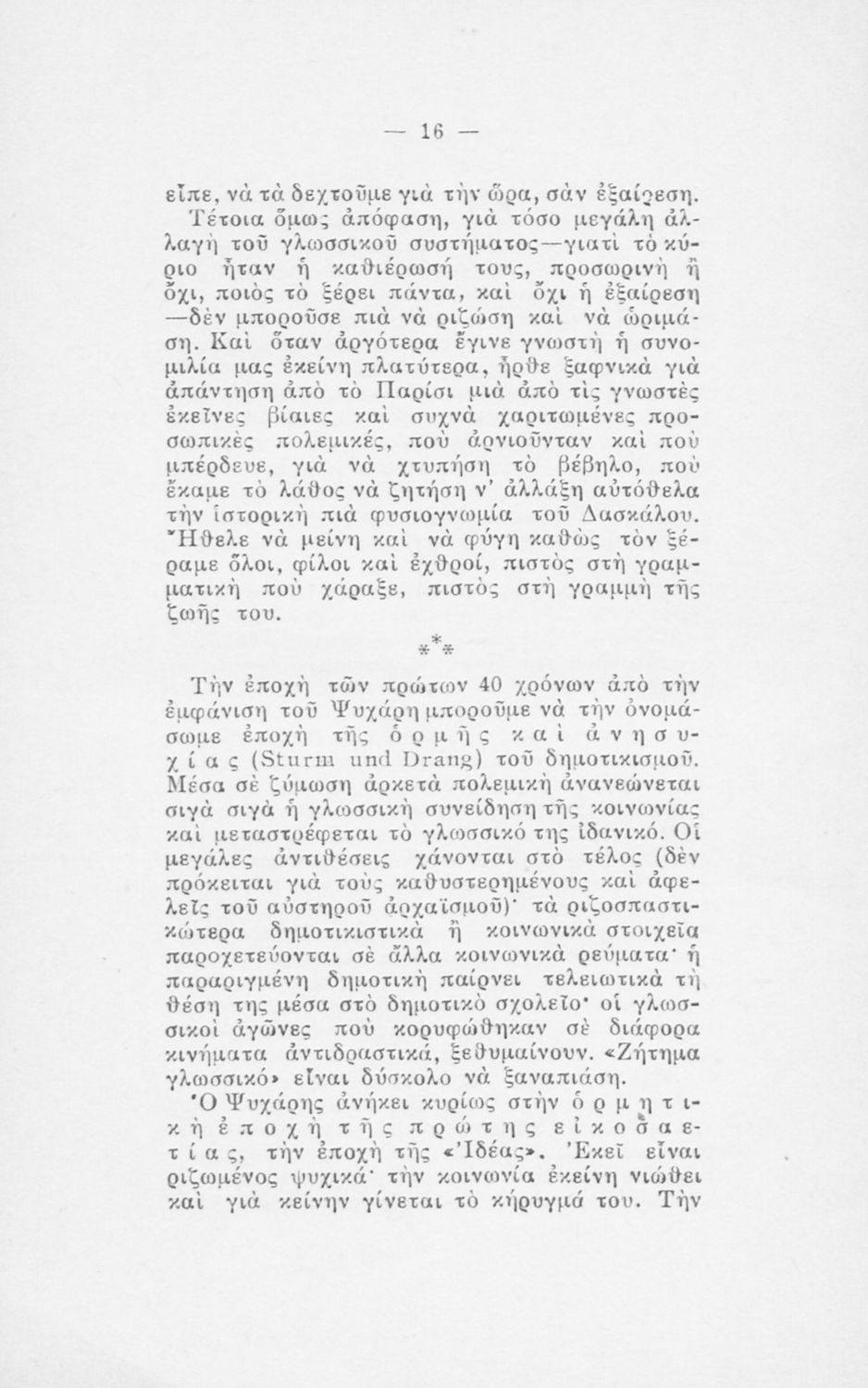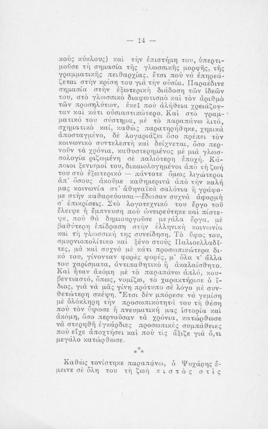 Γλώσσα: Δημοτική με στοιχεία καθαρεύουσας Παρουσίαση περιεχομένου: Ανατύπωση άρθρου του Μανόλη Τριανταφυλλίδη στη Νέα Εστία το οποίο αποτελεί μια αποτίμηση των απόψεων του Ψυχάρη για το γλωσσικό ζήτημα και της επίδρασής τους στο κίνημα του δημοτικισμού. |
