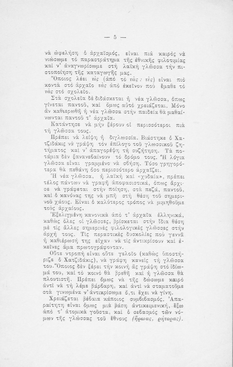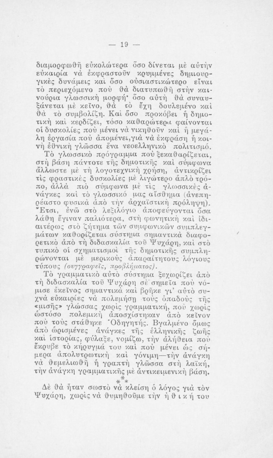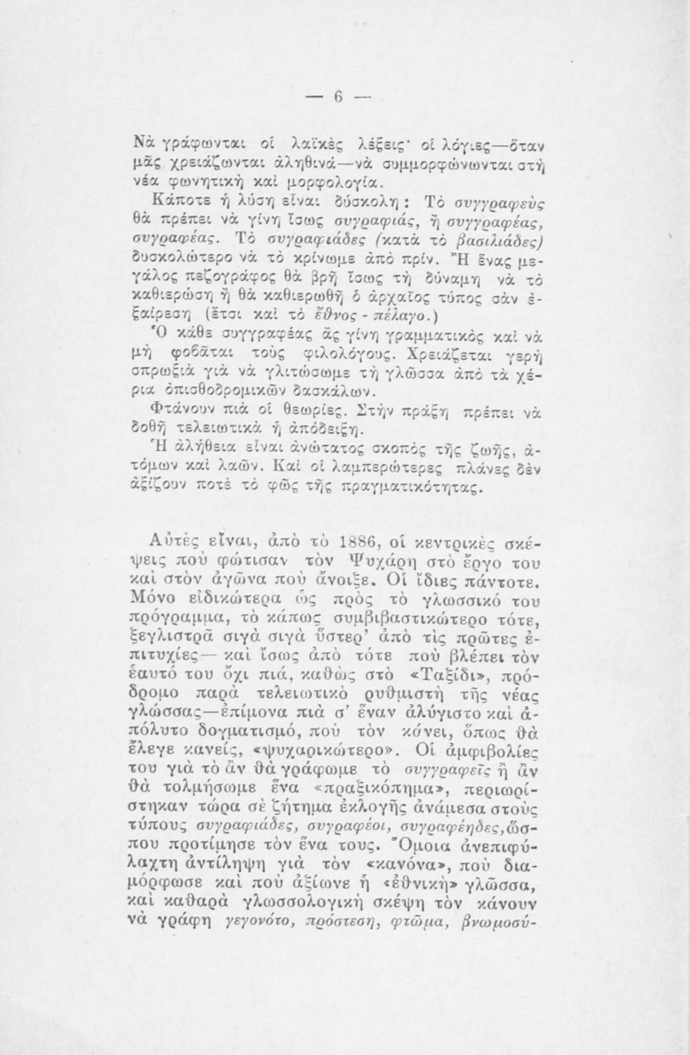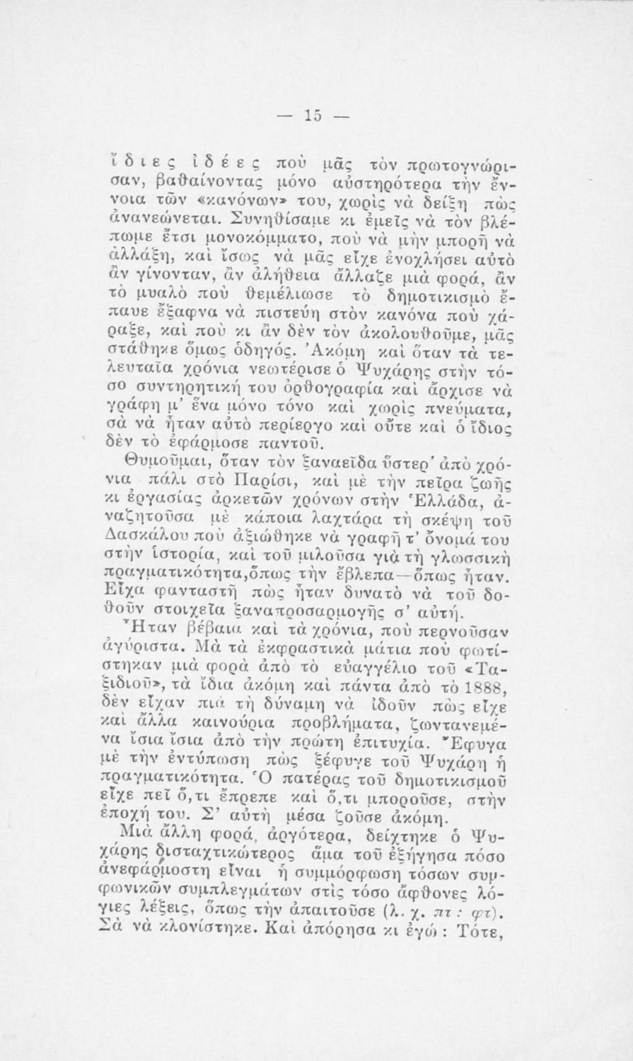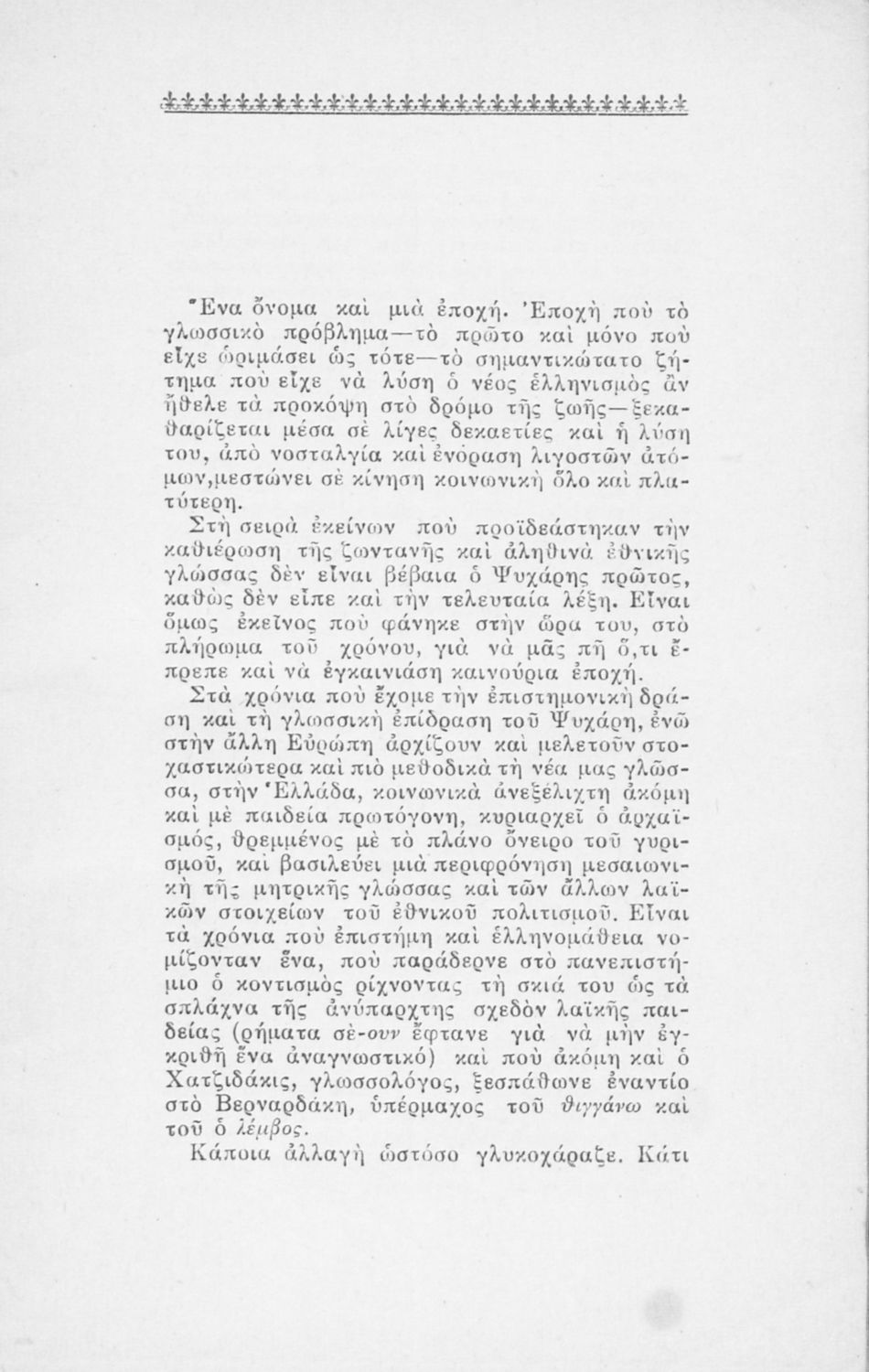 Ανατύπωση άρθρου του Μανόλη Τριανταφυλλίδη στη Νέα Εστία το οποίο αποτελεί μια αποτίμηση των απόψεων του Ψυχάρη για το γλωσσικό ζήτημα και της επίδρασής τους στο κίνημα του δημοτικισμού.