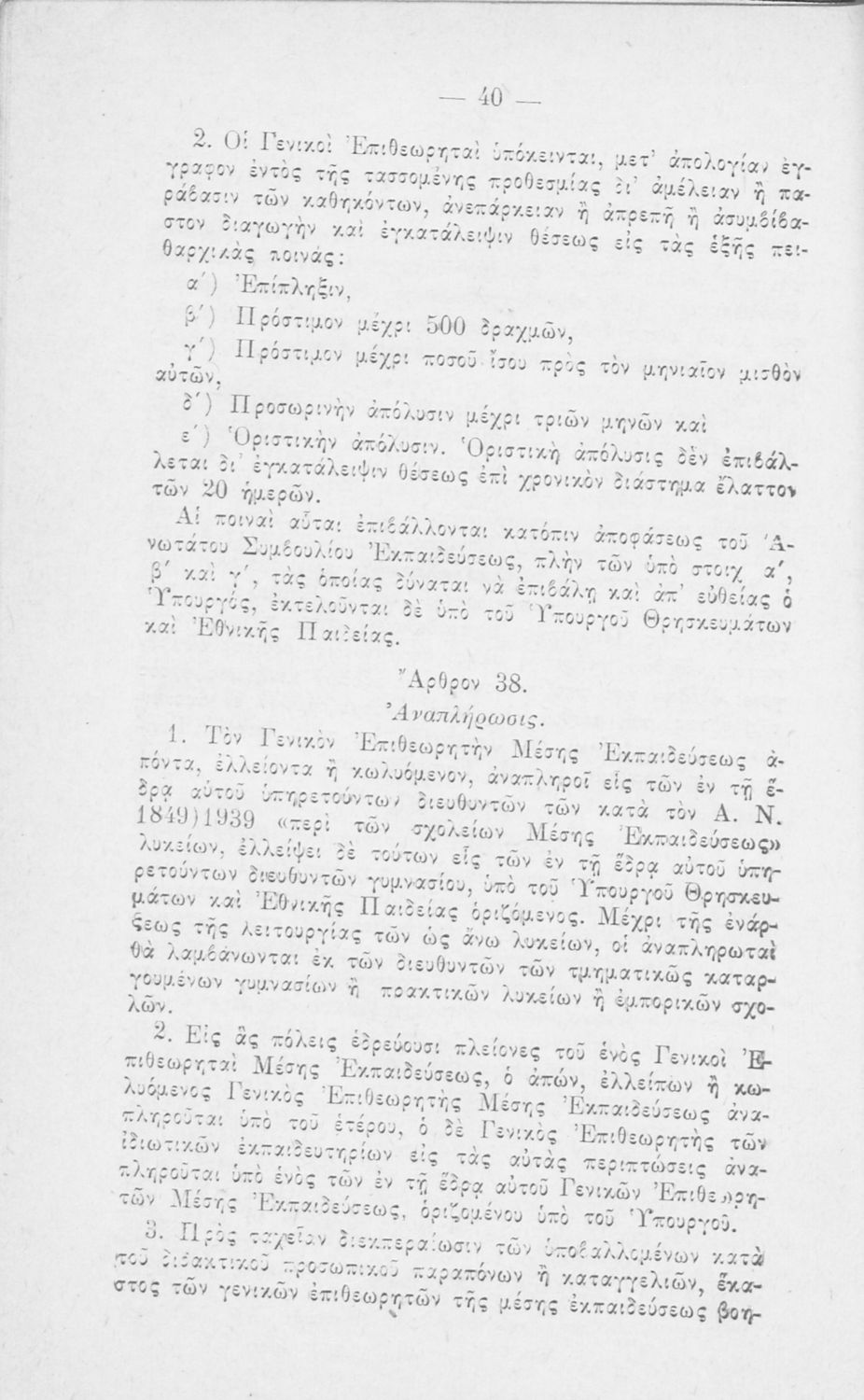 Έκδοση του Υπουργείου Θρησκευμάτων και Εθνικής Παιδείας με οδηγίες προς τις εκπαιδευτικές αρχές για τον τρόπο άσκησης διοίκησης στην Στοιχειώδη και Μέση Εκπαίδευση. Περιλαμβάνει τον Α.Ν. 2180/1940, ΦΕΚ 14 Α, 12-1-1940.