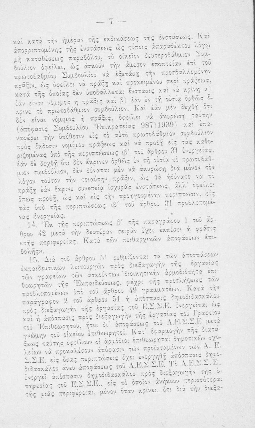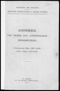 Παρουσίαση περιεχομένου: Έκδοση του Υπουργείου Θρησκευμάτων και Εθνικής Παιδείας με οδηγίες προς τις εκπαιδευτικές αρχές για τον τρόπο άσκησης διοίκησης στην Στοιχειώδη και Μέση Εκπαίδευση. Περιλαμβάνει τον Α.Ν. 2180/1940, ΦΕΚ 14 Α, 12-1-1940.