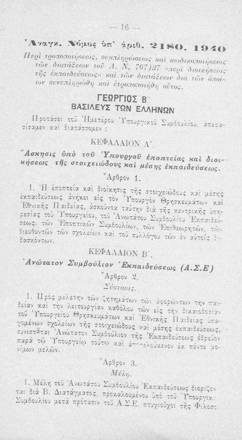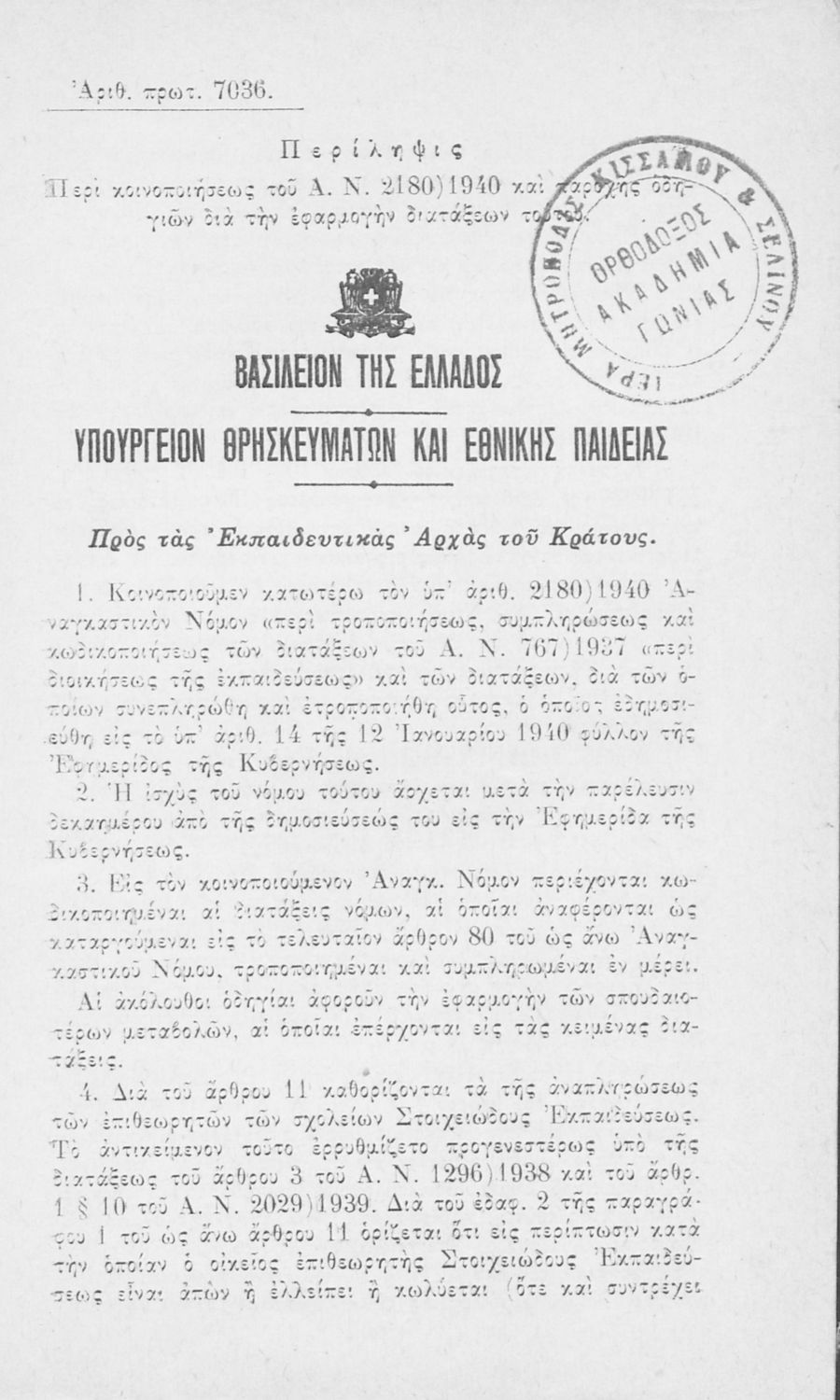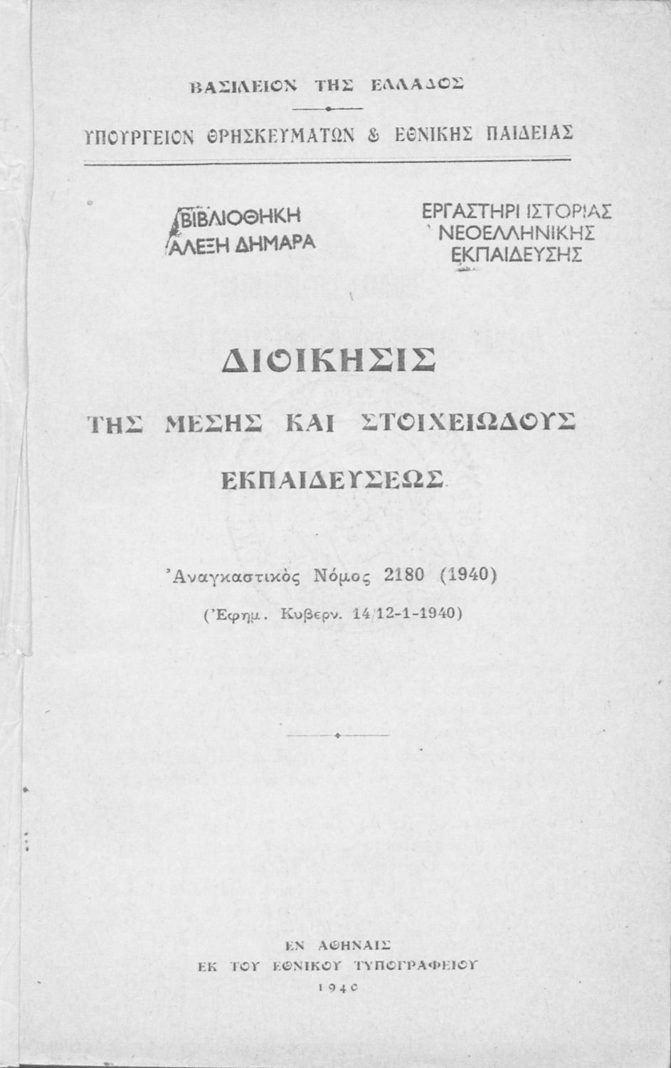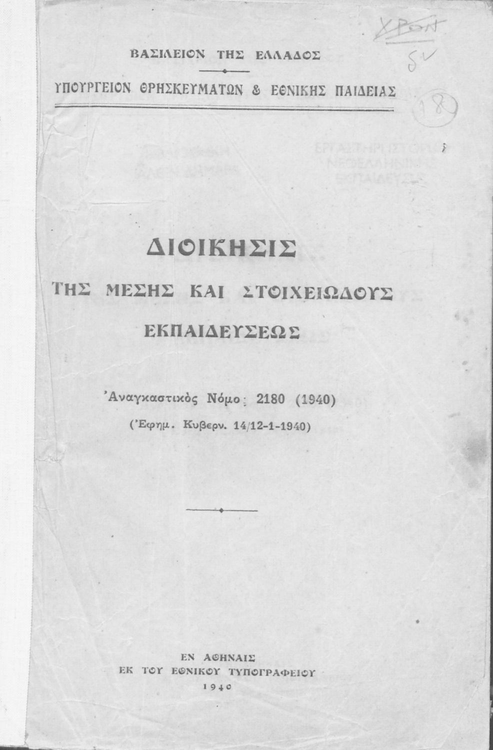 Έκδοση του Υπουργείου Θρησκευμάτων και Εθνικής Παιδείας με οδηγίες προς τις εκπαιδευτικές αρχές για τον τρόπο άσκησης διοίκησης στην Στοιχειώδη και Μέση Εκπαίδευση. Περιλαμβάνει τον Α.Ν. 2180/1940, ΦΕΚ 14 Α, 12-1-1940.