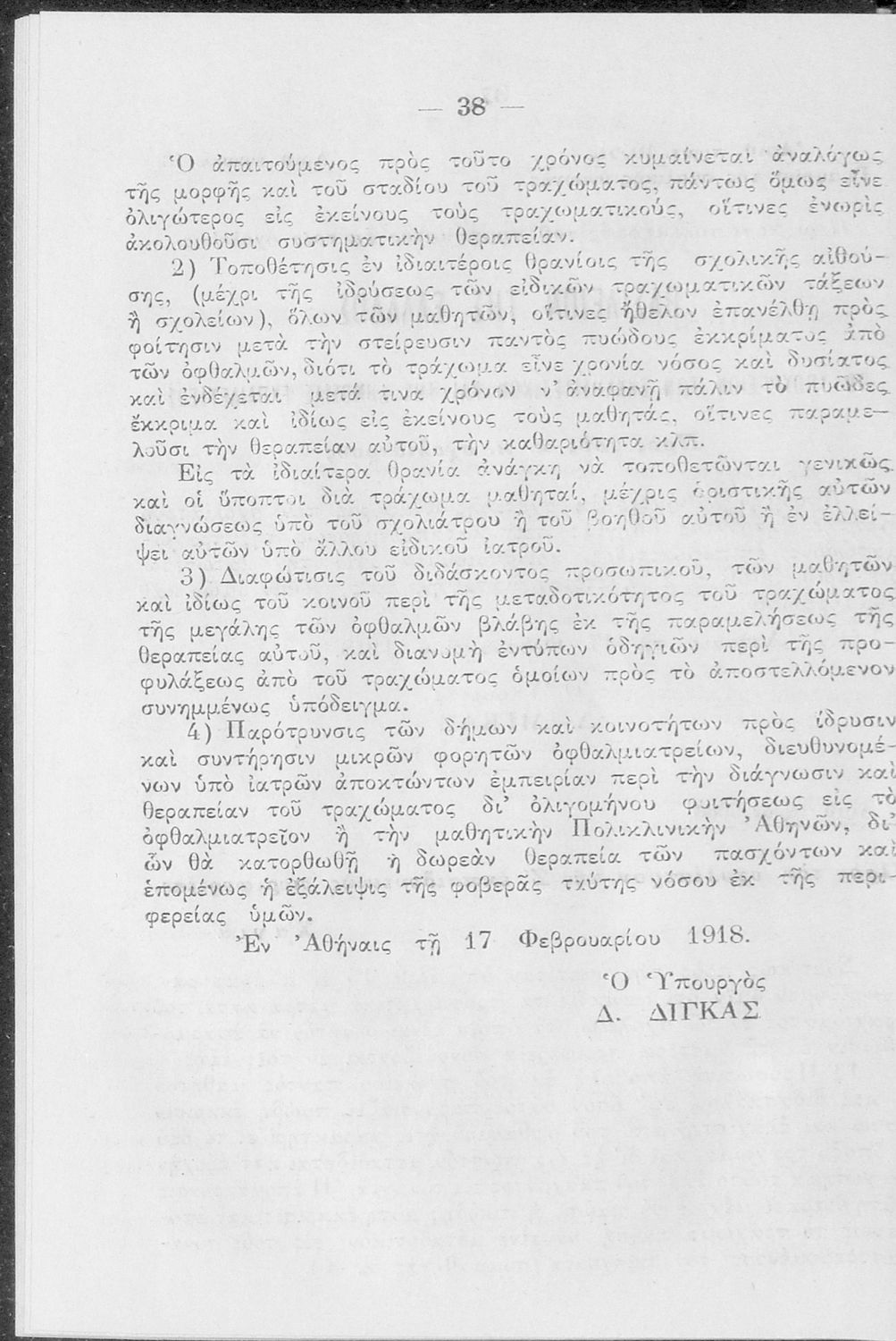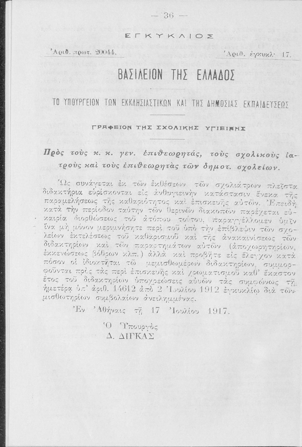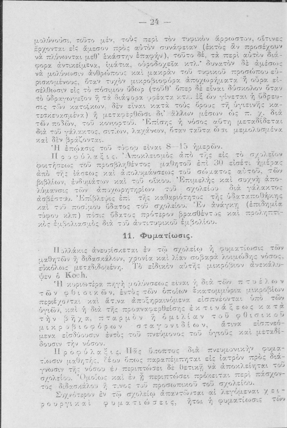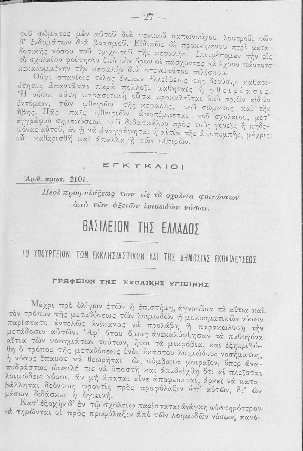 520 ## _aΈκδοση του Υπουργείου Εκκλησιαστικών και Δημοσίας Εκπαιδεύσεως που αποσκοπεί στην παροχή οδηγιών προφύλαξης από τη μετάδοση των λοιμωδών ασθενειών στα σχολεία. Περιλαμβάνει και τις σχετικές εγκυκλίους. Ο συγγραφέας ήταν τμηματάρχης Σχολικής Υγιεινής.