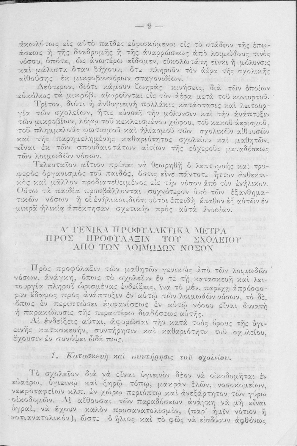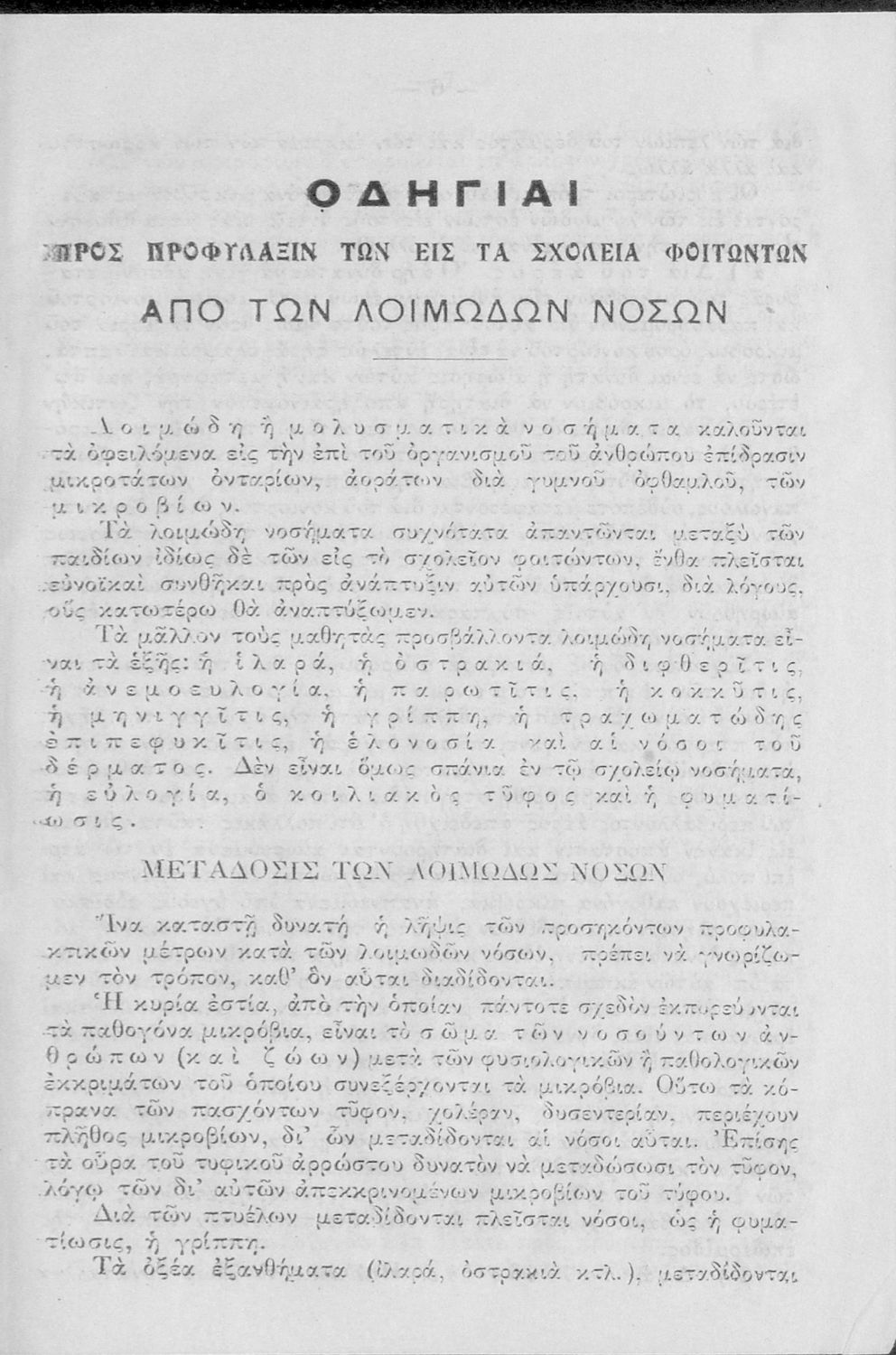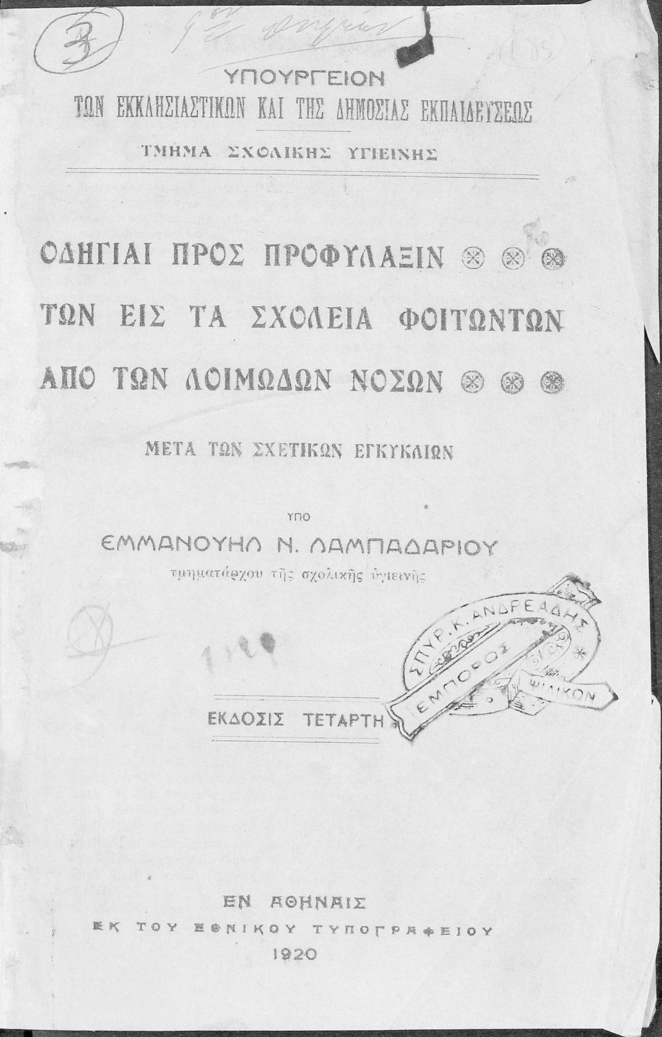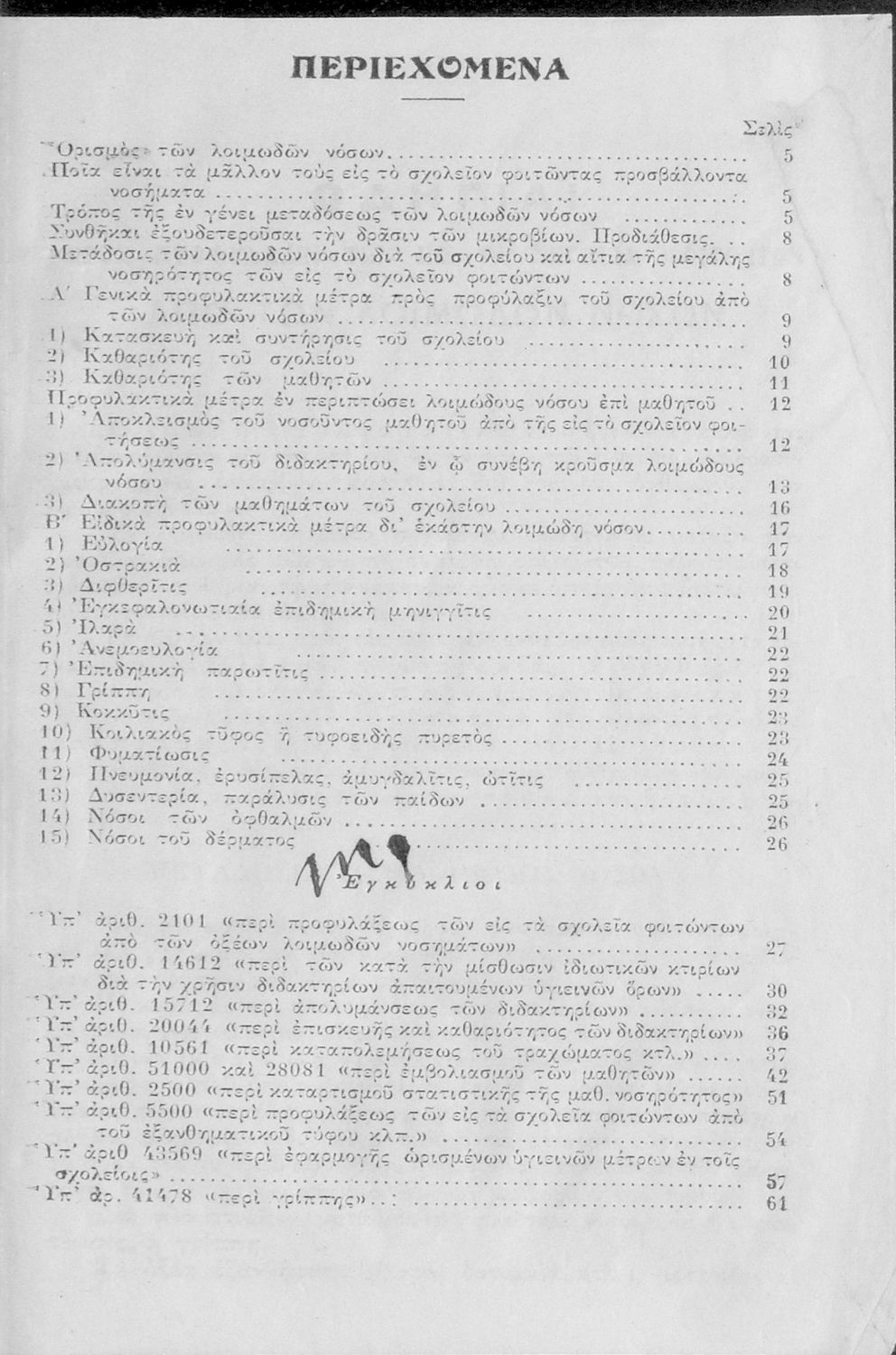 Έκδοση του Υπουργείου Εκκλησιαστικών και Δημοσίας Εκπαιδεύσεως που αποσκοπεί στην παροχή οδηγιών προφύλαξης από τη μετάδοση των λοιμωδών ασθενειών στα σχολεία. Περιλαμβάνει και τις σχετικές εγκυκλίους. Ο συγγραφέας ήταν τμηματάρχης Σχολικής Υγιεινής.