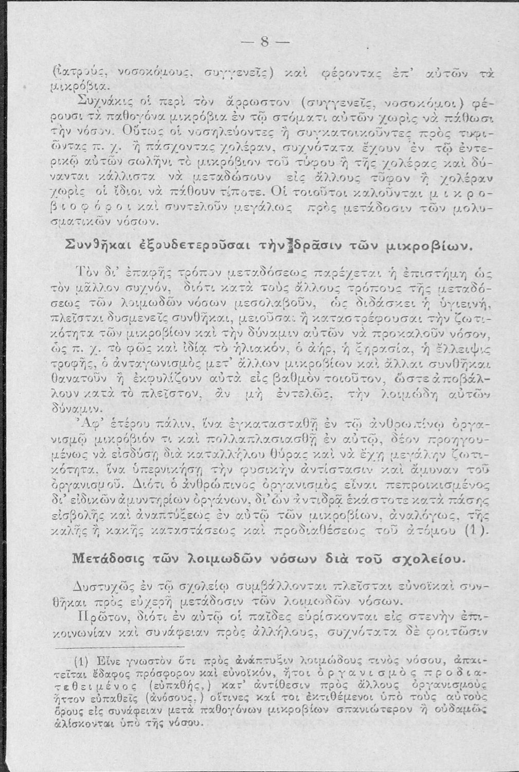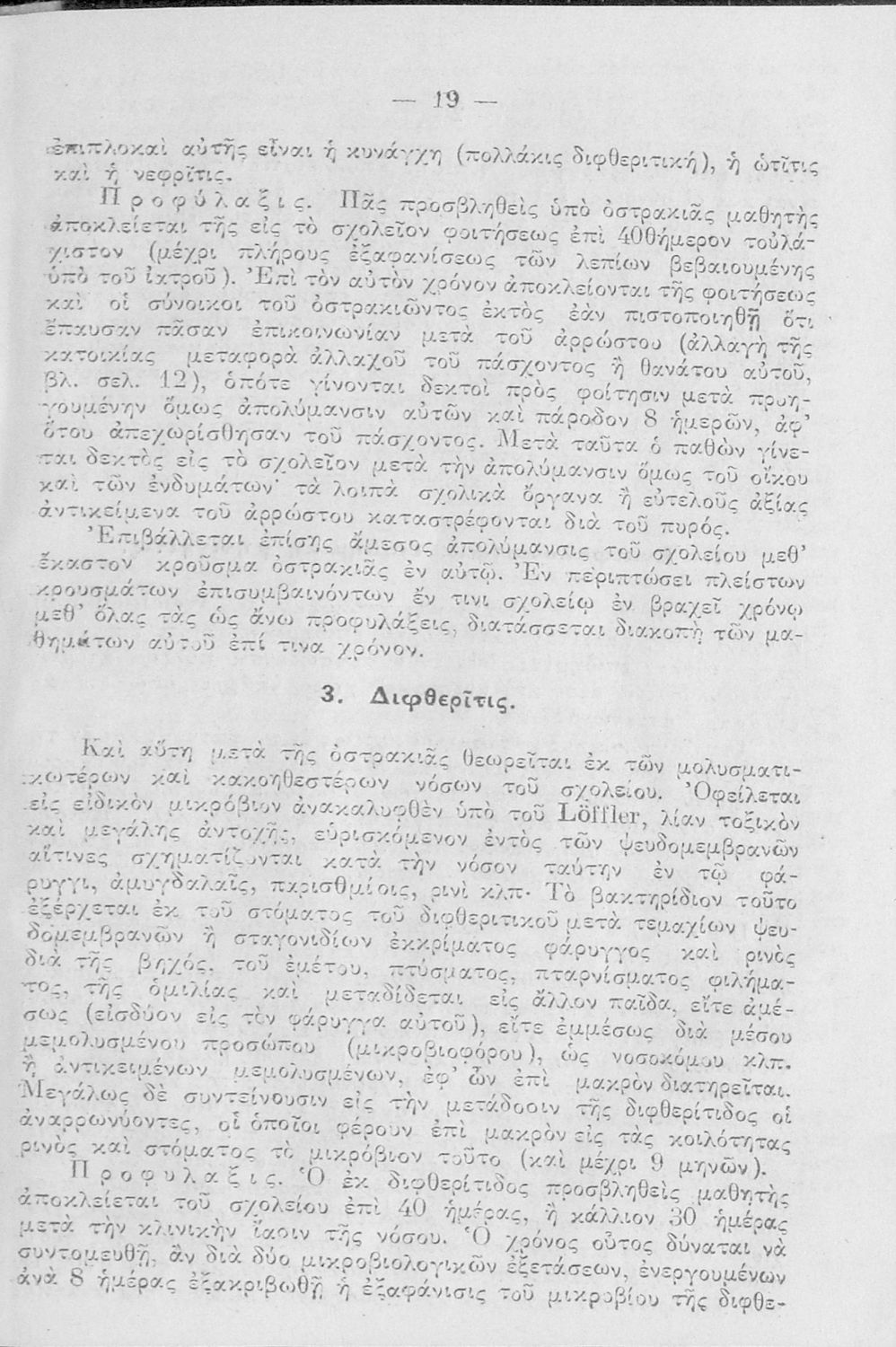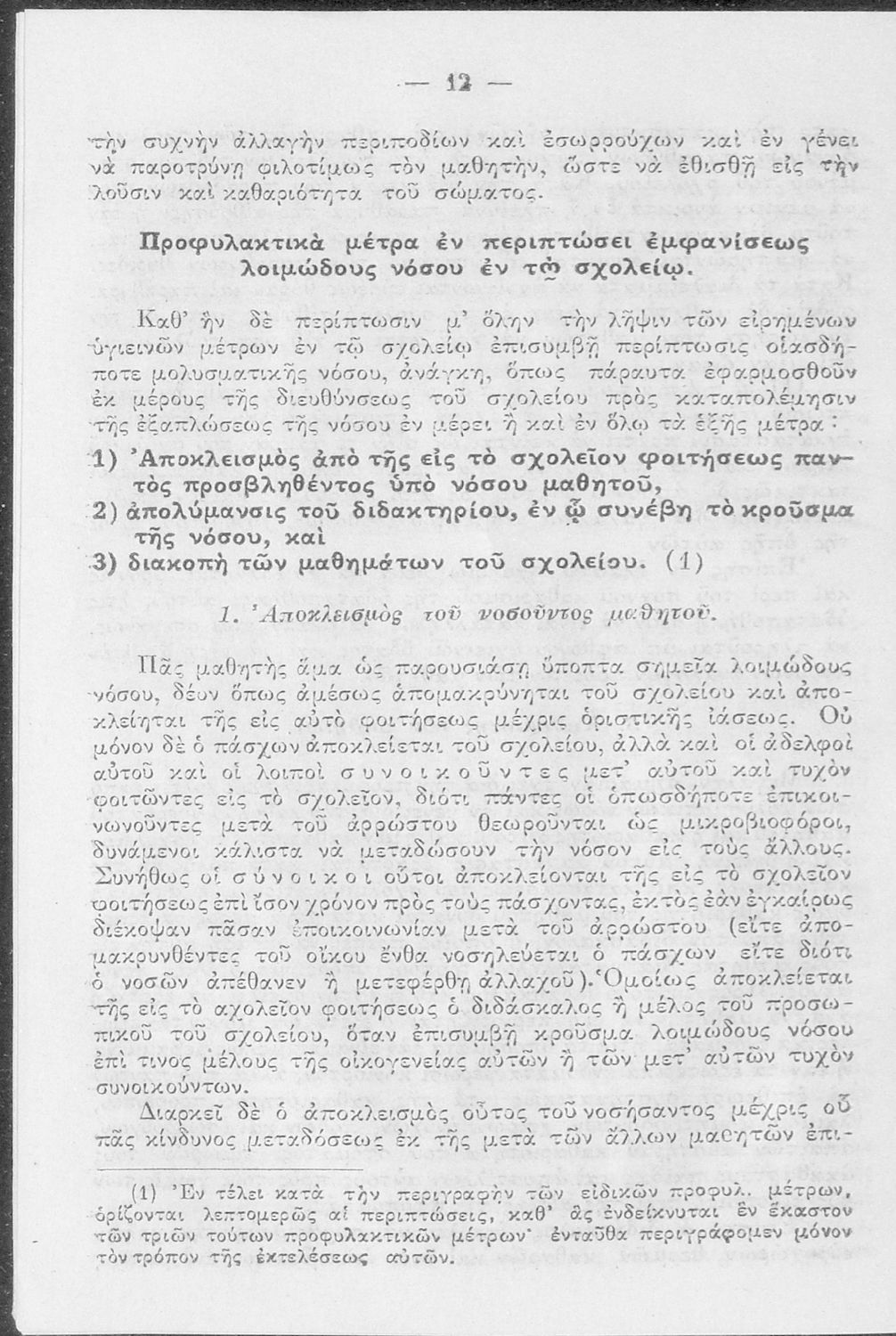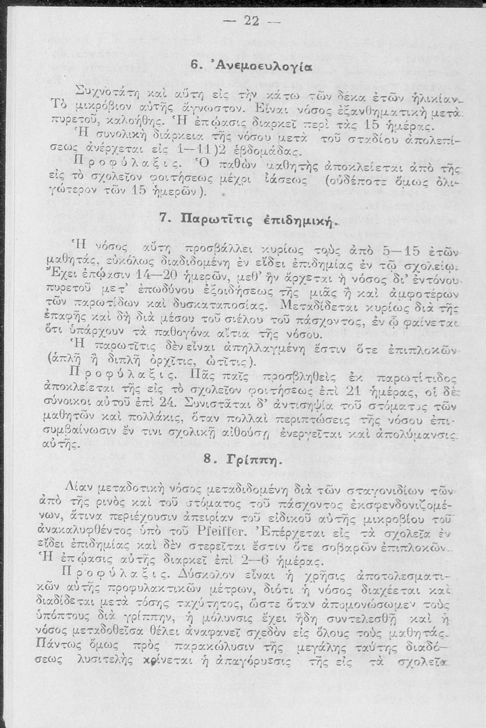 Έκδοση του Υπουργείου Εκκλησιαστικών και Δημοσίας Εκπαιδεύσεως που αποσκοπεί στην παροχή οδηγιών προφύλαξης από τη μετάδοση των λοιμωδών ασθενειών στα σχολεία. Περιλαμβάνει και τις σχετικές εγκυκλίους. Ο συγγραφέας ήταν τμηματάρχης Σχολικής Υγιεινής.