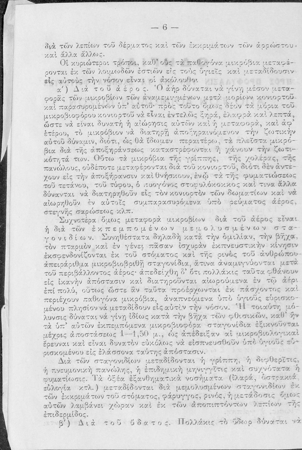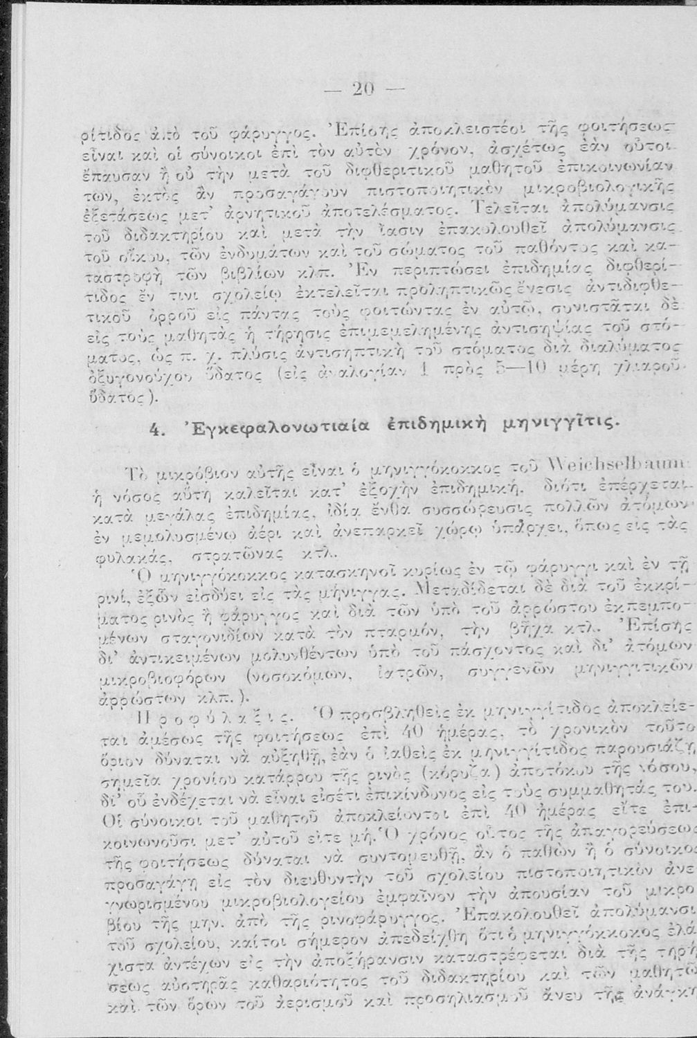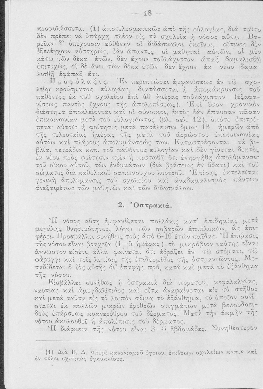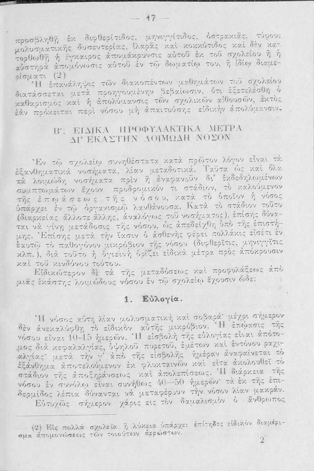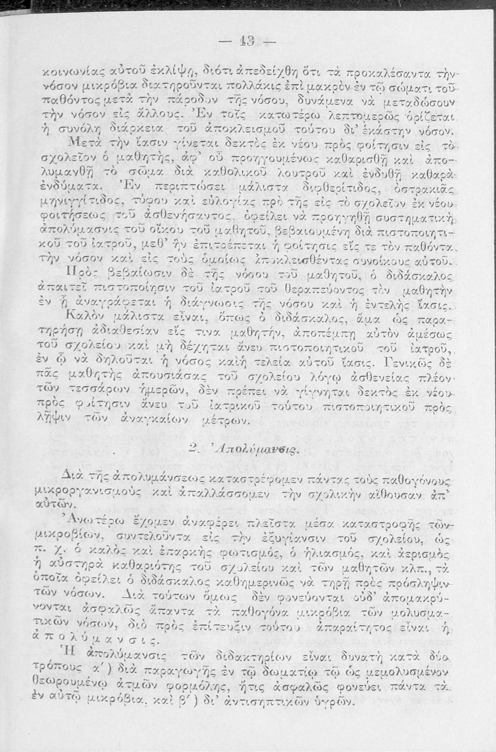 Έκδοση του Υπουργείου Εκκλησιαστικών και Δημοσίας Εκπαιδεύσεως που αποσκοπεί στην παροχή οδηγιών προφύλαξης από τη μετάδοση των λοιμωδών ασθενειών στα σχολεία. Περιλαμβάνει και τις σχετικές εγκυκλίους. Ο συγγραφέας ήταν τμηματάρχης Σχολικής Υγιεινής.