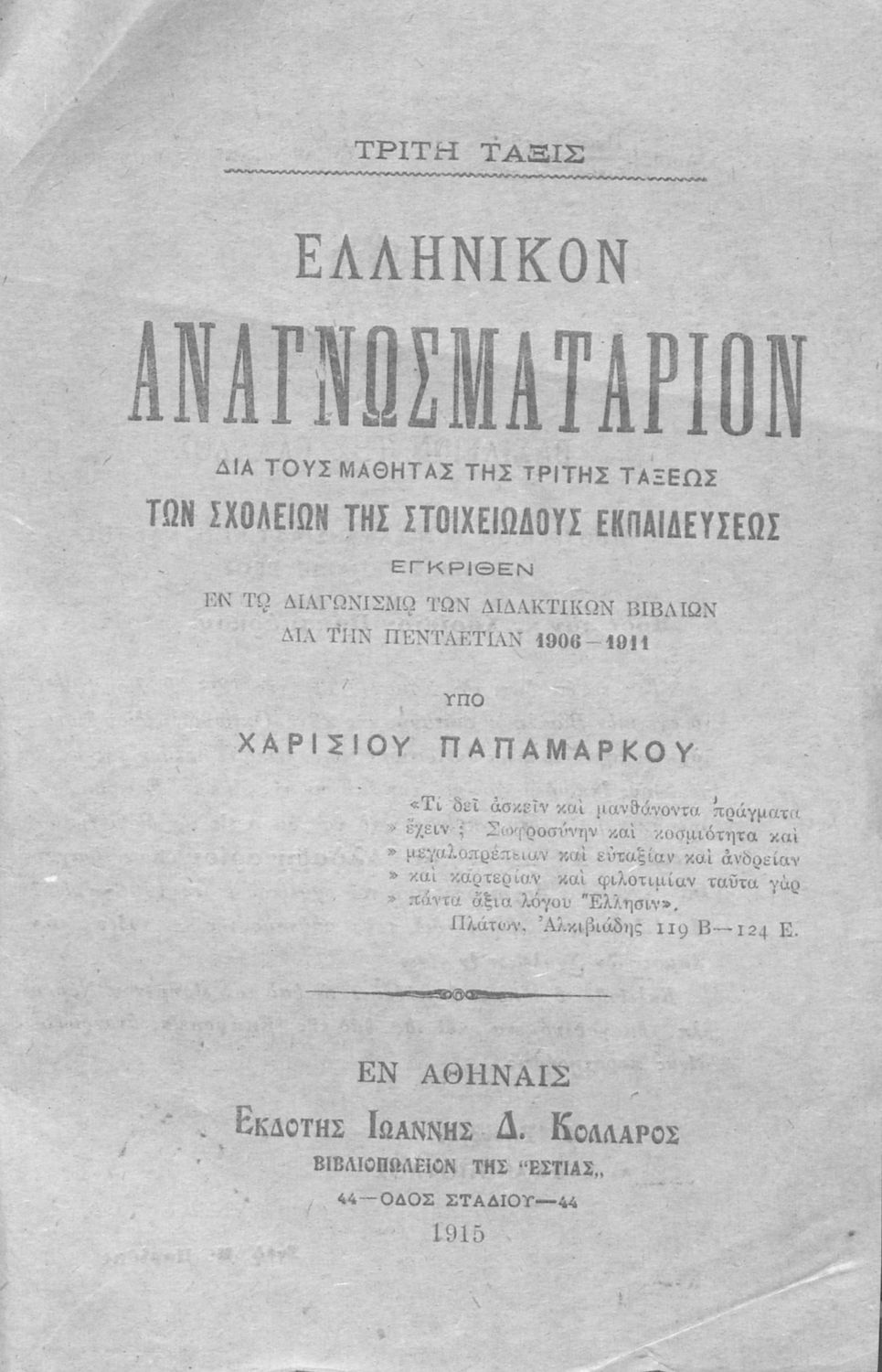 Τίτλος: Ελληνικό αλφαβητάριον εγκριθέν εν τω διαγωνισμώ των διδακτικών βιβλίων διά την πενταετίαν 1906-1911. Μέρος Α΄ . Παρασκευαστικόν της απταίστου αναγνώσεως
