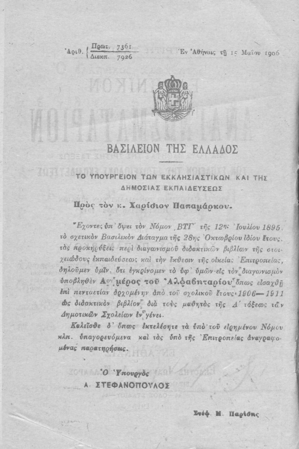 Ελληνικό αλφαβητάριον εγκριθέν εν τω διαγωνισμώ των διδακτικών βιβλίων διά την πενταετίαν 1906-1911. Μέρος Α΄ . Παρασκευαστικόν της απταίστου αναγνώσεως
