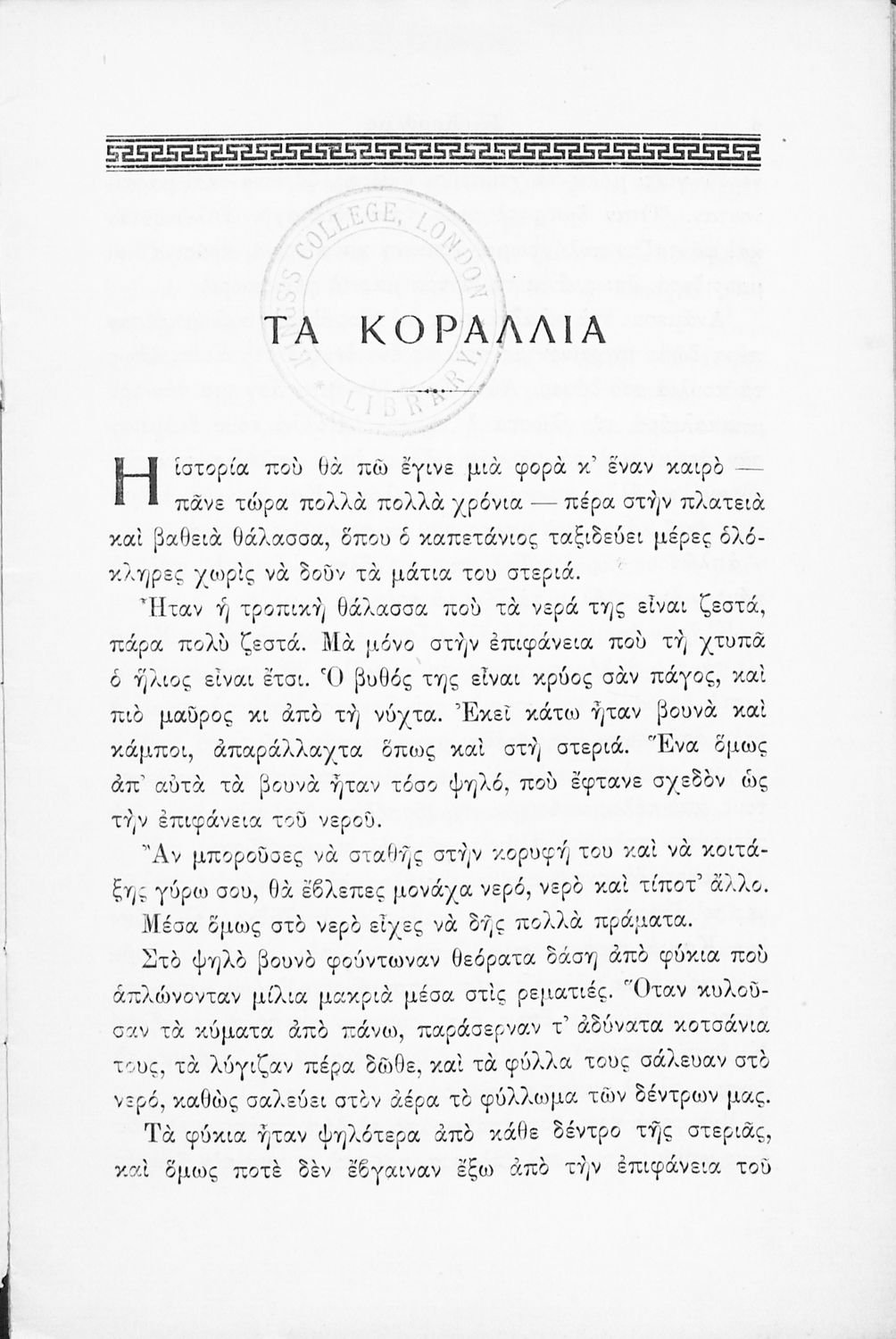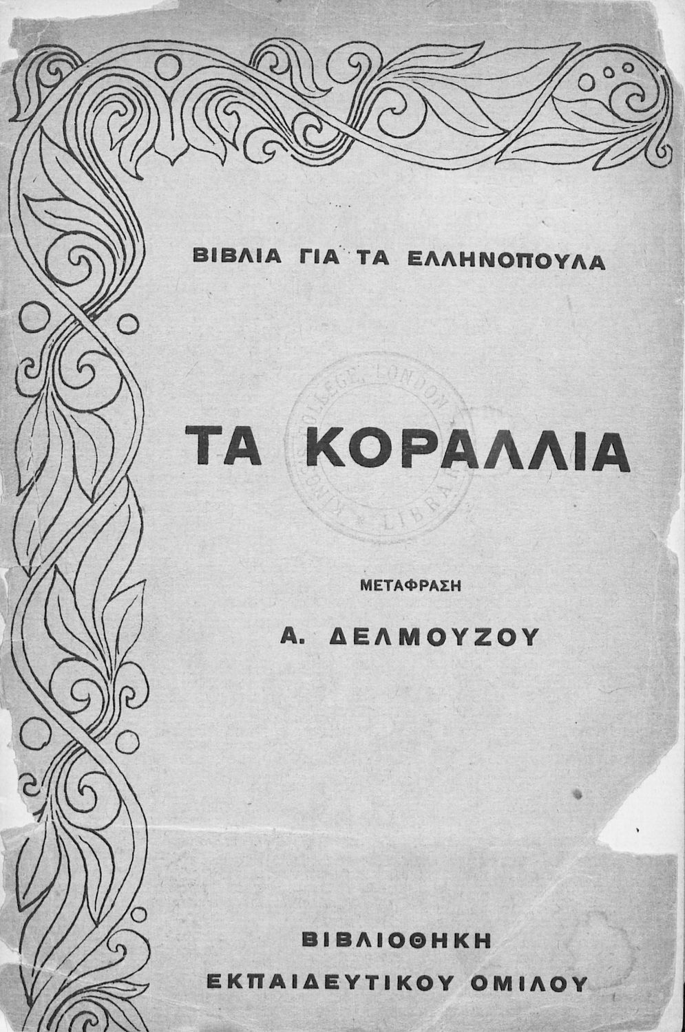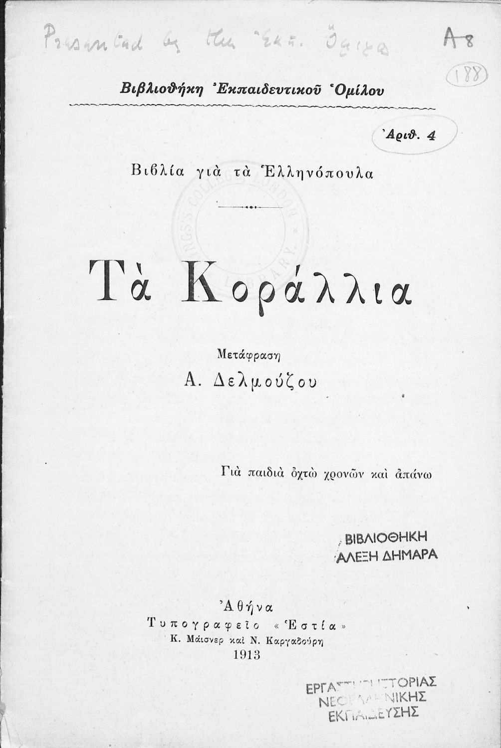 LDR 00971 2200181 4500 035 ## _a05-00188 040 ## _aΕργαστήρι Ιστορίας Ν.Ε. Εκπαίδευσης, Πανεπιστήμιο Ιωαννίνων 041 ## _ael 100 ## _aCarl Ewald _aΑ. Δελμούζος (μετάφραση) 110 ## _a188 245 0# _aΤα κοράλλια. Βιβλία για τα Ελληνόπουλα 260 ## _aΑθήνα _bΤυπογραφείο «Εστία» _c1913 300 ## _a19 520 ## _aΕξωσχολικό ανάγνωσμα για παιδιά 8 ετών και άνω, με χαρακτήρα εκπαιδευτικό και σε μετάφραση Α. Δελμούζου που στόχο είχε να μεταδώσει την αξία του διαβάσματος. 522 ## _aΕλλάδα 546 ## _aΔημοτική 563 ## _aΜαλακό Εξώφυλλο 650 #4 _aΕθνική ζωή _aΕλληνόπουλα _aΛογοτεχνική αξία