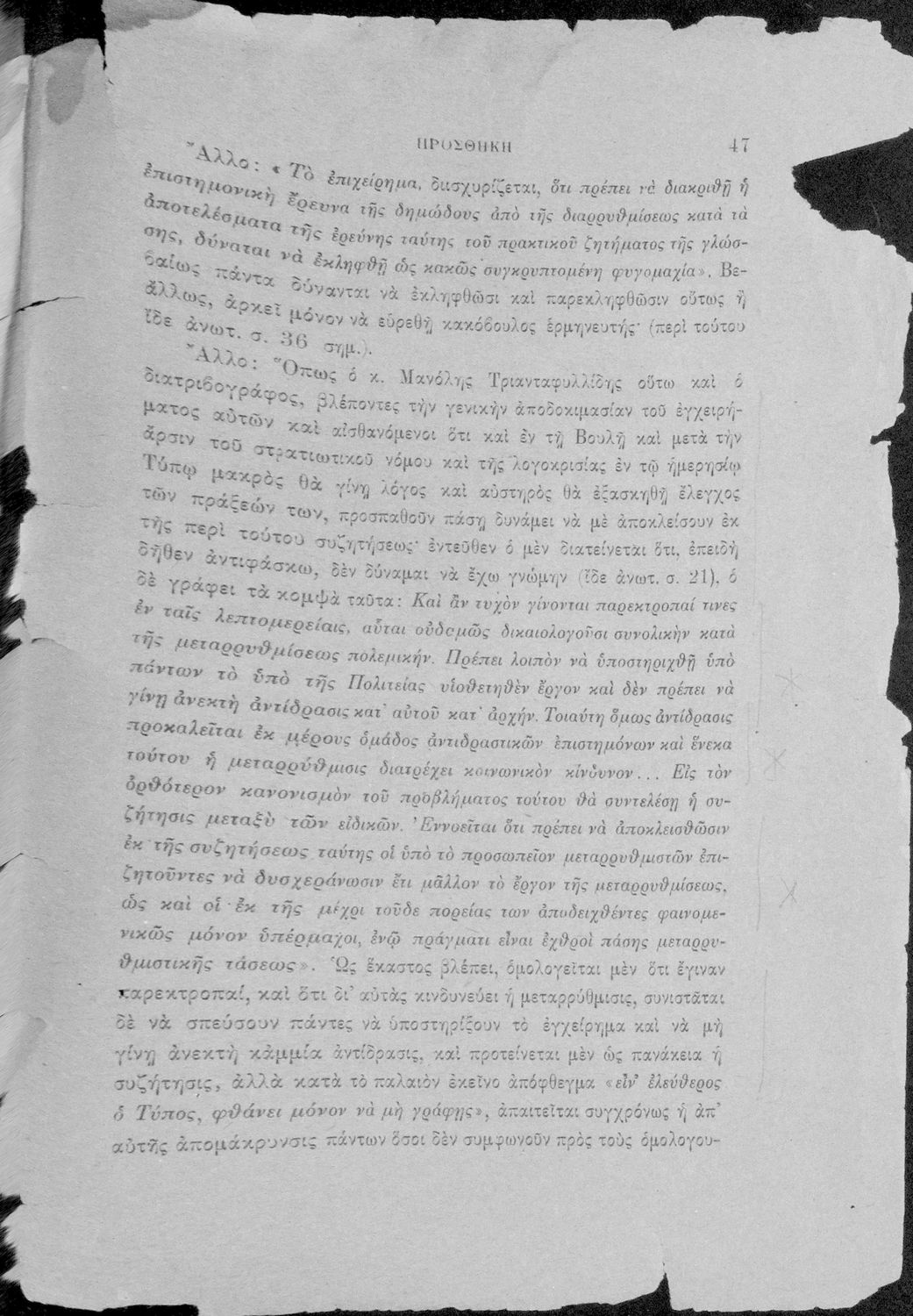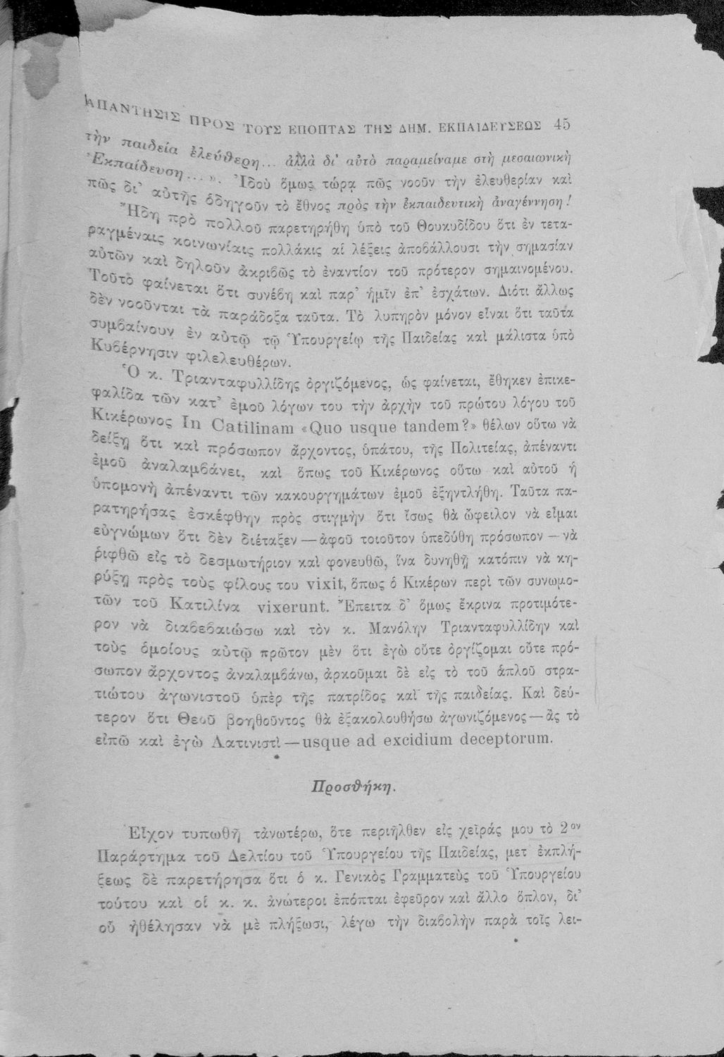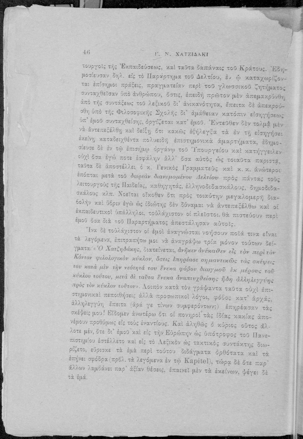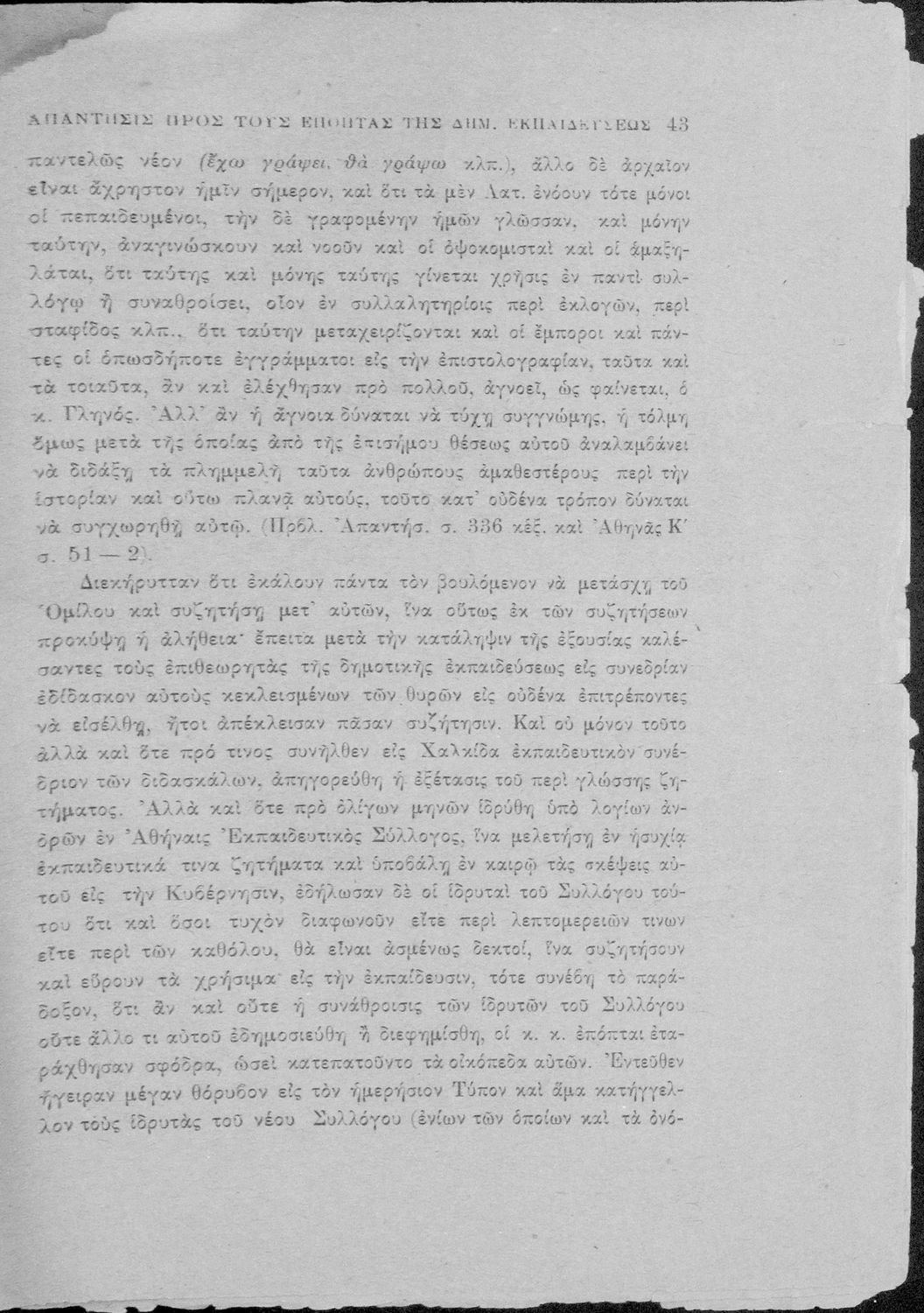 Παρουσίαση περιεχομένου: Απάντηση του Γ. Ν. Χατζιδάκι στους ανώτερους επόπτες της δημοτικής εκπαίδευσης (Μ. Τριανταφυλλίδη και Α. Δελμούζο) που δημοσιεύτηκε κατά την περίοδο της πρώτης βενιζελικής εκπαιδευτικής και γλωσσικής μεταρρύθμισης και αφορούσε τη σύγκρουση δημοτικιστών και καθαρευουσιάνων.