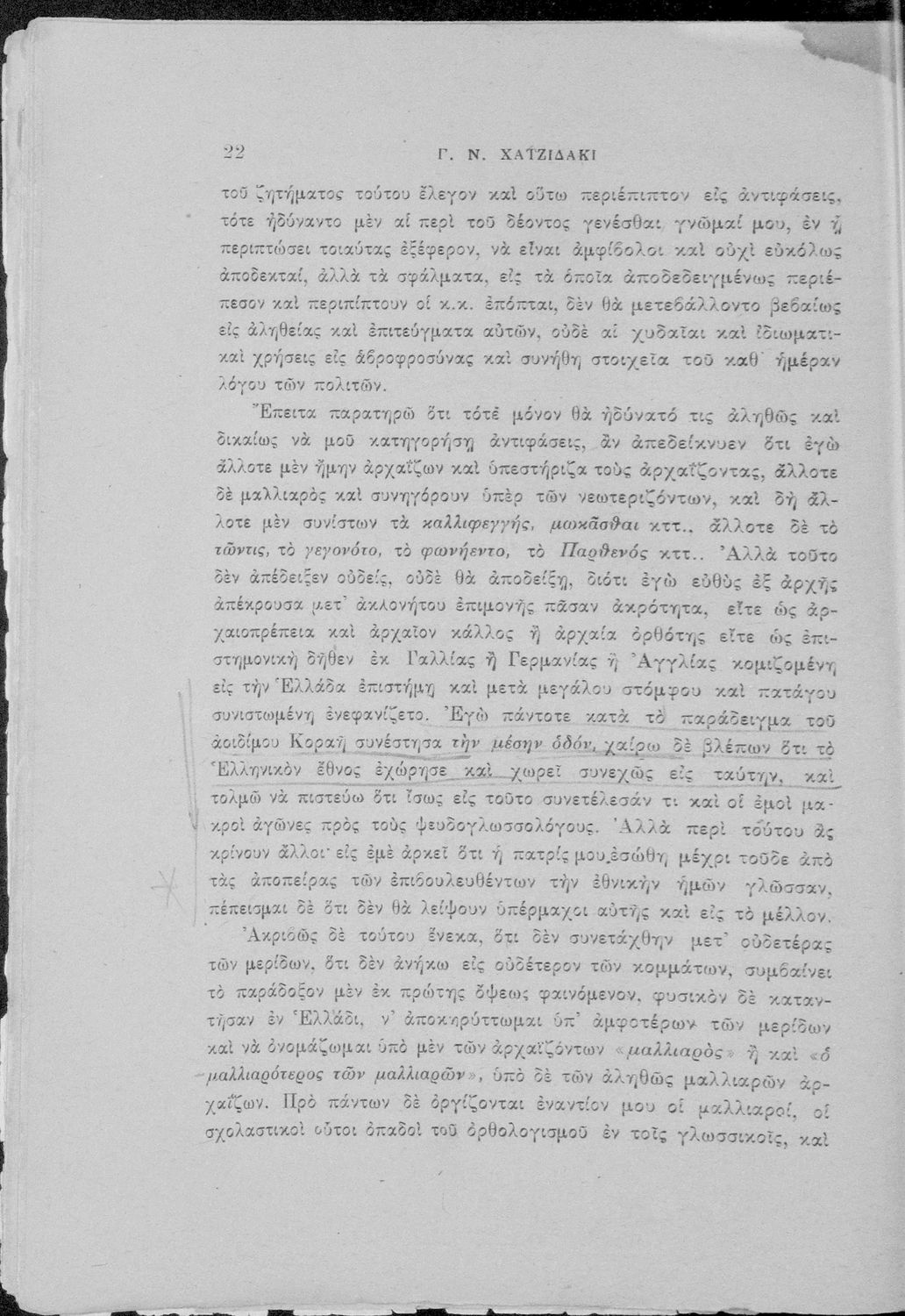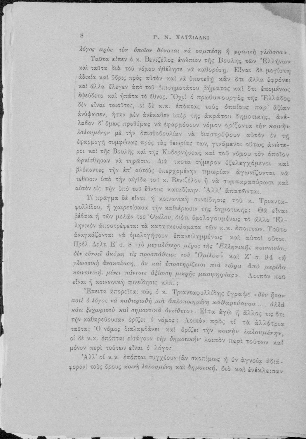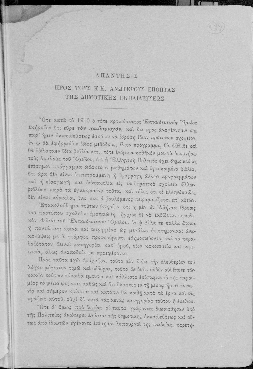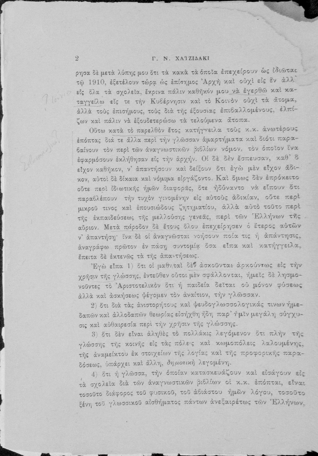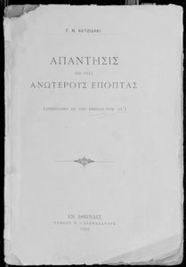 Παρουσίαση περιεχομένου: Απάντηση του Γ. Ν. Χατζιδάκι στους ανώτερους επόπτες της δημοτικής εκπαίδευσης (Μ. Τριανταφυλλίδη και Α. Δελμούζο) που δημοσιεύτηκε κατά την περίοδο της πρώτης βενιζελικής εκπαιδευτικής και γλωσσικής μεταρρύθμισης και αφορούσε τη σύγκρουση δημοτικιστών και καθαρευουσιάνων.