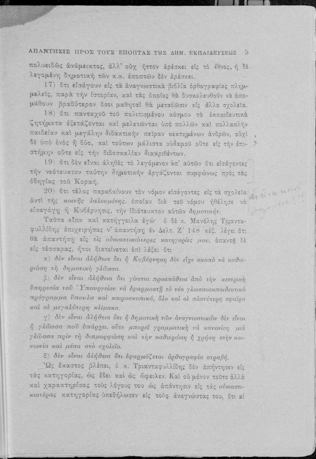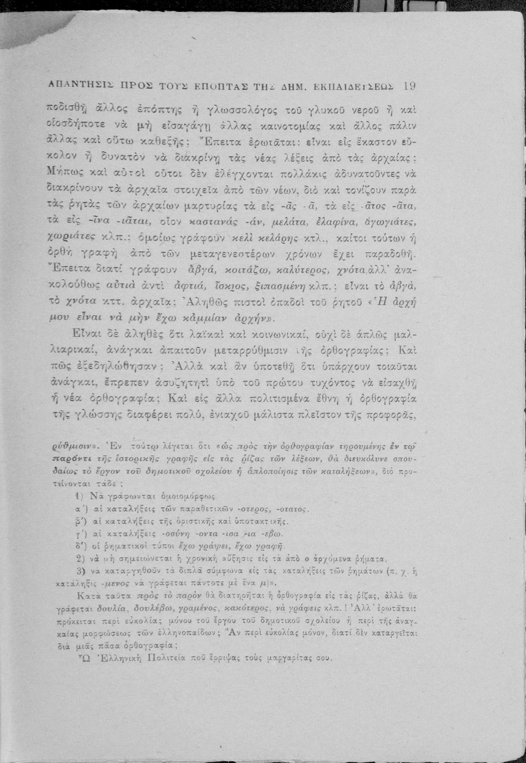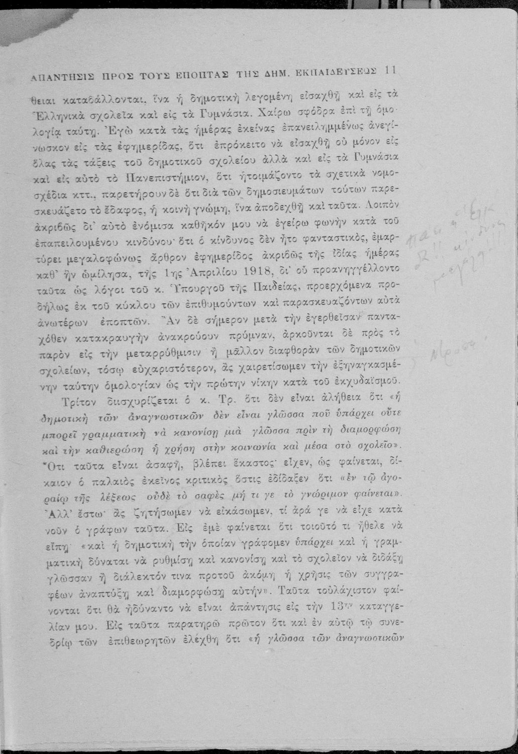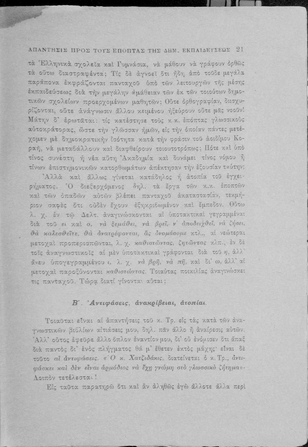 Απάντηση του Γ. Ν. Χατζιδάκι στους ανώτερους επόπτες της δημοτικής εκπαίδευσης (Μ. Τριανταφυλλίδη και Α. Δελμούζο) που δημοσιεύτηκε κατά την περίοδο της πρώτης βενιζελικής εκπαιδευτικής και γλωσσικής μεταρρύθμισης και αφορούσε τη σύγκρουση δημοτικιστών και καθαρευουσιάνων.