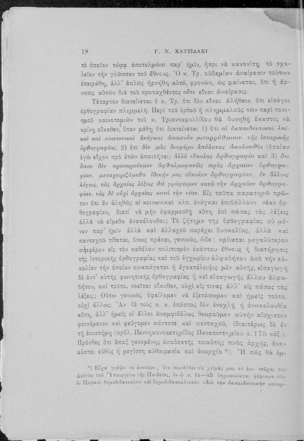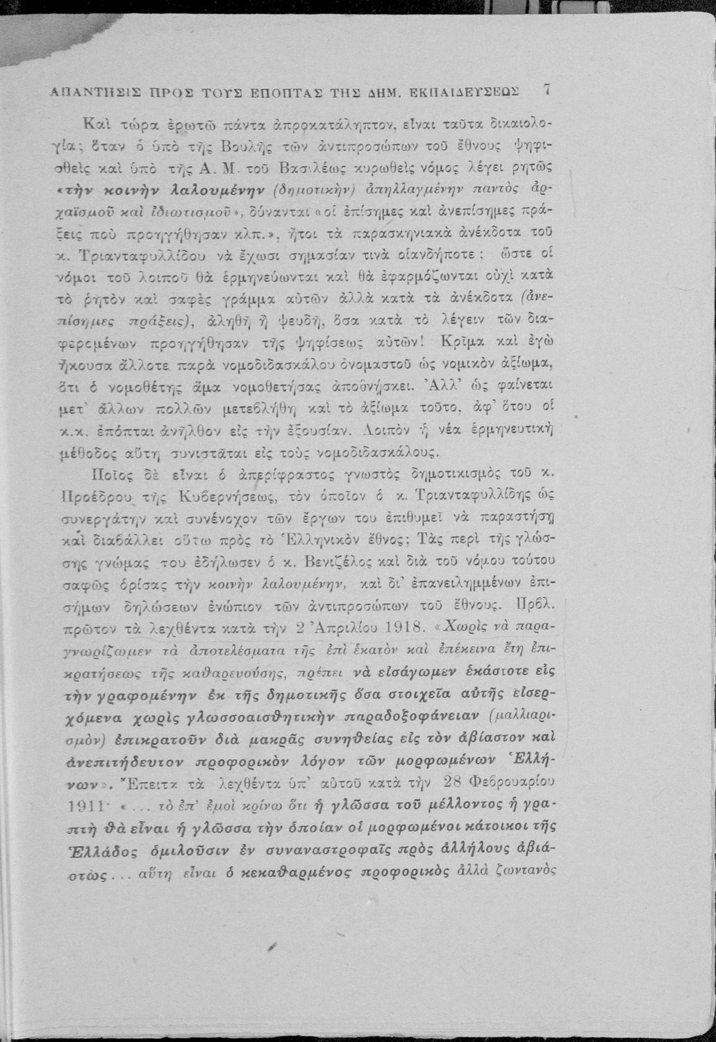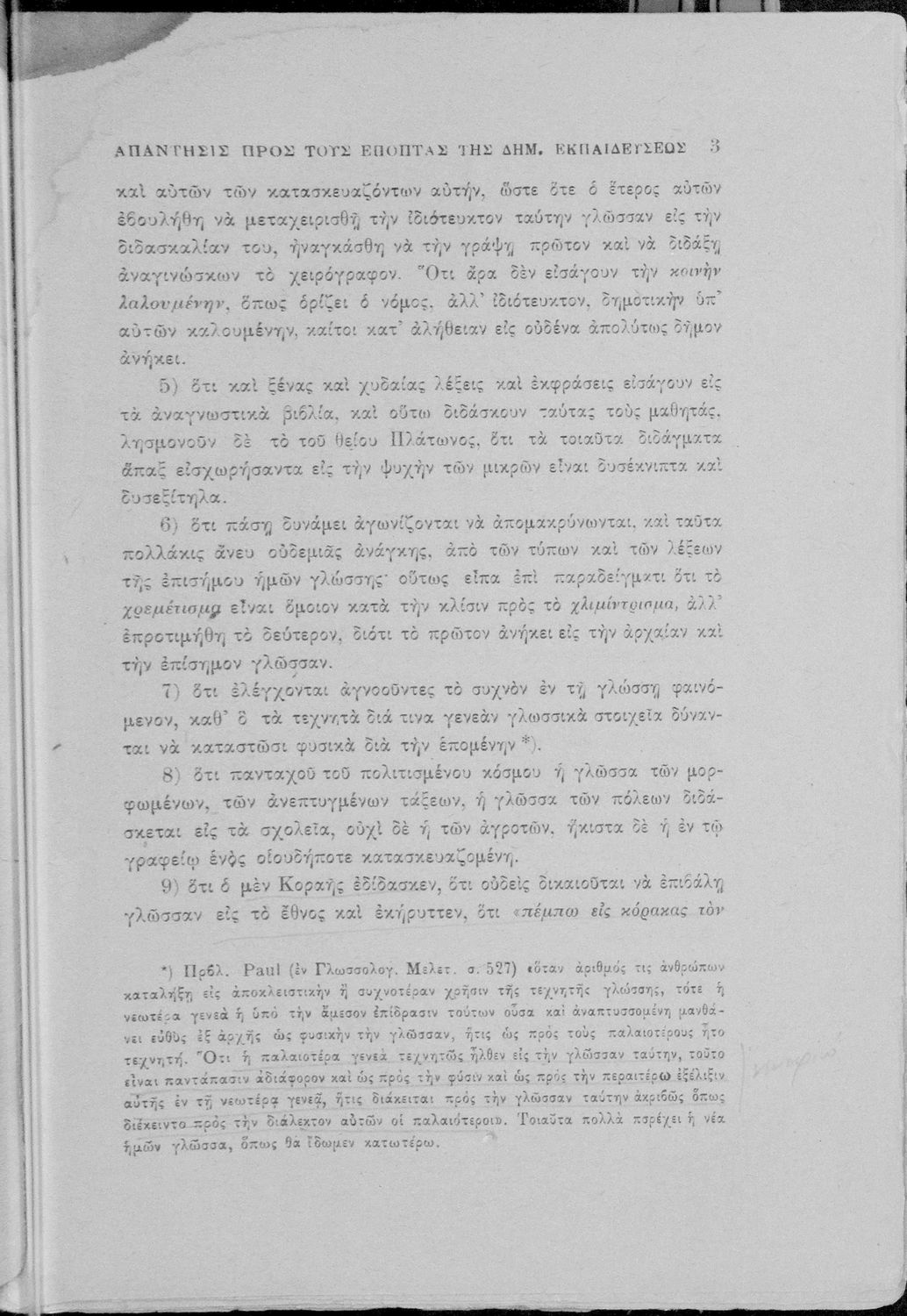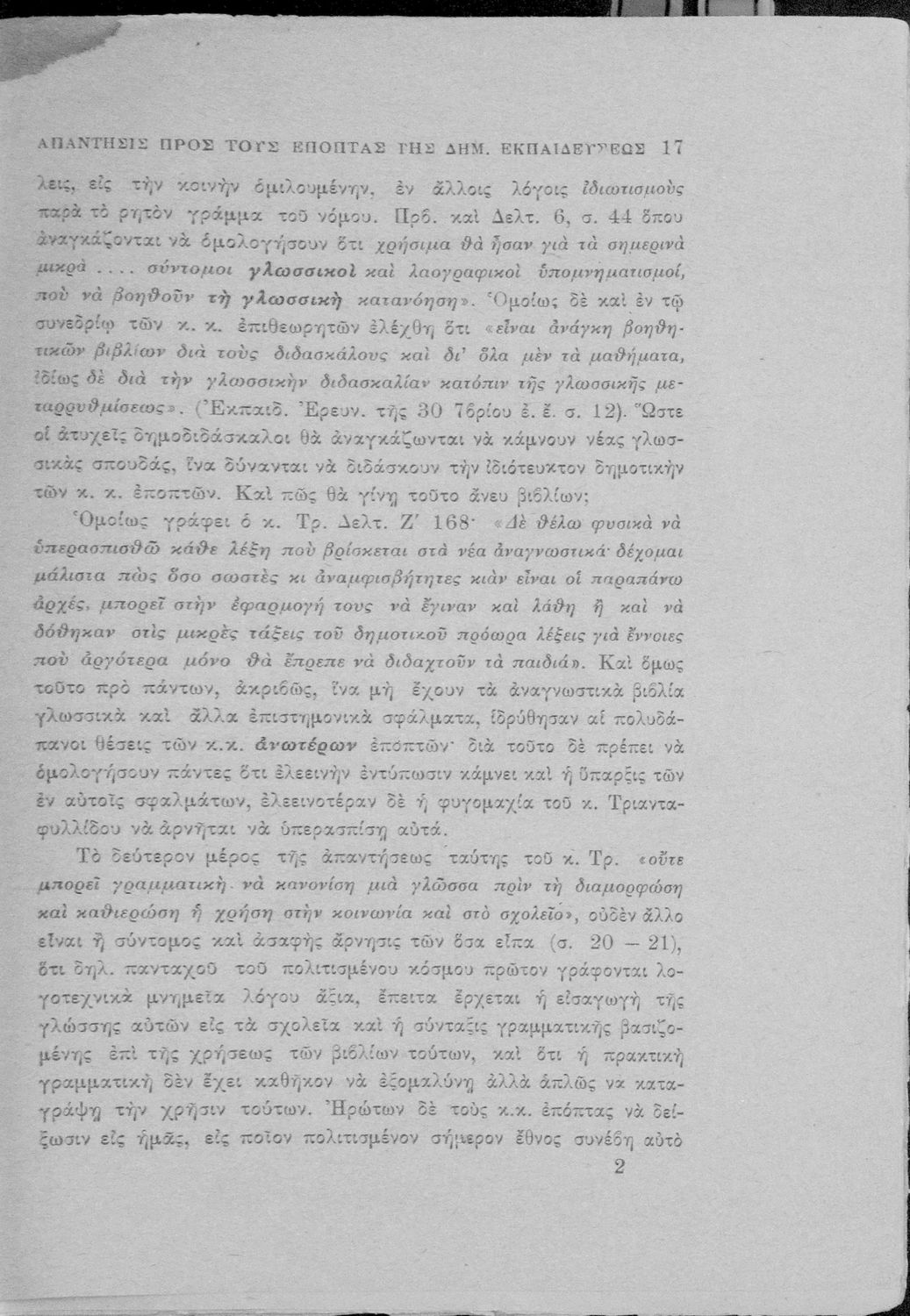 Απάντηση του Γ. Ν. Χατζιδάκι στους ανώτερους επόπτες της δημοτικής εκπαίδευσης (Μ. Τριανταφυλλίδη και Α. Δελμούζο) που δημοσιεύτηκε κατά την περίοδο της πρώτης βενιζελικής εκπαιδευτικής και γλωσσικής μεταρρύθμισης και αφορούσε τη σύγκρουση δημοτικιστών και καθαρευουσιάνων.
