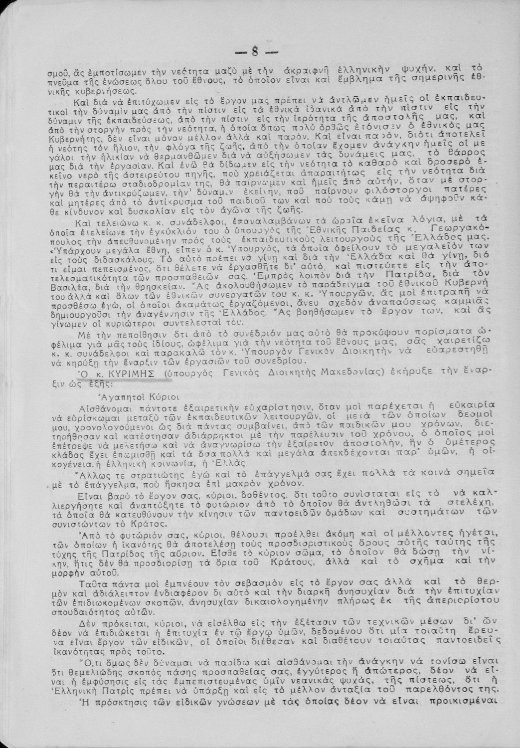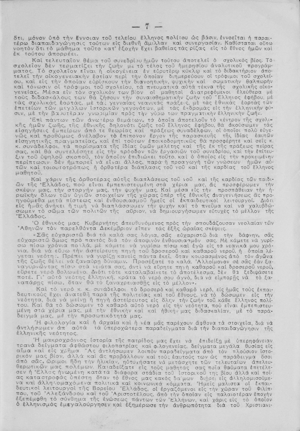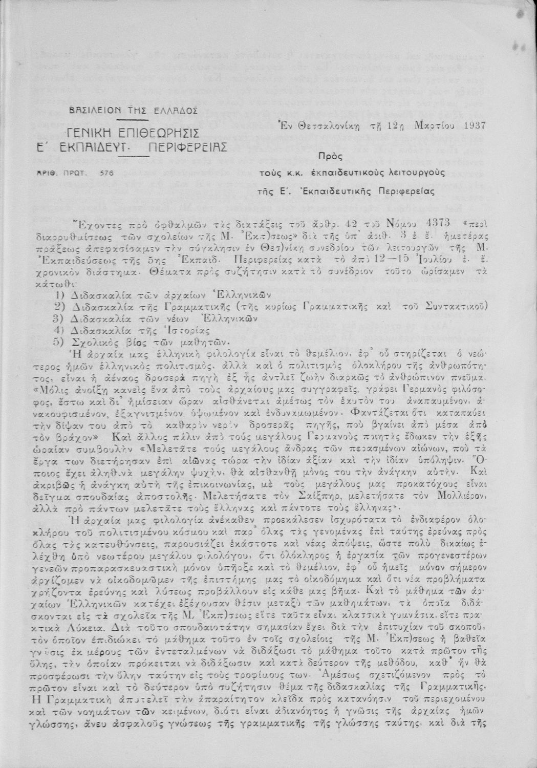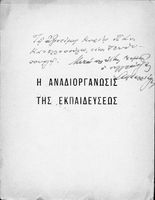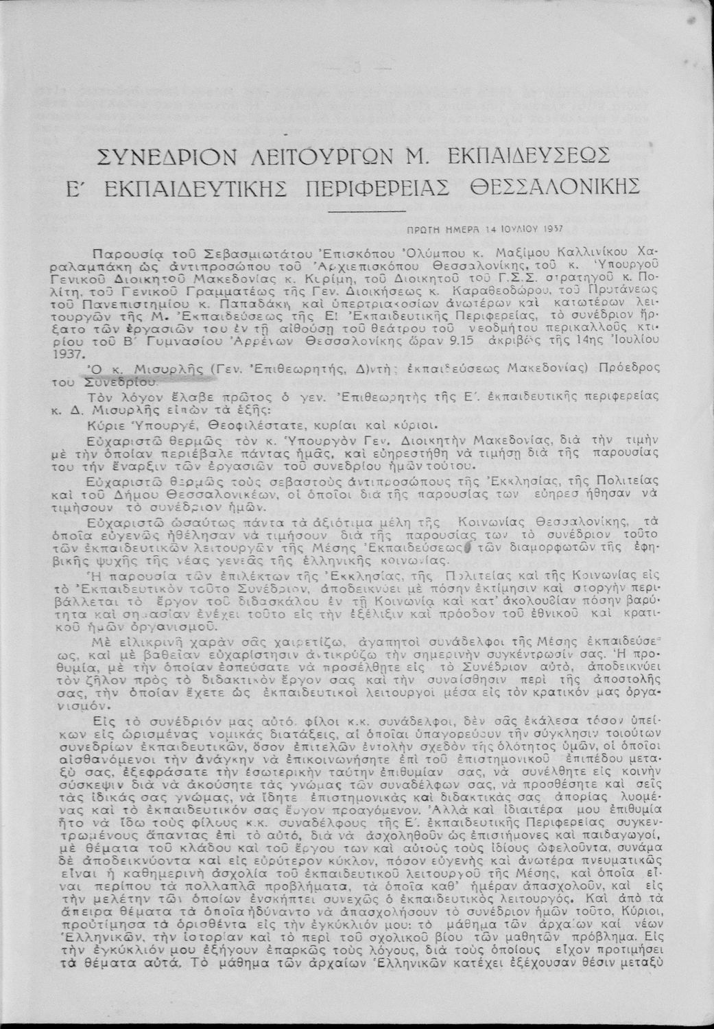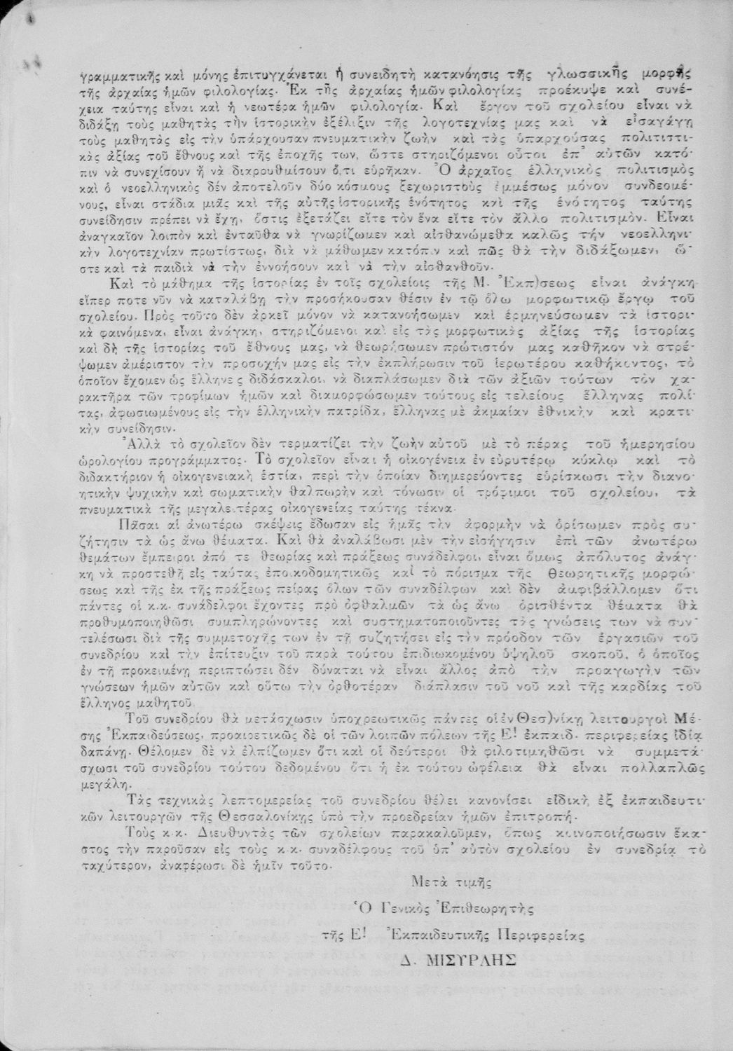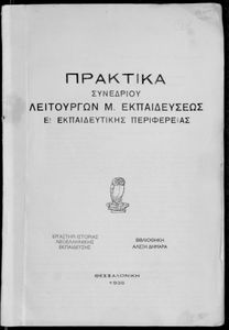 Πρακτικά του συνεδρίου των εκπαιδευτικών της Ε΄ εκπαιδευτικής περιφέρειας που συγκλήθηκε κατόπιν απόφασης του Γενικού Επιθεωρητή της Ε΄ εκπαιδευτικής περιφέρειας Δ. Μισυρλή με σκοπό να συζητηθεί η διδασκαλία των Αρχαίων και Νέων Ελληνικών, της Γραμματικής και της Ιστορίας καθώς και η σχολική ζωή των μαθητών.
