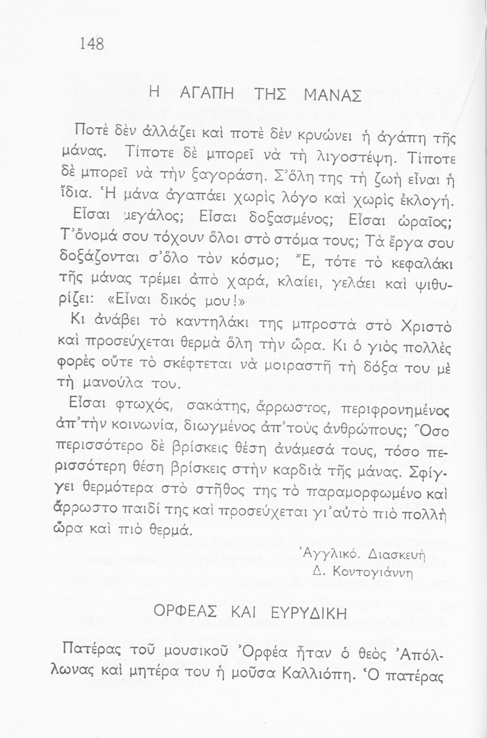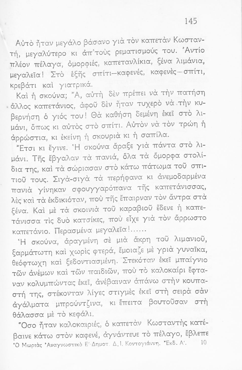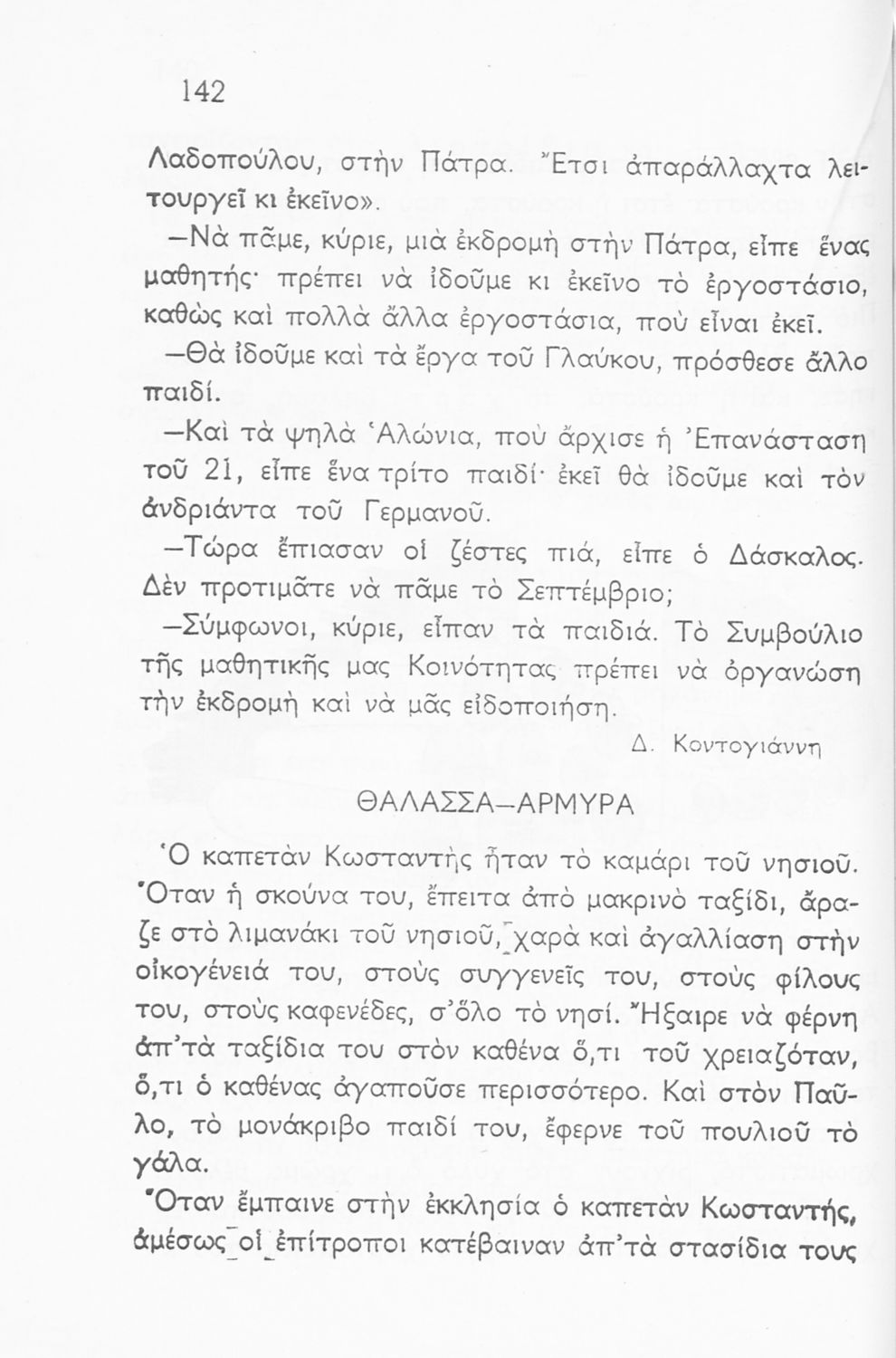 Αναγνωστικό Ε΄ Δημοτικού που περιλαμβάνει πεζογραφήματα εμπνευσμένα από την ελληνική φύση, την αγροτική ζωή και από το τρίπτυχο "Πατρίς- θρησκεία- οικογένεια".