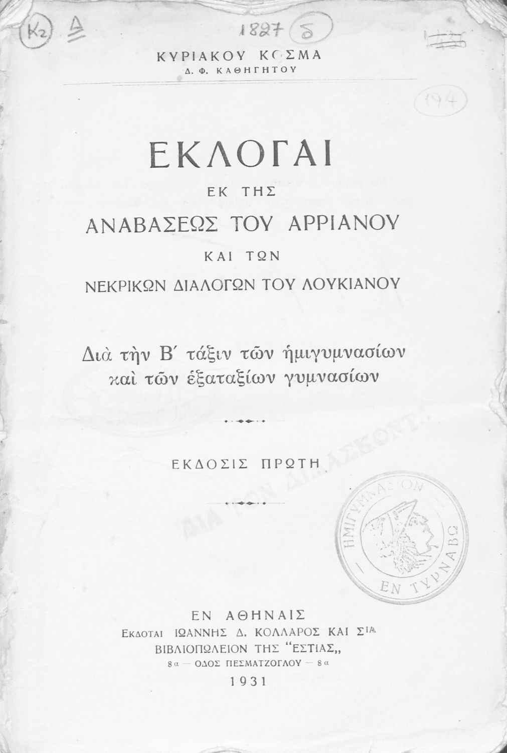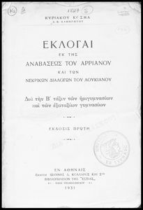 Τίτλος: Εκλογαί εκ της Αναβάσεως του Αρριανού και των Νεκρικών Διαλόγων του Λουκιανού. Διά την Β΄ τάξιν των Ημιγυμνασίων και των Εξαταξίων Γυμνασίων