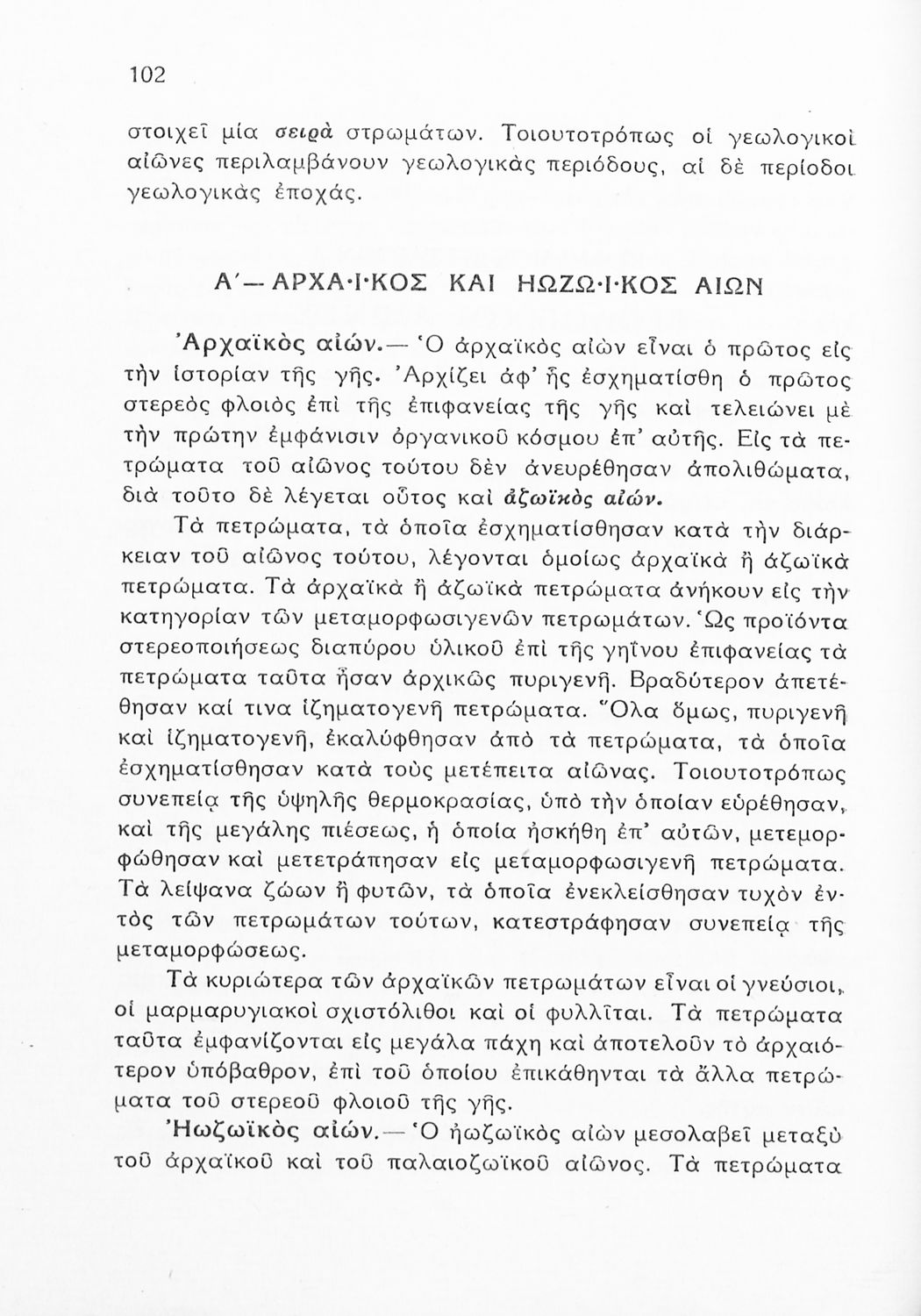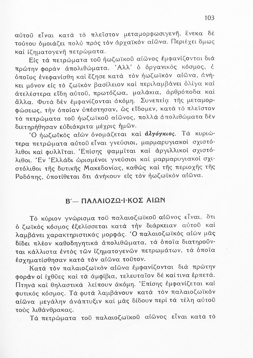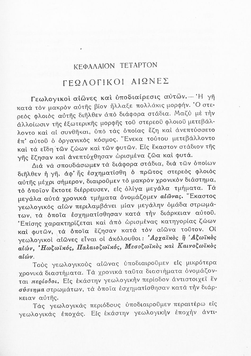 Βιβλίο Γεωλογίας/Ορυκτολογίας για την Δ΄ τάξη των Εξαταξίων Γυμνασίων που παρουσιάζει τα ορυκτά με βάση την κλάση στην οποία ανήκουν. Το τμήμα της γεωλογίας εστιάζει στους γεωλογικούς αιώνες, Ο συγγραφέας ήταν υφηγητής της Γεωλογίας στο Πανεπιστήμιο Αθηνών.