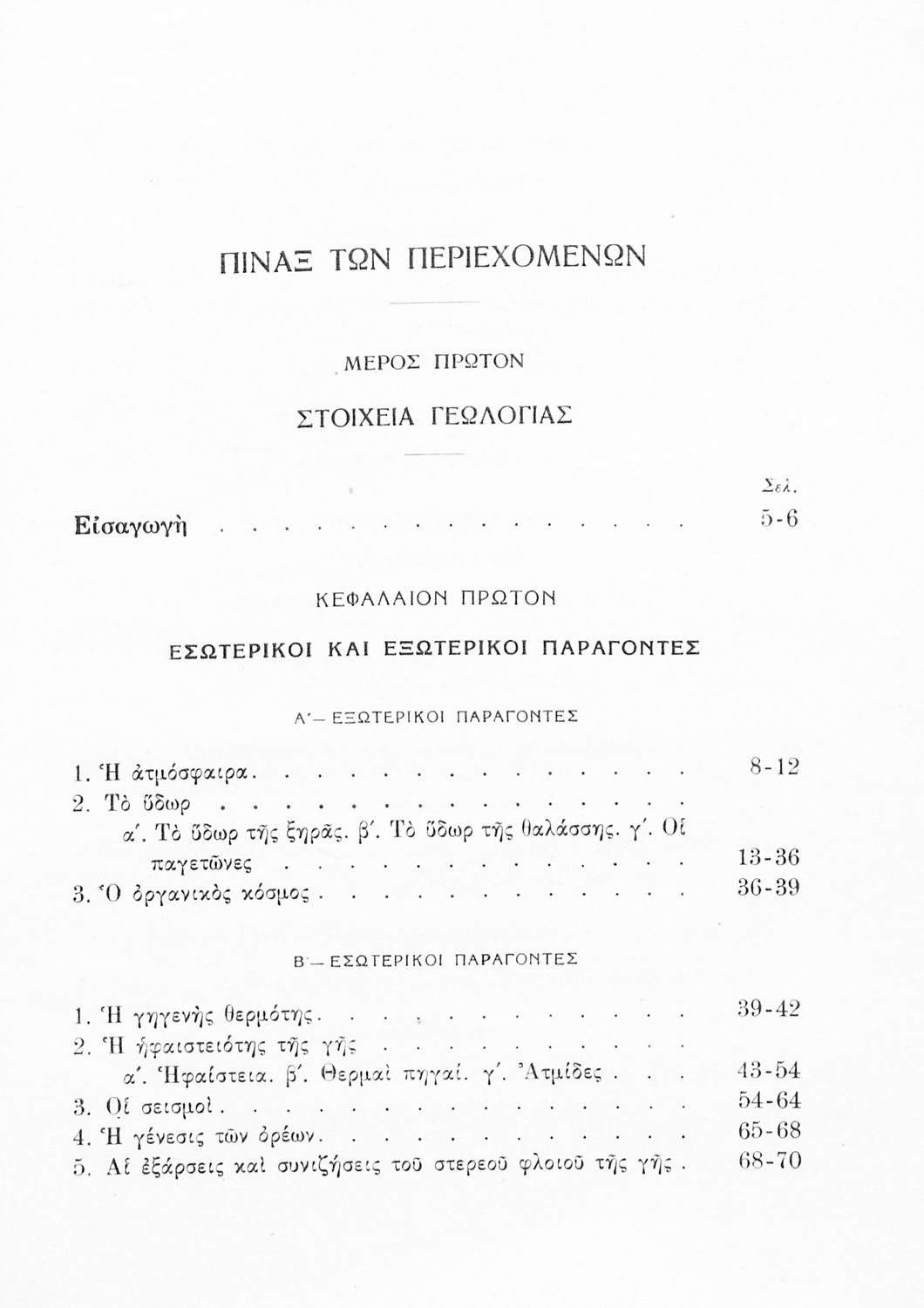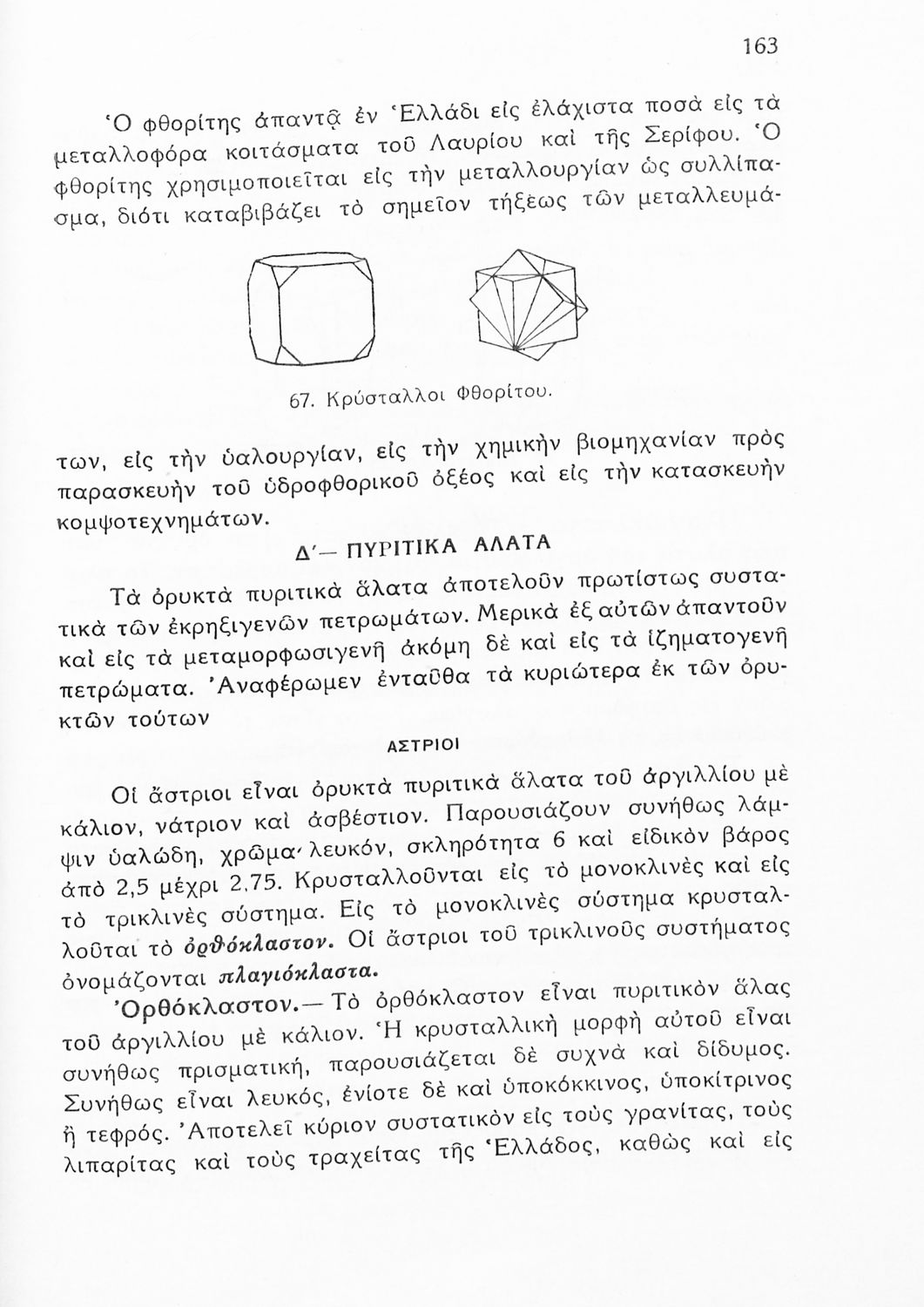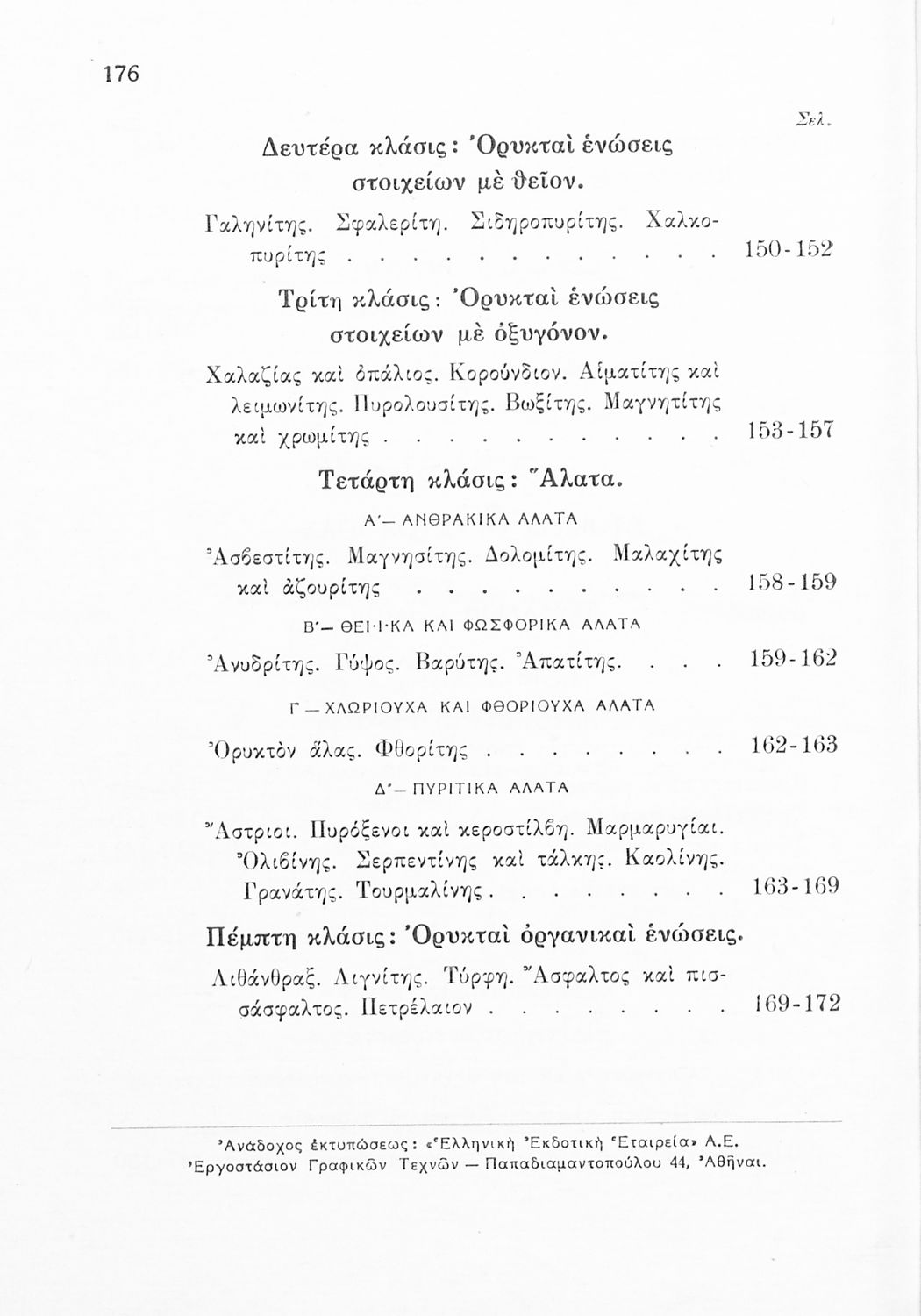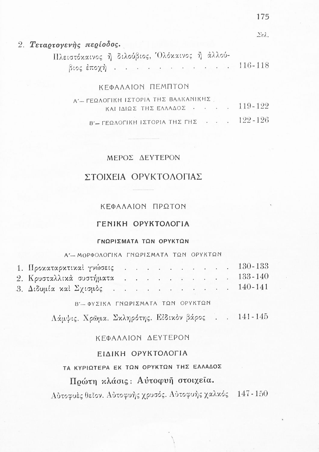 Βιβλίο Γεωλογίας/Ορυκτολογίας για την Δ΄ τάξη των Εξαταξίων Γυμνασίων που παρουσιάζει τα ορυκτά με βάση την κλάση στην οποία ανήκουν. Το τμήμα της γεωλογίας εστιάζει στους γεωλογικούς αιώνες, Ο συγγραφέας ήταν υφηγητής της Γεωλογίας στο Πανεπιστήμιο Αθηνών.