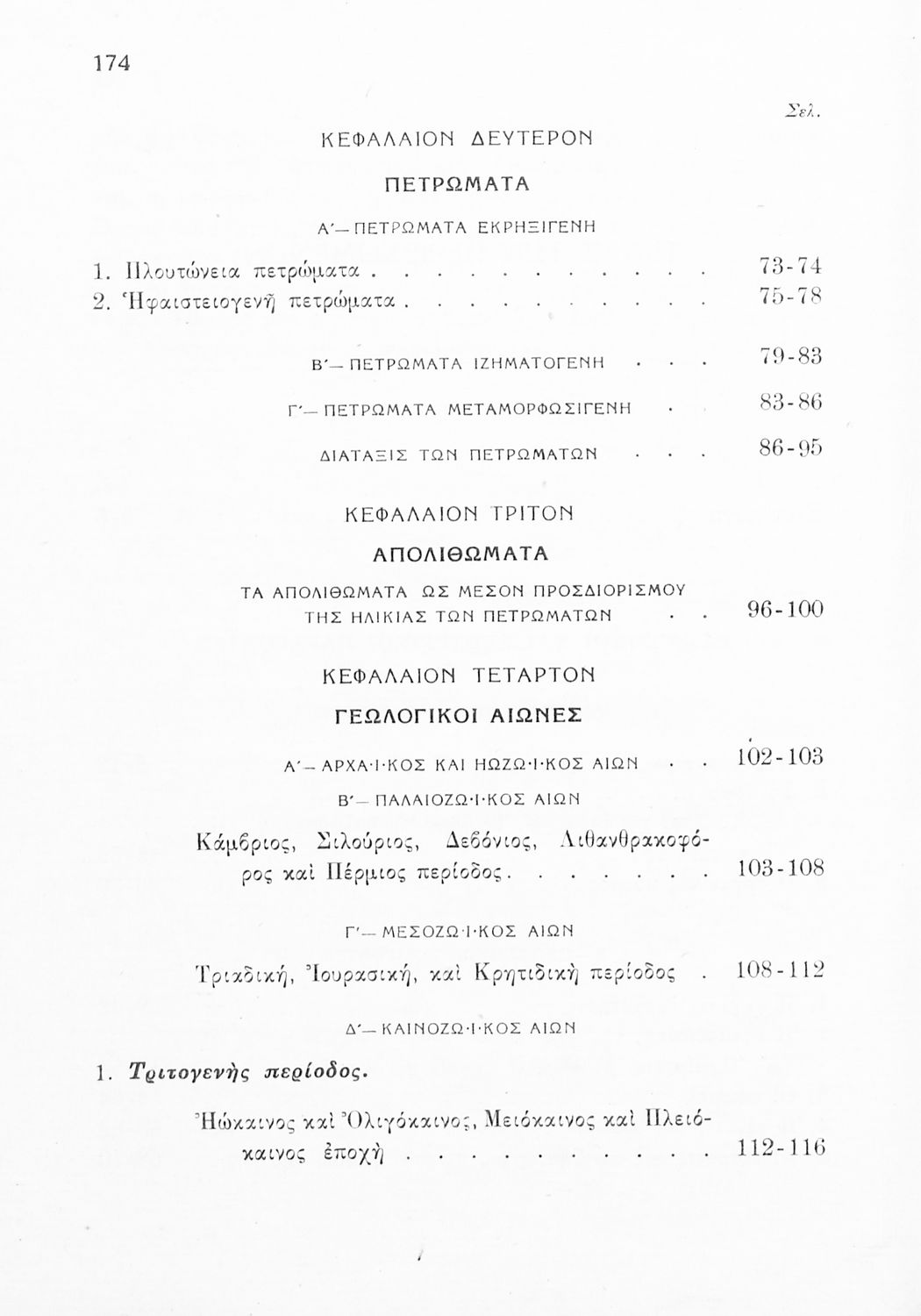 Βαθμίδα εκπαίδευσης: Δευτεροβάθμια Τάξη: Δ' Γυμνασίου Μάθημα: Γεωλογία, Ορυκτολογία Γλώσσα: Απλή καθαρεύουσα Παρουσίαση περιεχομένου: Βιβλίο Γεωλογίας/Ορυκτολογίας για την Δ΄ τάξη των Εξαταξίων Γυμνασίων που παρουσιάζει τα ορυκτά με βάση την κλάση στην οποία ανήκουν. Το τμήμα της γεωλογίας εστιάζει στους γεωλογικούς αιώνες, Ο συγγραφέας ήταν υφηγητής της Γεωλογίας στο Πανεπιστήμιο Αθηνών. |