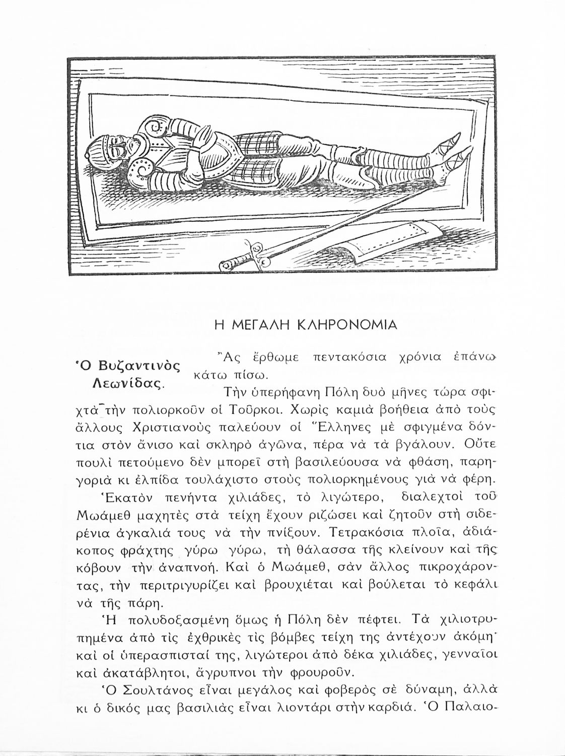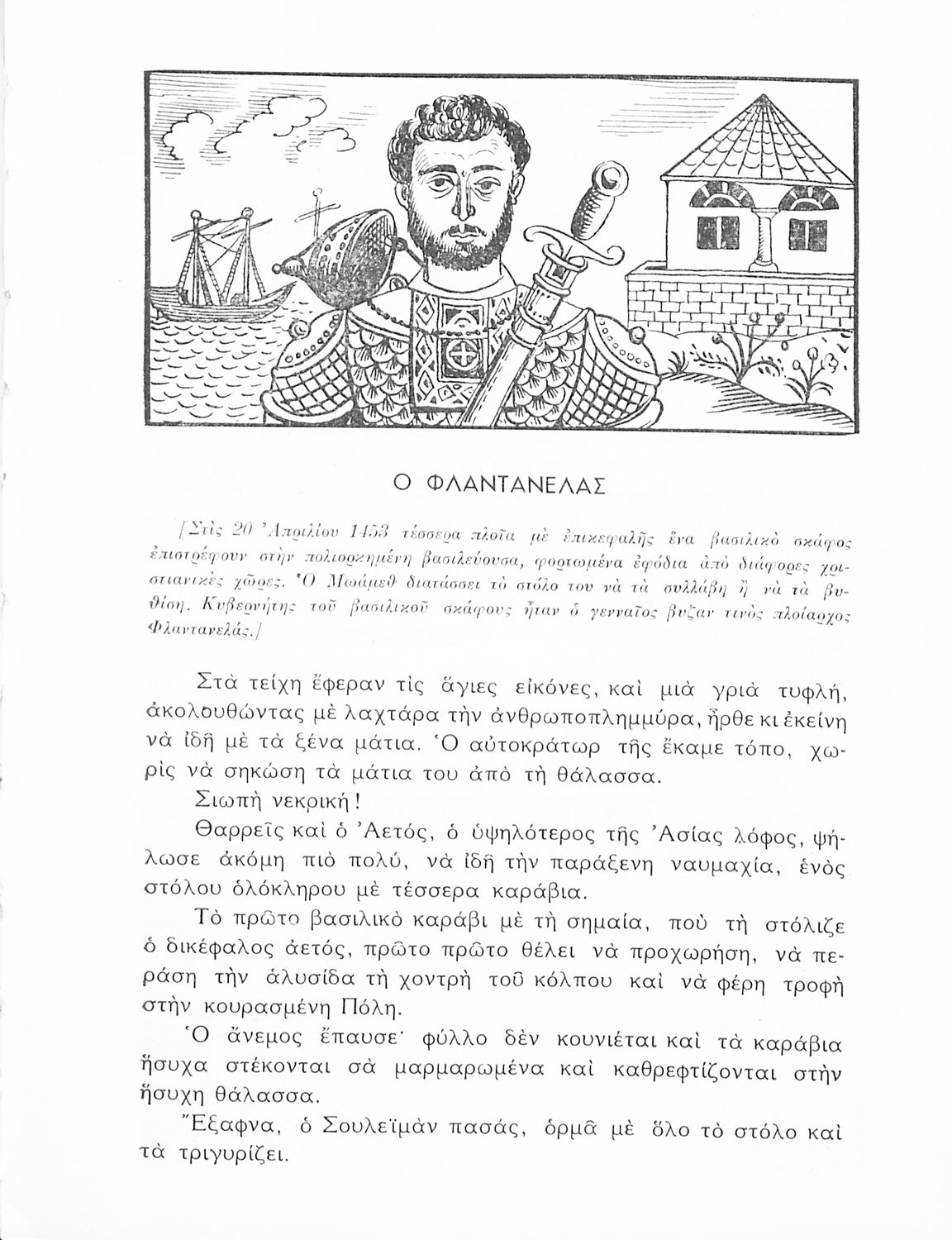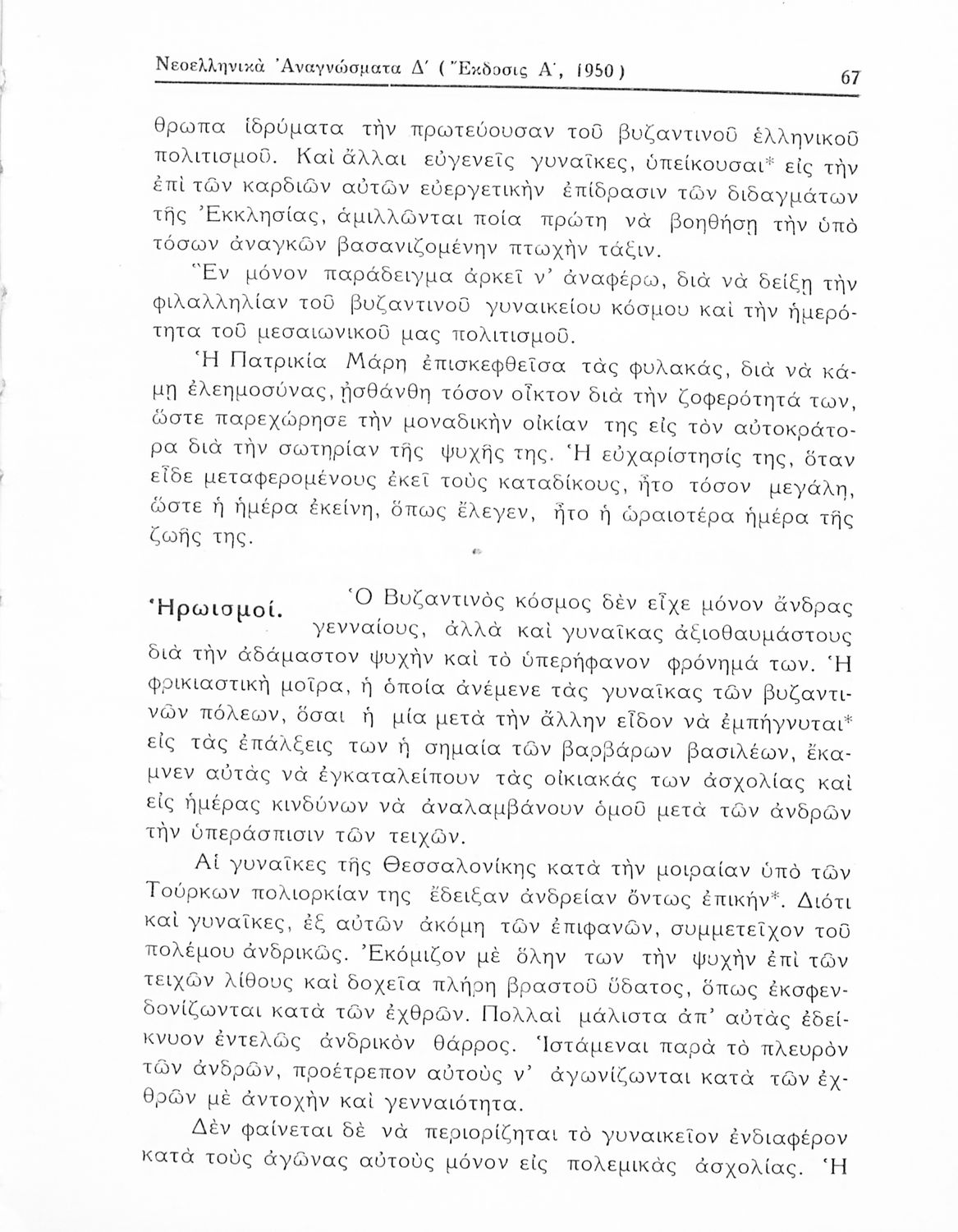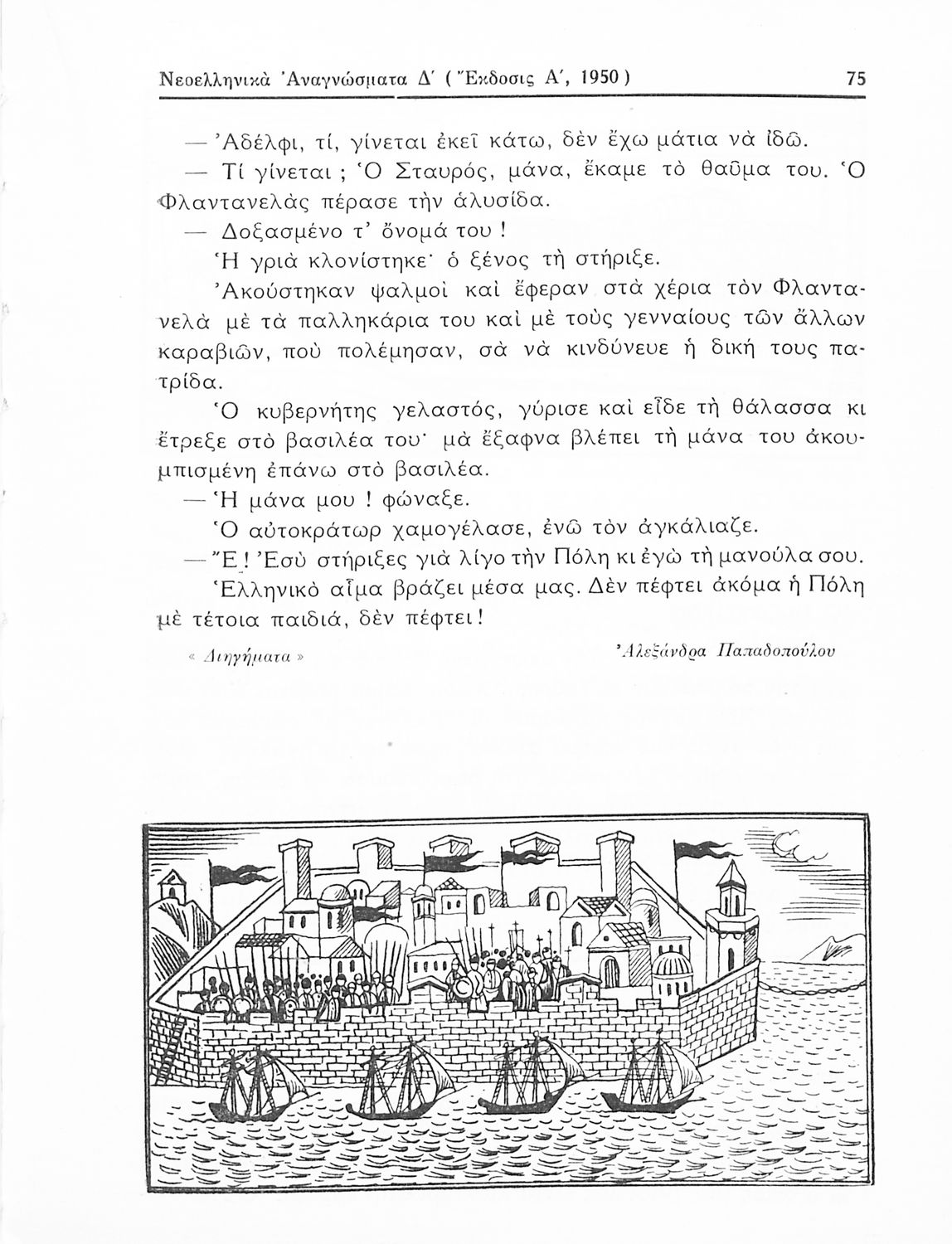 Σχολικό εγχειρίδιο Νέων Ελληνικών Δ΄ Γυμνασίου Θηλέων που περιλαμβάνει πεζά, ποιήματα και δημοτικά τραγούδια εμπνευσμένα από την σύγχρονη ελληνική ιστορία και την οικογενειακή και θρησκευτική ζωή. Περιέχει και