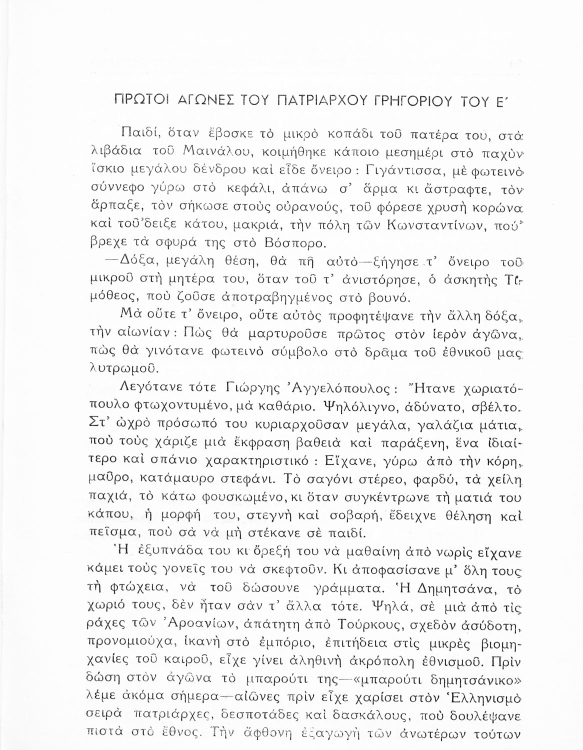 Σχολικό εγχειρίδιο Νέων Ελληνικών Δ΄ Γυμνασίου Θηλέων που περιλαμβάνει πεζά, ποιήματα και δημοτικά τραγούδια εμπνευσμένα από την σύγχρονη ελληνική ιστορία και την οικογενειακή και θρησκευτική ζωή. Περιέχει και