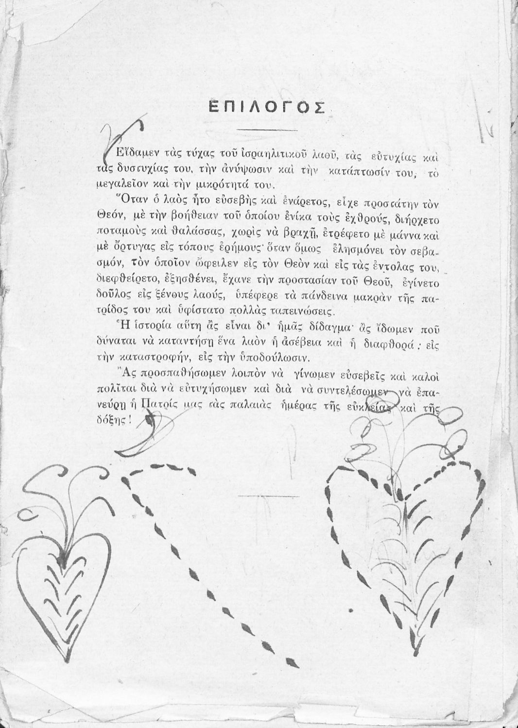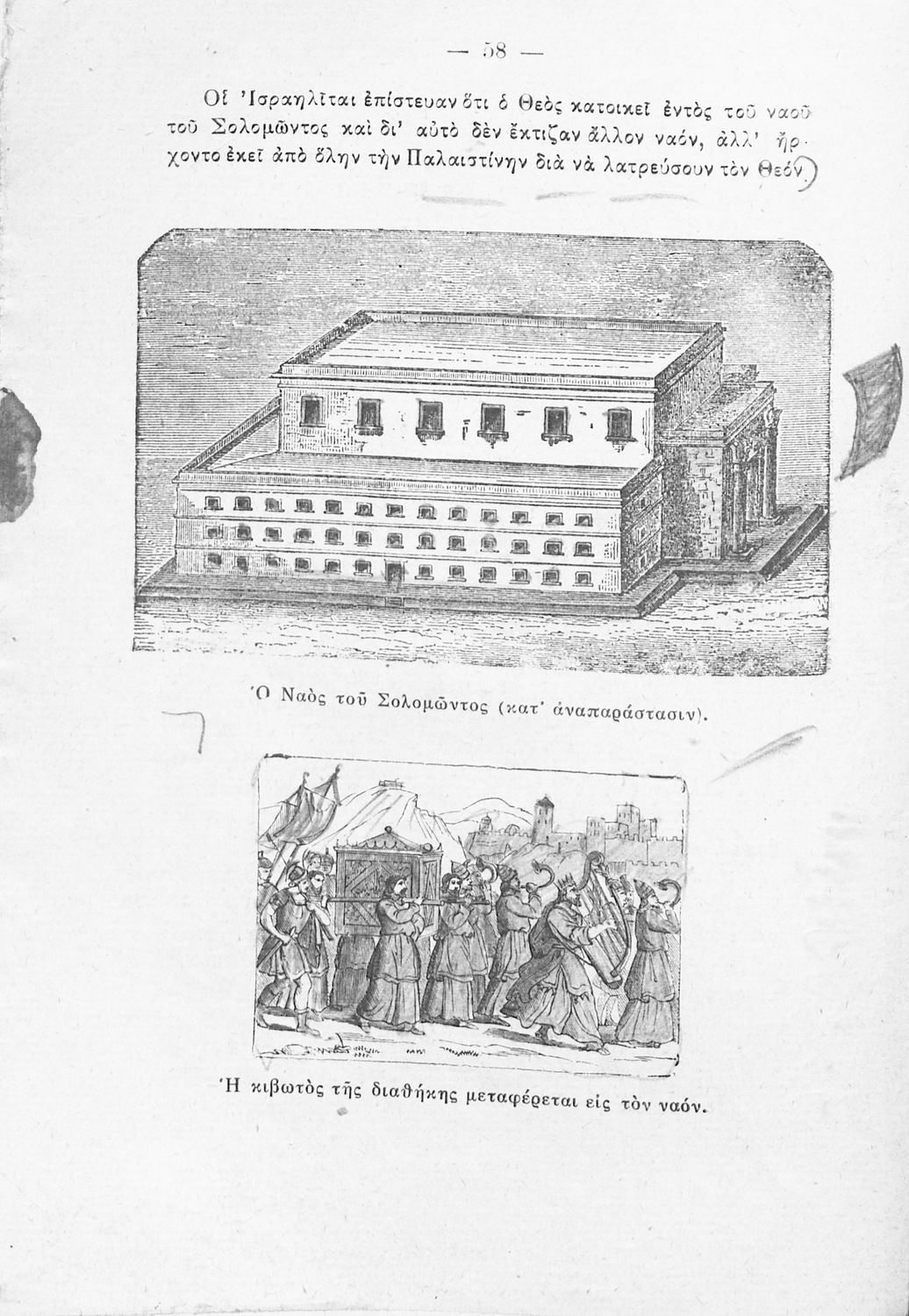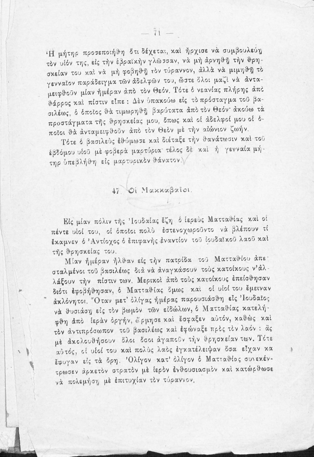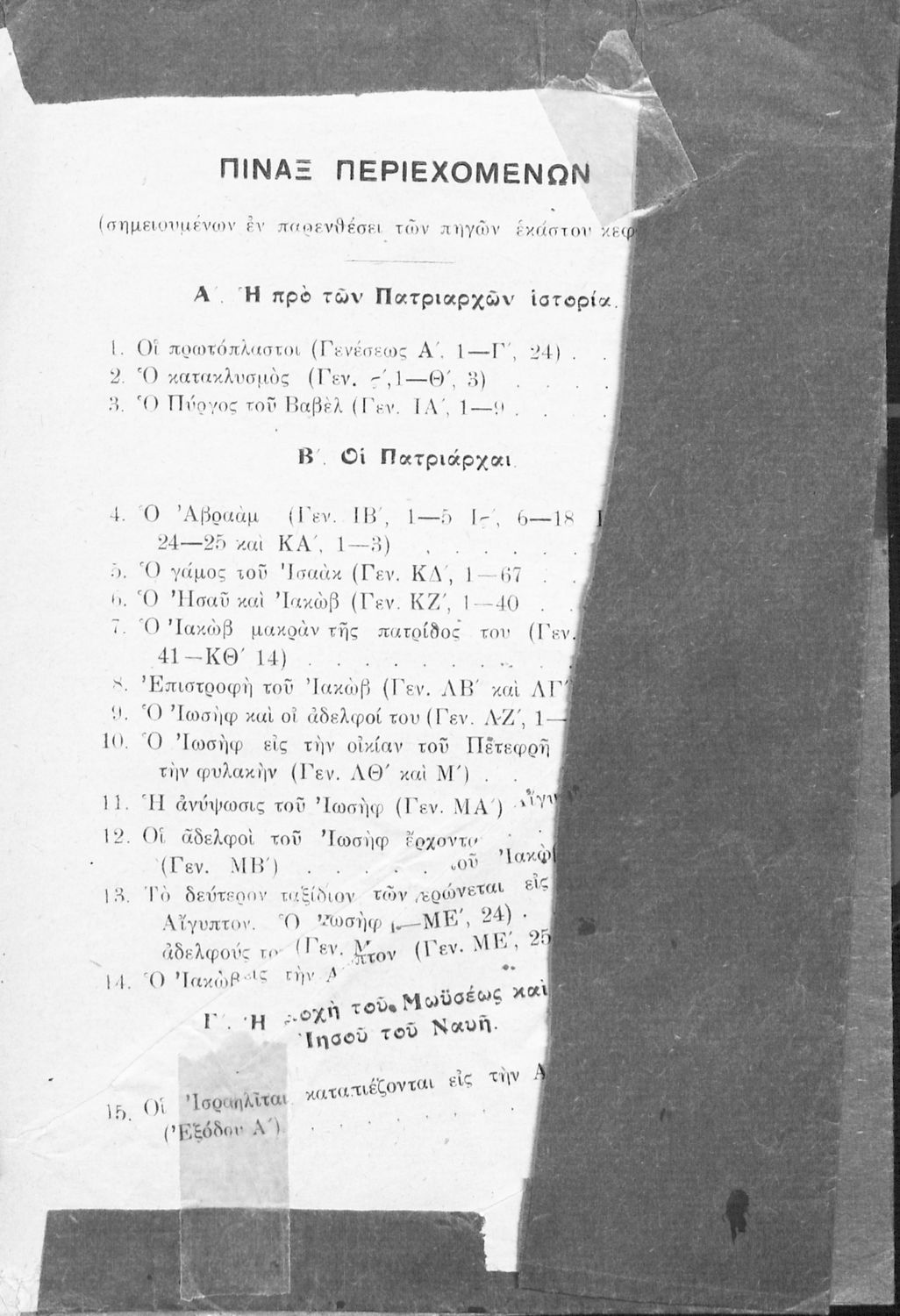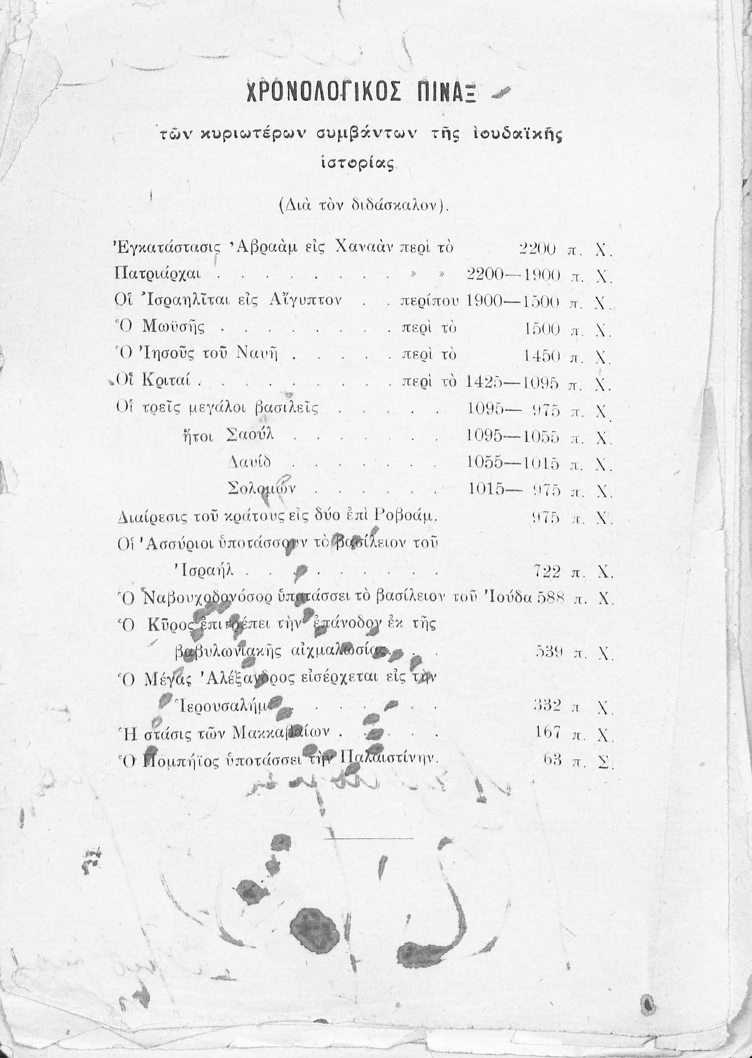 Σχολικό εγχειρίδιο Θρησκευτικών για τα Ελληνικά Σχολεία και Παρθεναγωγεία που συνιστά μία εξιστόρηση της Παλαιάς Διαθήκης από τη δημιουργία του κόσμου ως τους Μακκαβαίους.