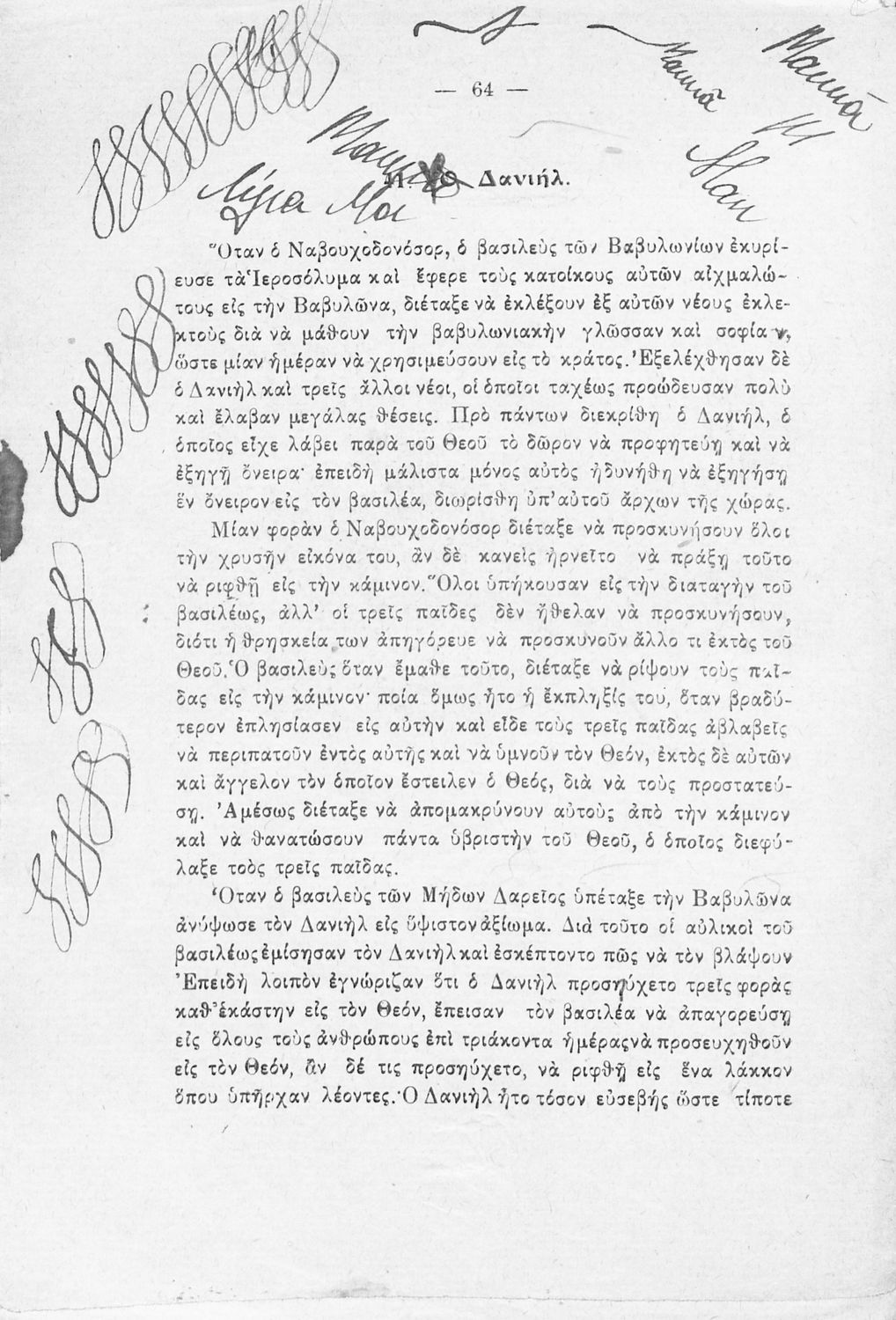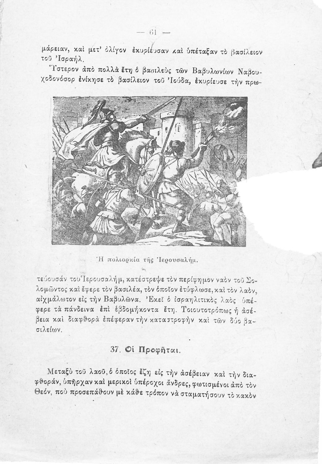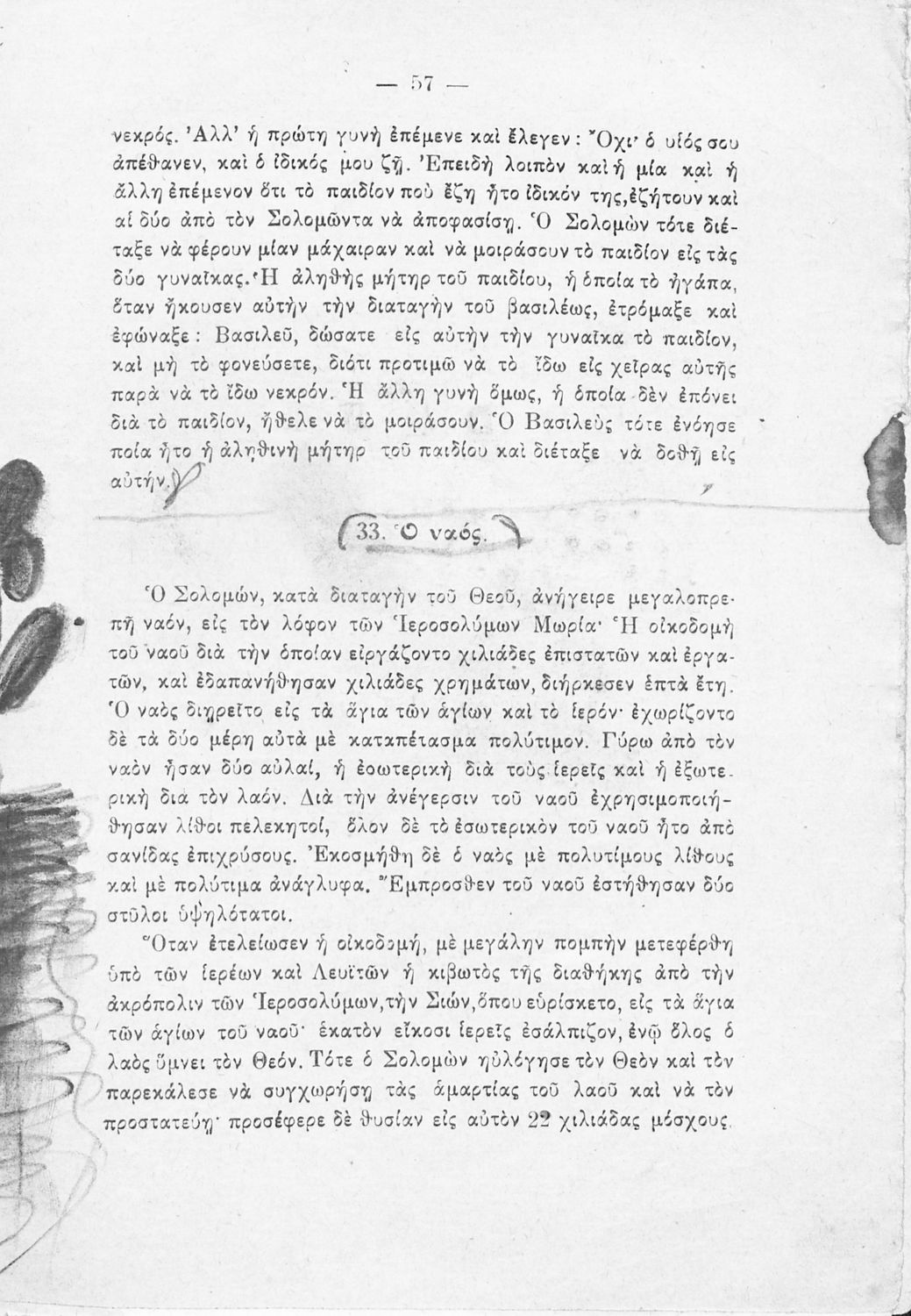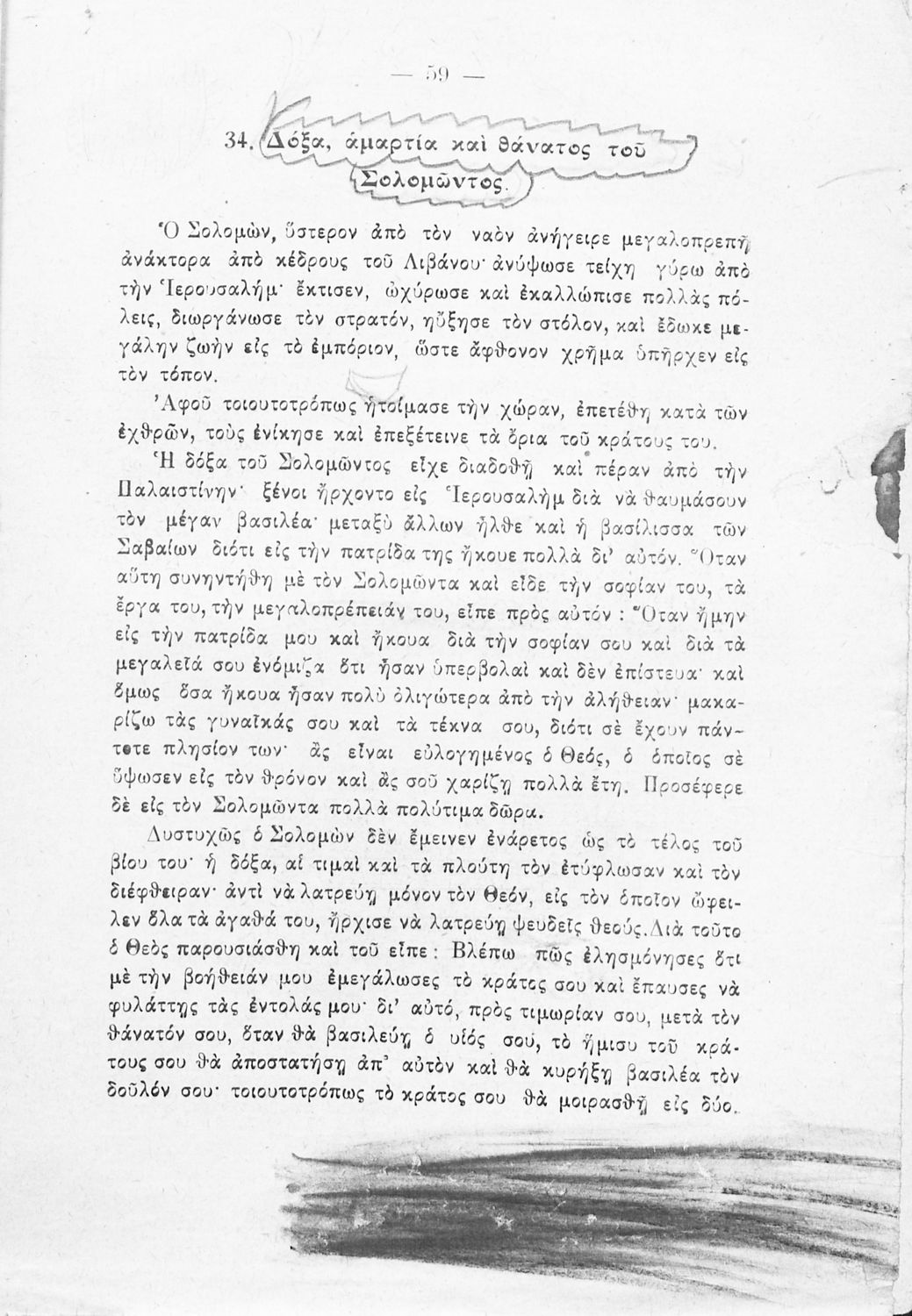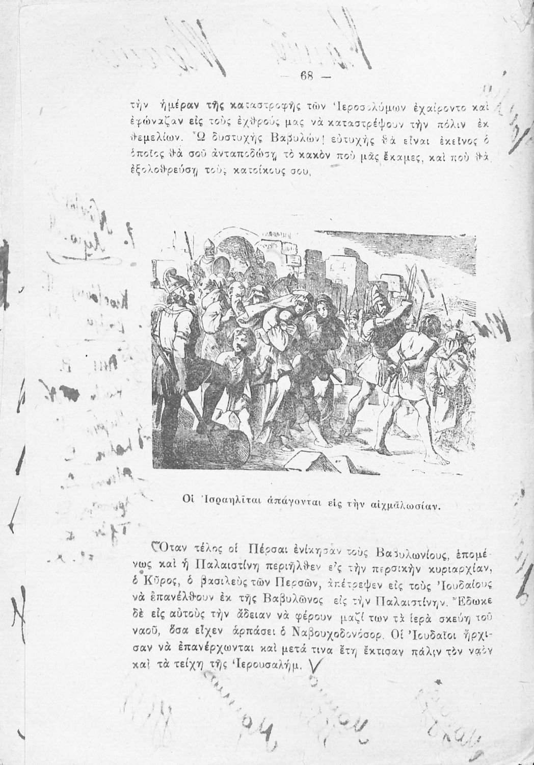 Σχολικό εγχειρίδιο Θρησκευτικών για τα Ελληνικά Σχολεία και Παρθεναγωγεία που συνιστά μία εξιστόρηση της Παλαιάς Διαθήκης από τη δημιουργία του κόσμου ως τους Μακκαβαίους.