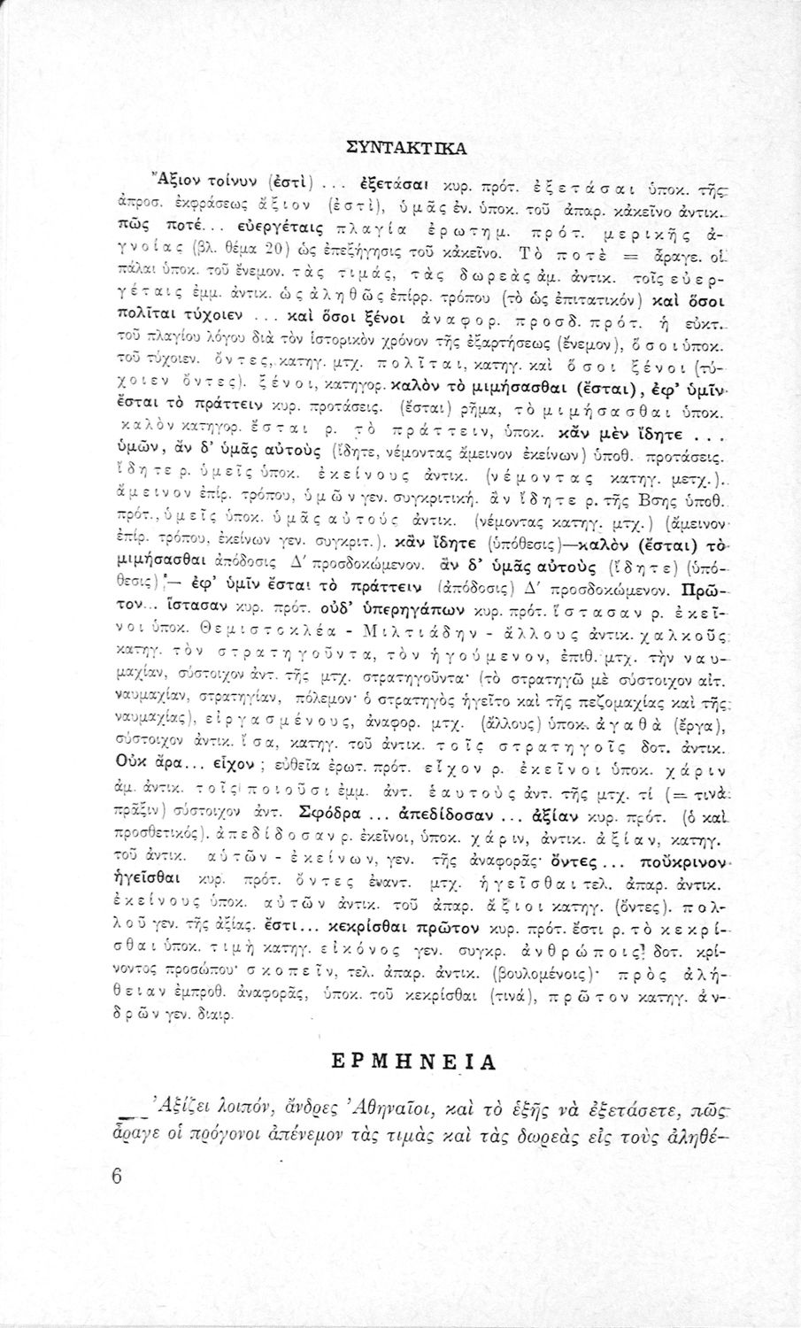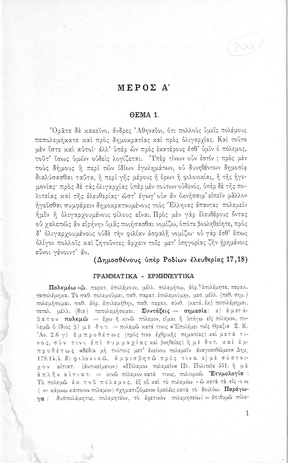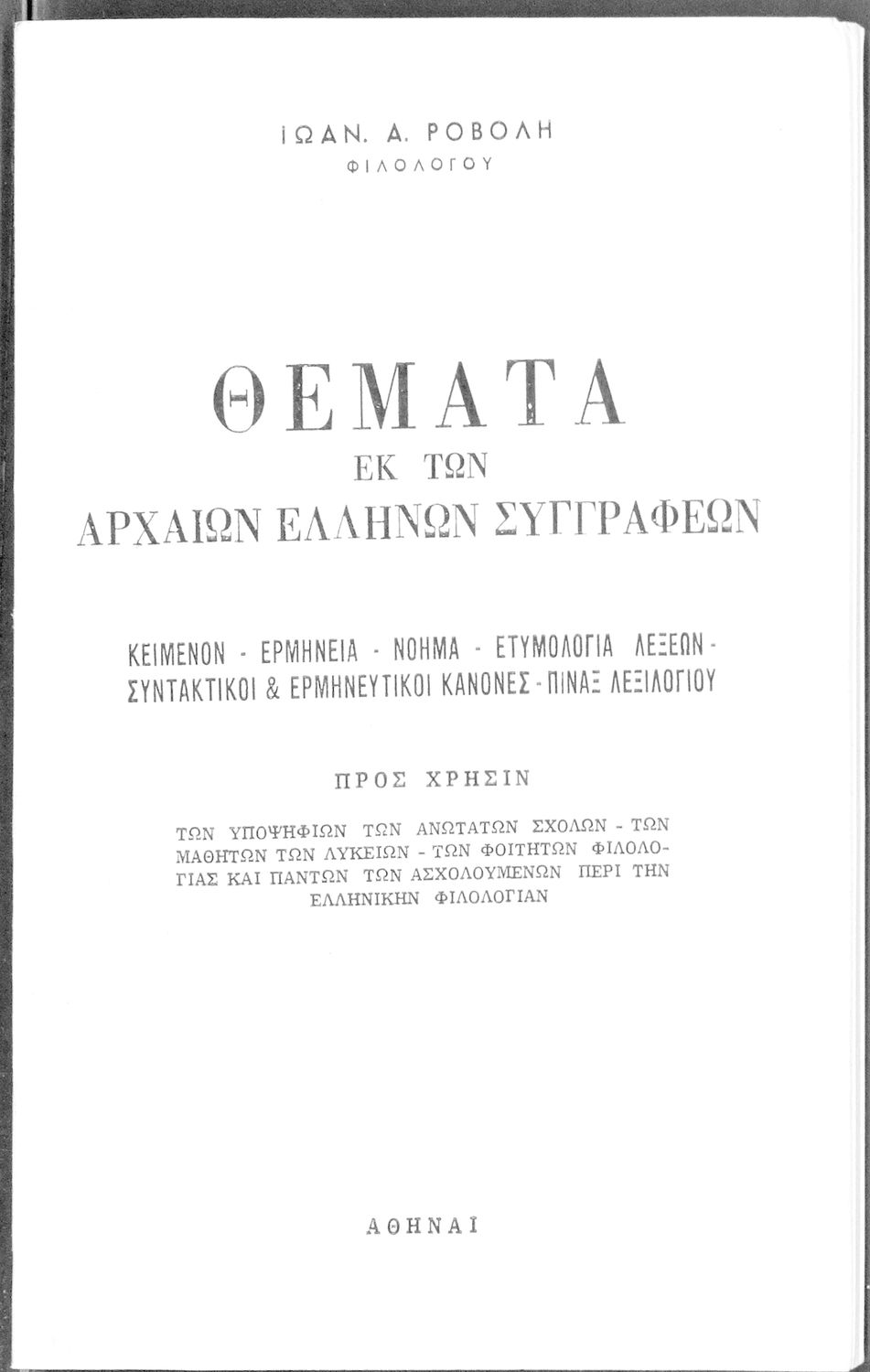Μαθητικό βοήθημα Αρχαίων Ελληνικών που περιλαμβάνει σύντομα κείμενα από την αρχαία ελληνική γραμματεία και ερμηνευτικές, συντακτικές και γραμματικές παρατηρήσεις.