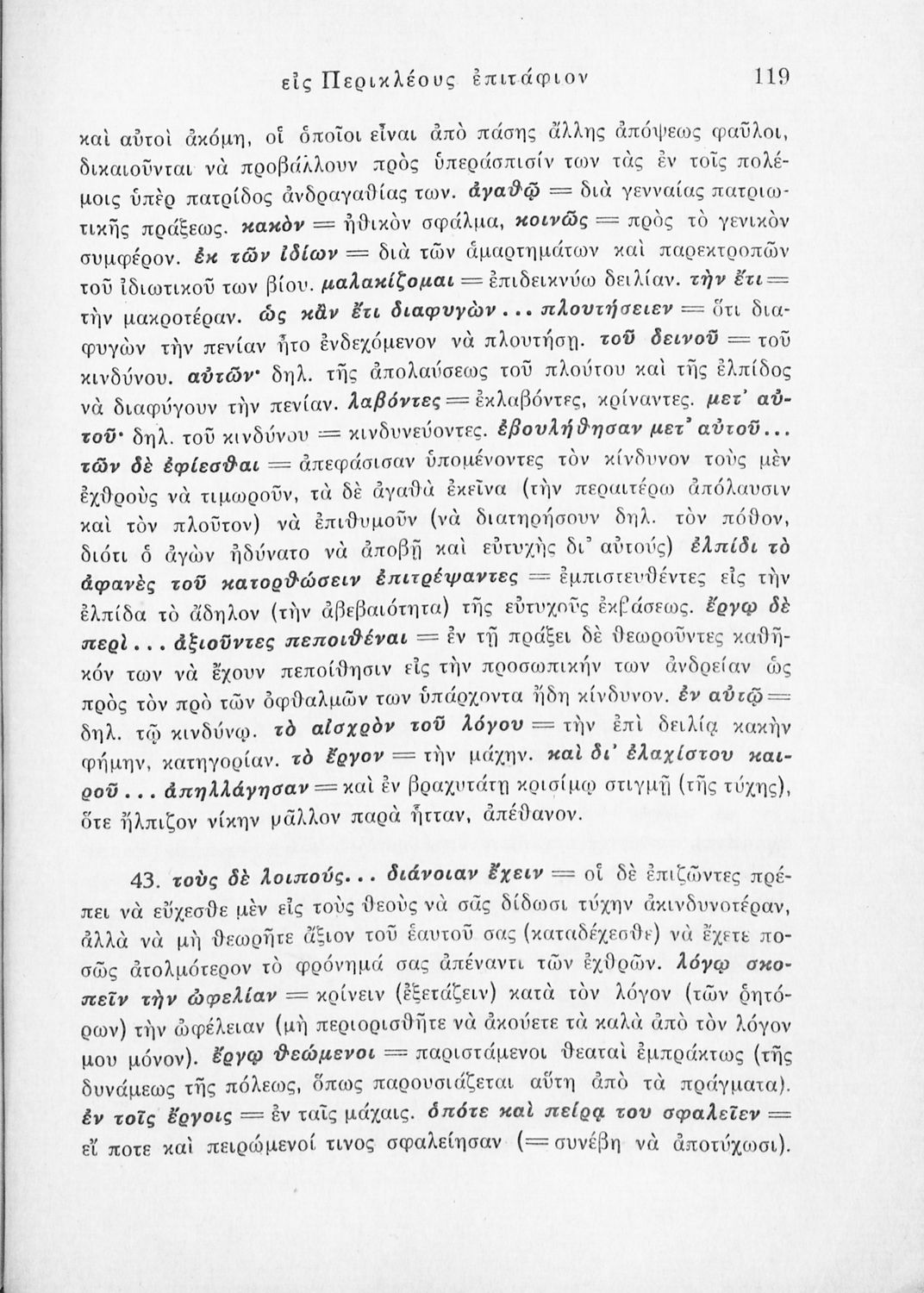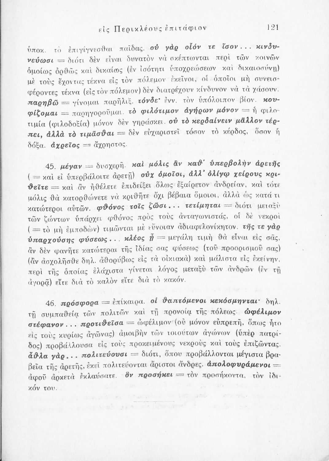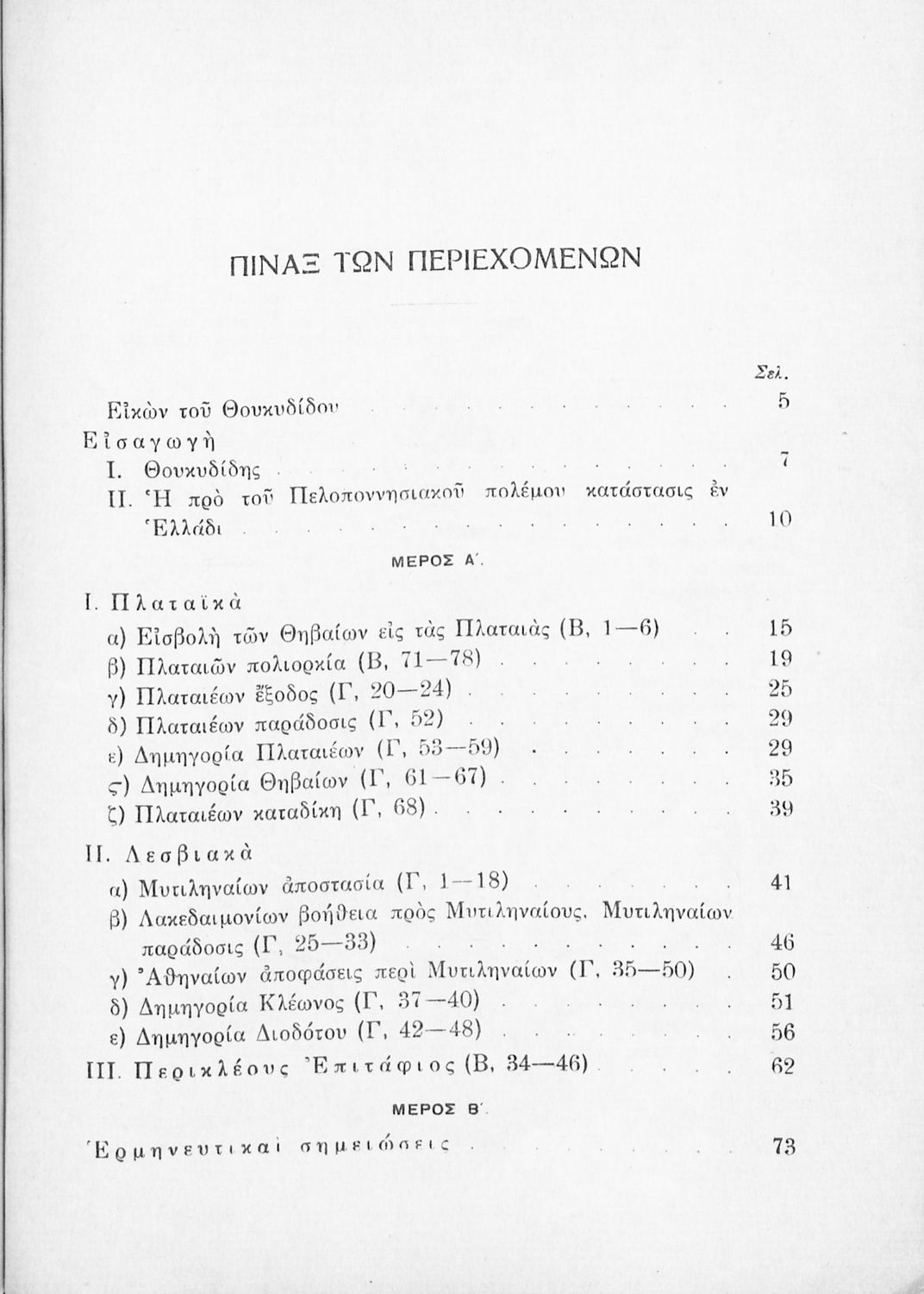 Σχολικό εγχειρίδιο Αρχαίων Ελληνικών για τις Δ΄, Ε΄ και ΣΤ΄ Γυμνασίου παλαιού τύπου που περιλαμβάνει σύντομο βιογραφικό σημείωμα του Θουκυδίδη, περιγραφή του ιστορικού πλαισίου, αποσπάσματα από τα Πλαταϊκά, τα Λεσβιακά και τον Επιτάφιο του Περικλή και ερμηνευτικές σημειώσεις.