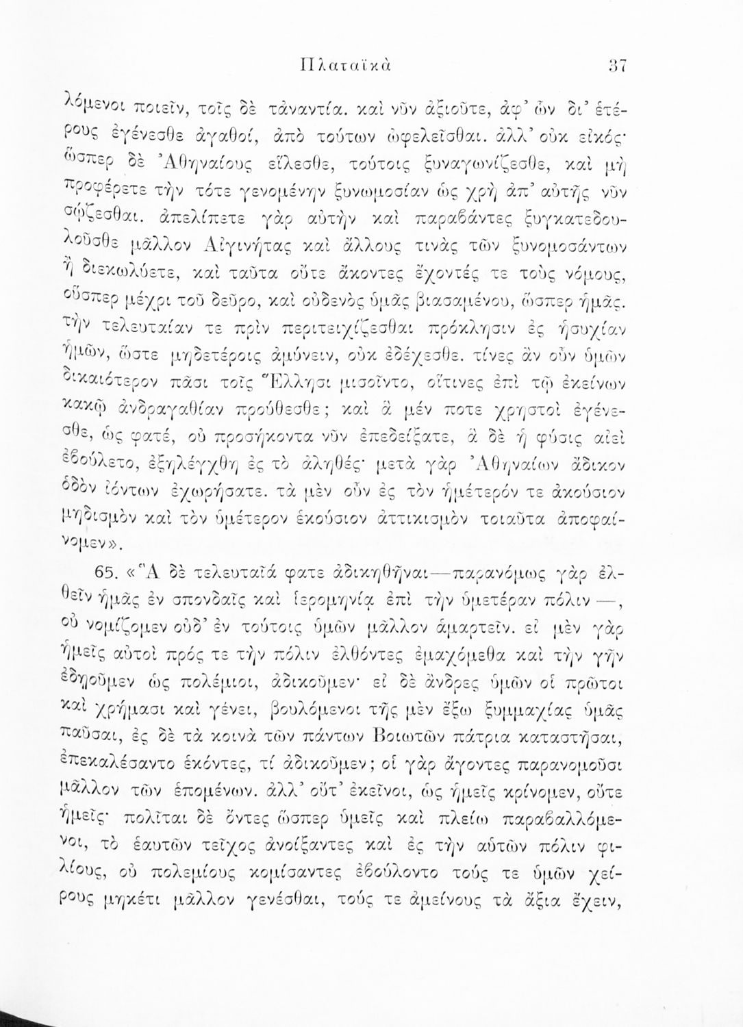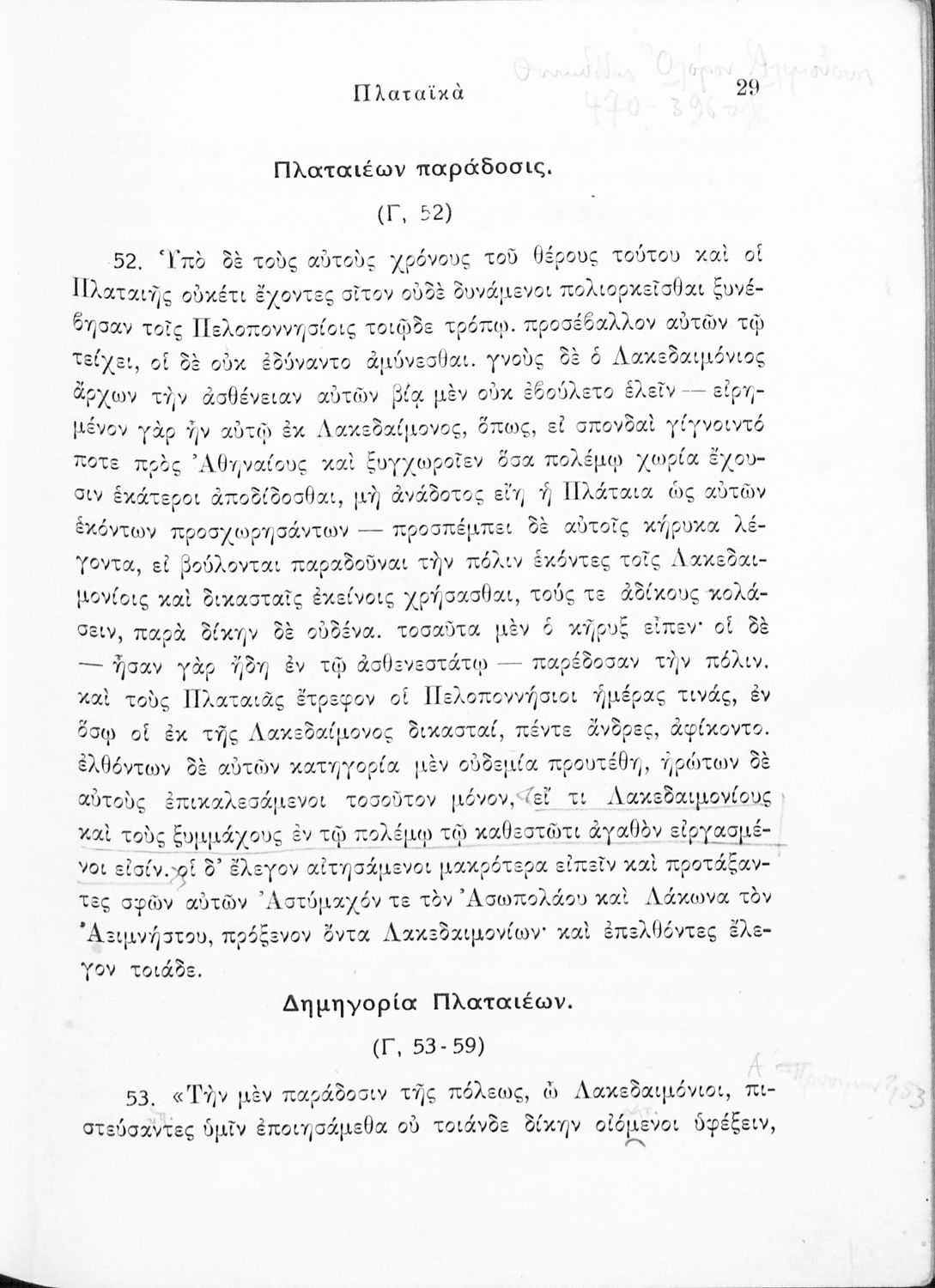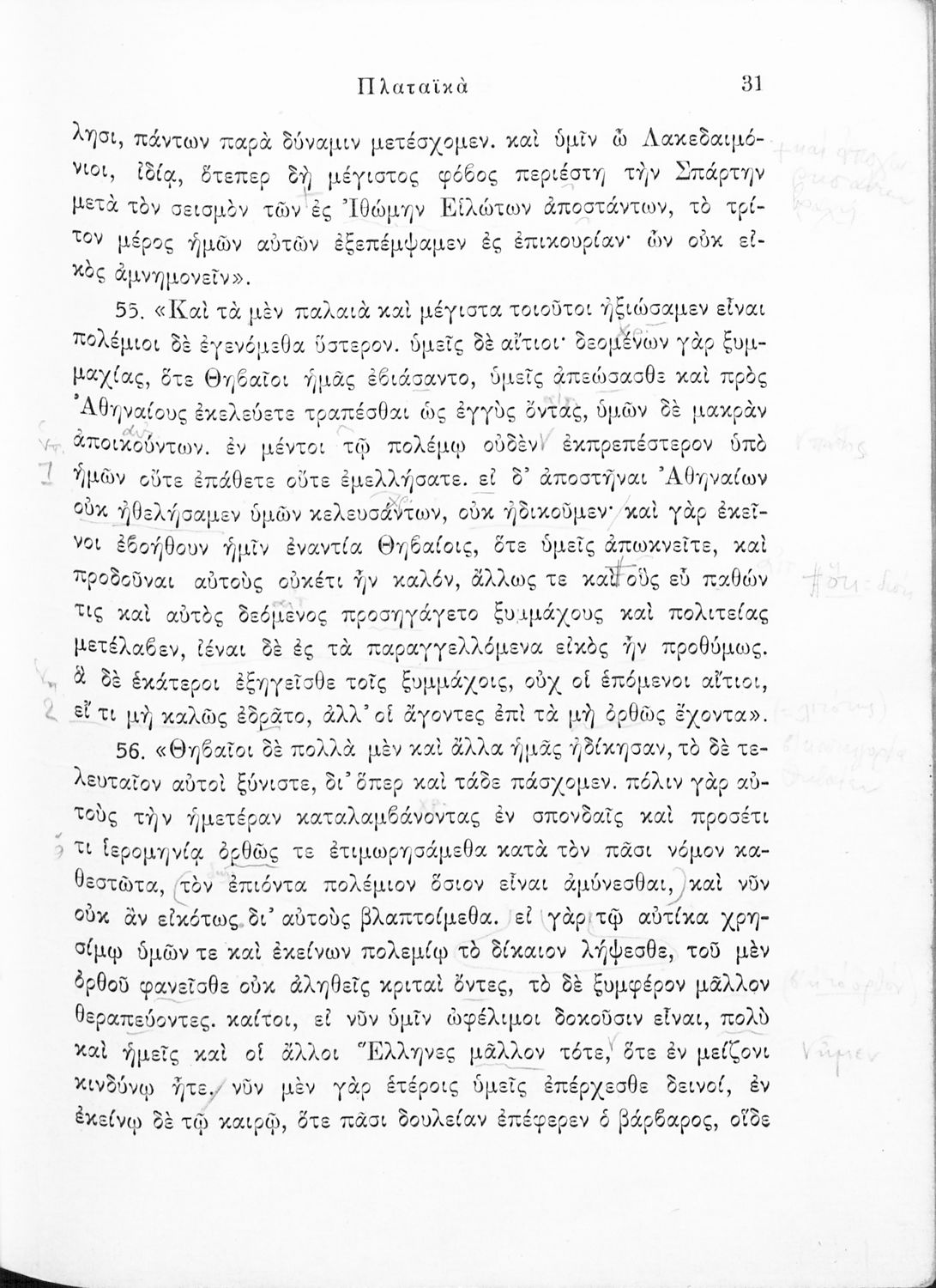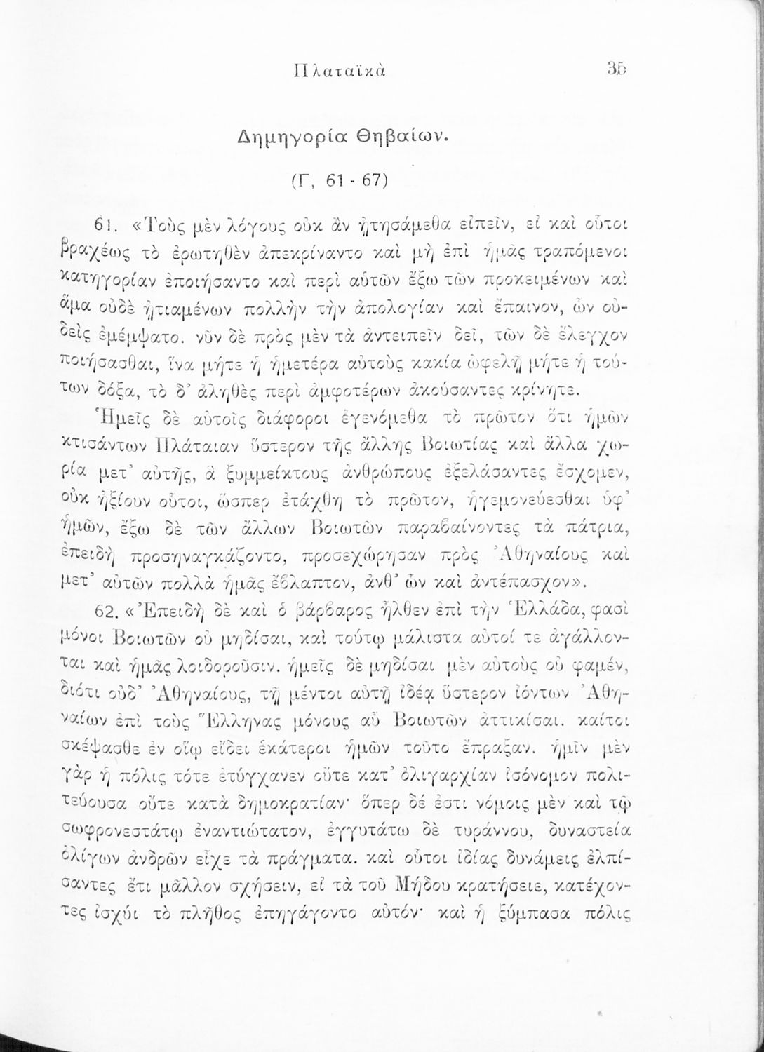Σχολικό εγχειρίδιο Αρχαίων Ελληνικών για τις Δ΄, Ε΄ και ΣΤ΄ Γυμνασίου παλαιού τύπου που περιλαμβάνει σύντομο βιογραφικό σημείωμα του Θουκυδίδη, περιγραφή του ιστορικού πλαισίου, αποσπάσματα από τα Πλαταϊκά, τα