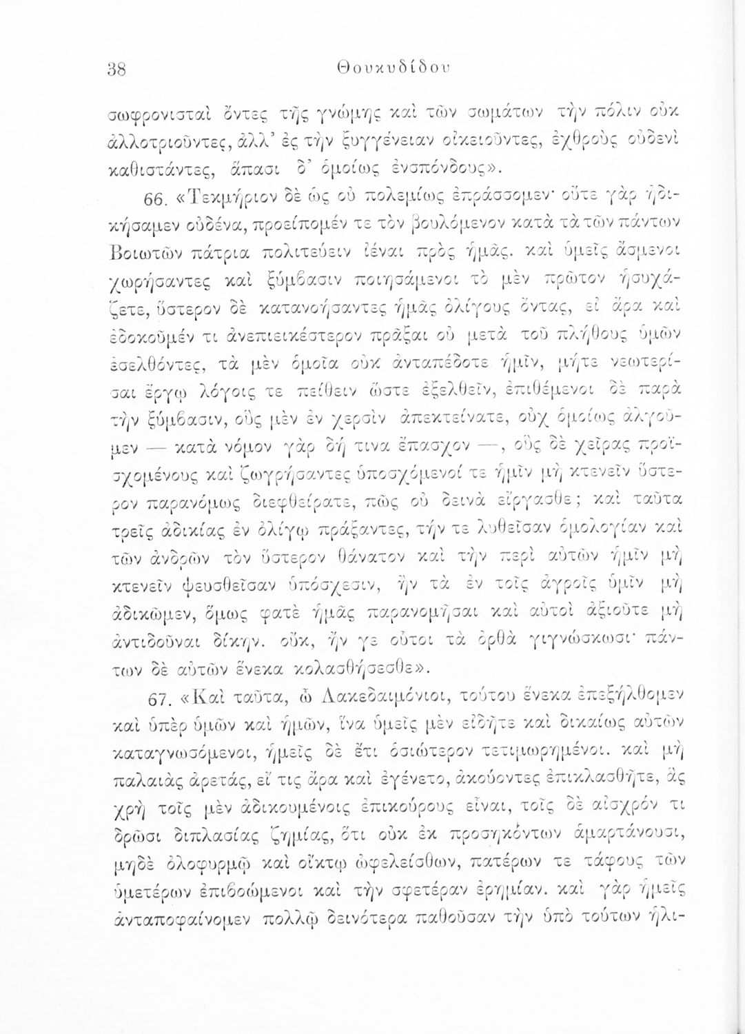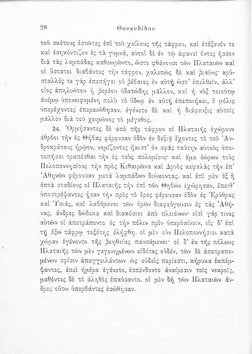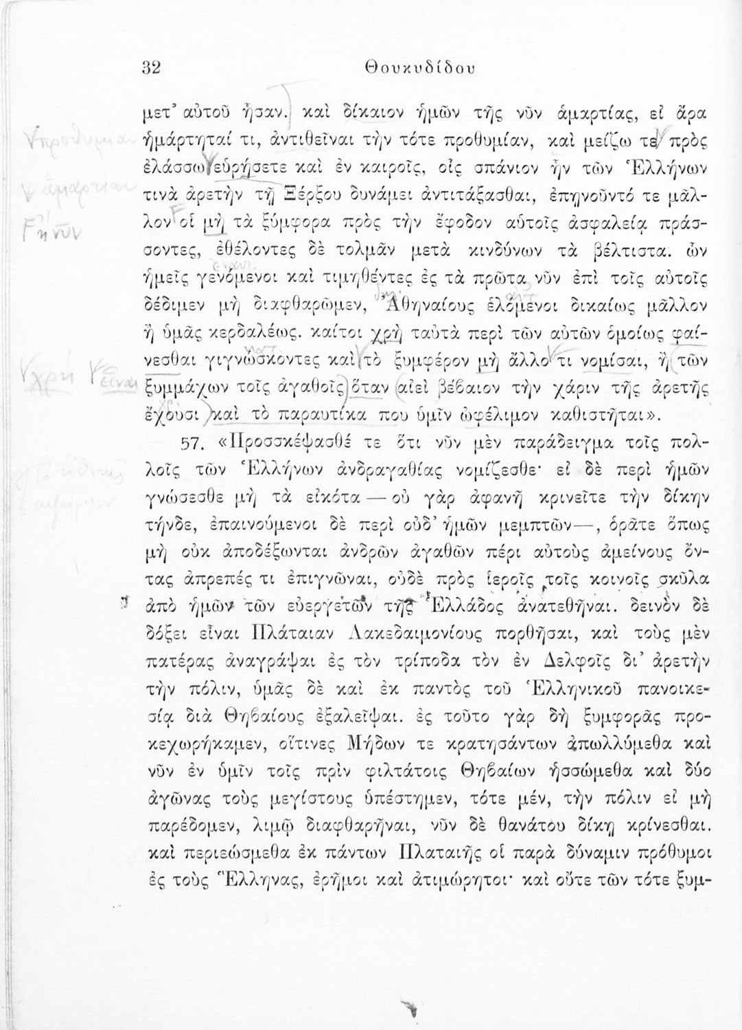 Σχολικό εγχειρίδιο Αρχαίων Ελληνικών για τις Δ΄, Ε΄ και ΣΤ΄ Γυμνασίου παλαιού τύπου που περιλαμβάνει σύντομο βιογραφικό σημείωμα του Θουκυδίδη, περιγραφή του ιστορικού πλαισίου, αποσπάσματα από τα Πλαταϊκά, τα Λεσβιακά και τον Επιτάφιο του Περικλή και ερμηνευτικές σημειώσεις.