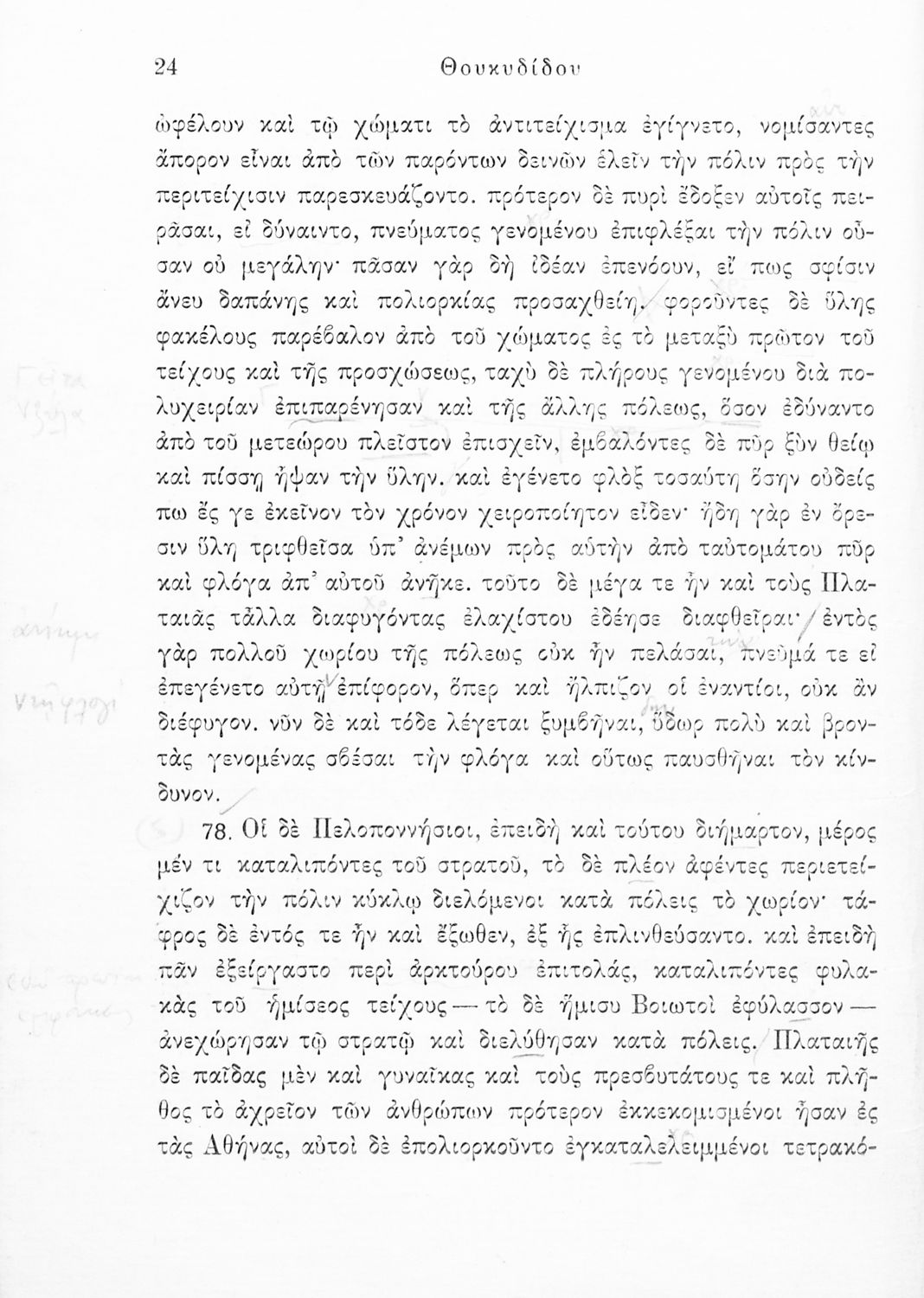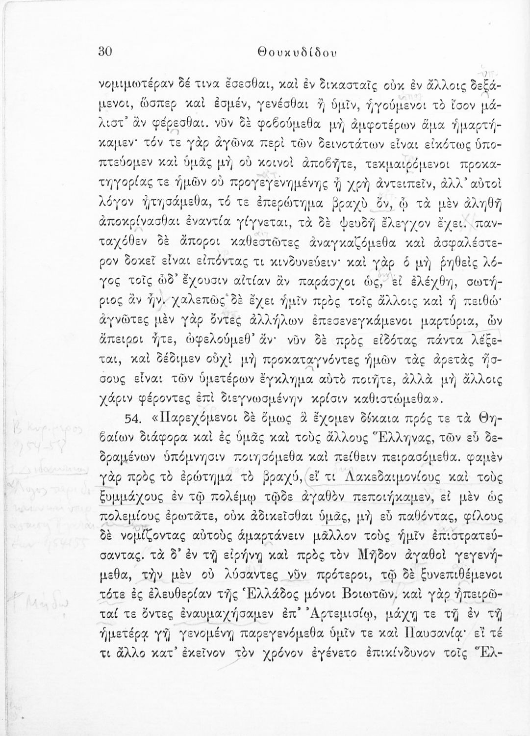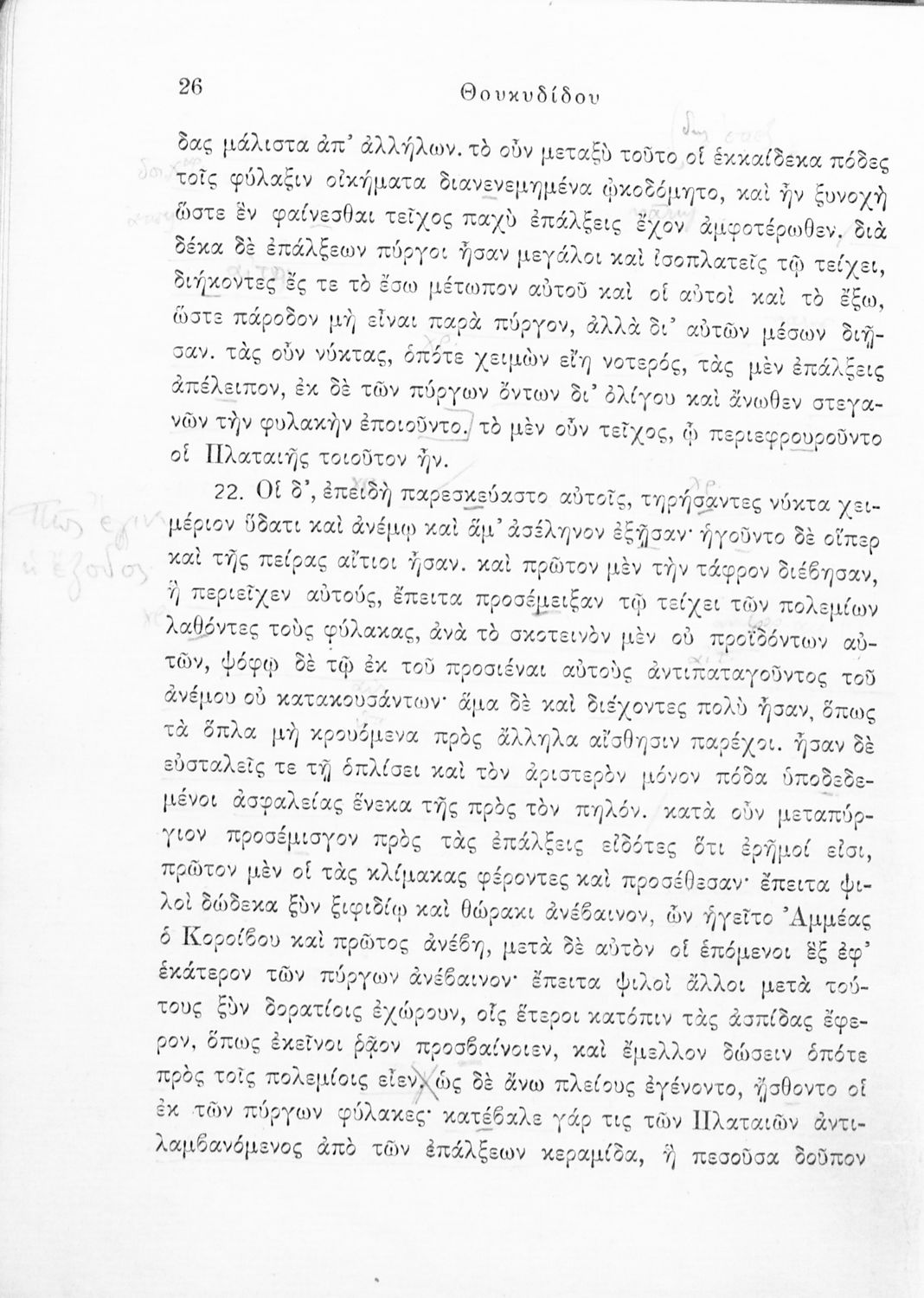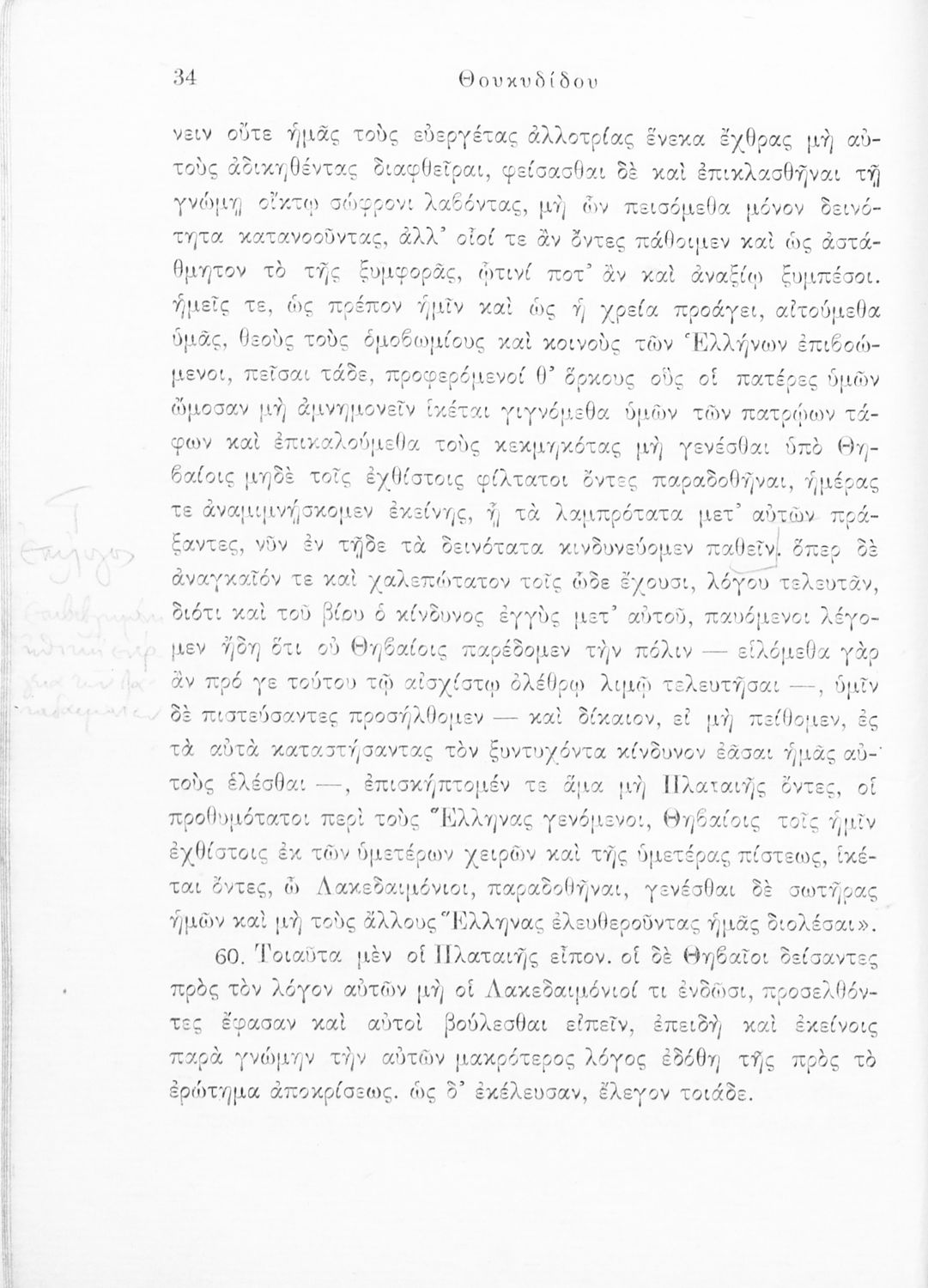 Σχολικό εγχειρίδιο Αρχαίων Ελληνικών για τις Δ΄, Ε΄ και ΣΤ΄ Γυμνασίου παλαιού τύπου που περιλαμβάνει σύντομο βιογραφικό σημείωμα του Θουκυδίδη, περιγραφή του ιστορικού πλαισίου, αποσπάσματα από τα Πλαταϊκά, τα Λεσβιακά και τον Επιτάφιο του Περικλή και ερμηνευτικές σημειώσεις.