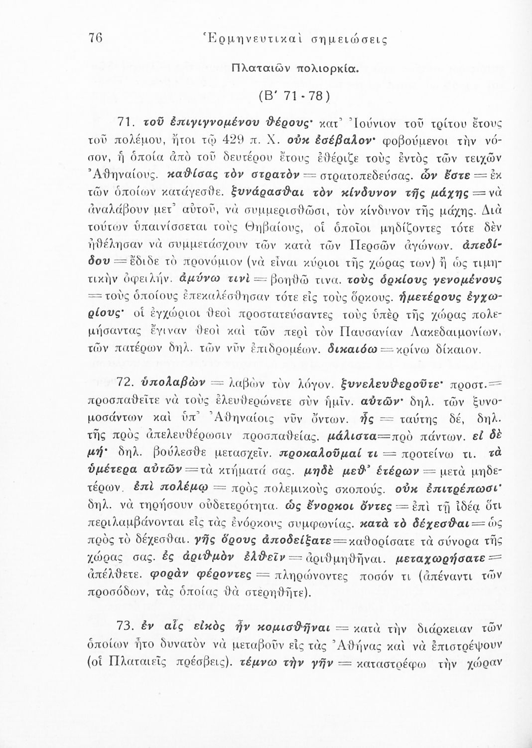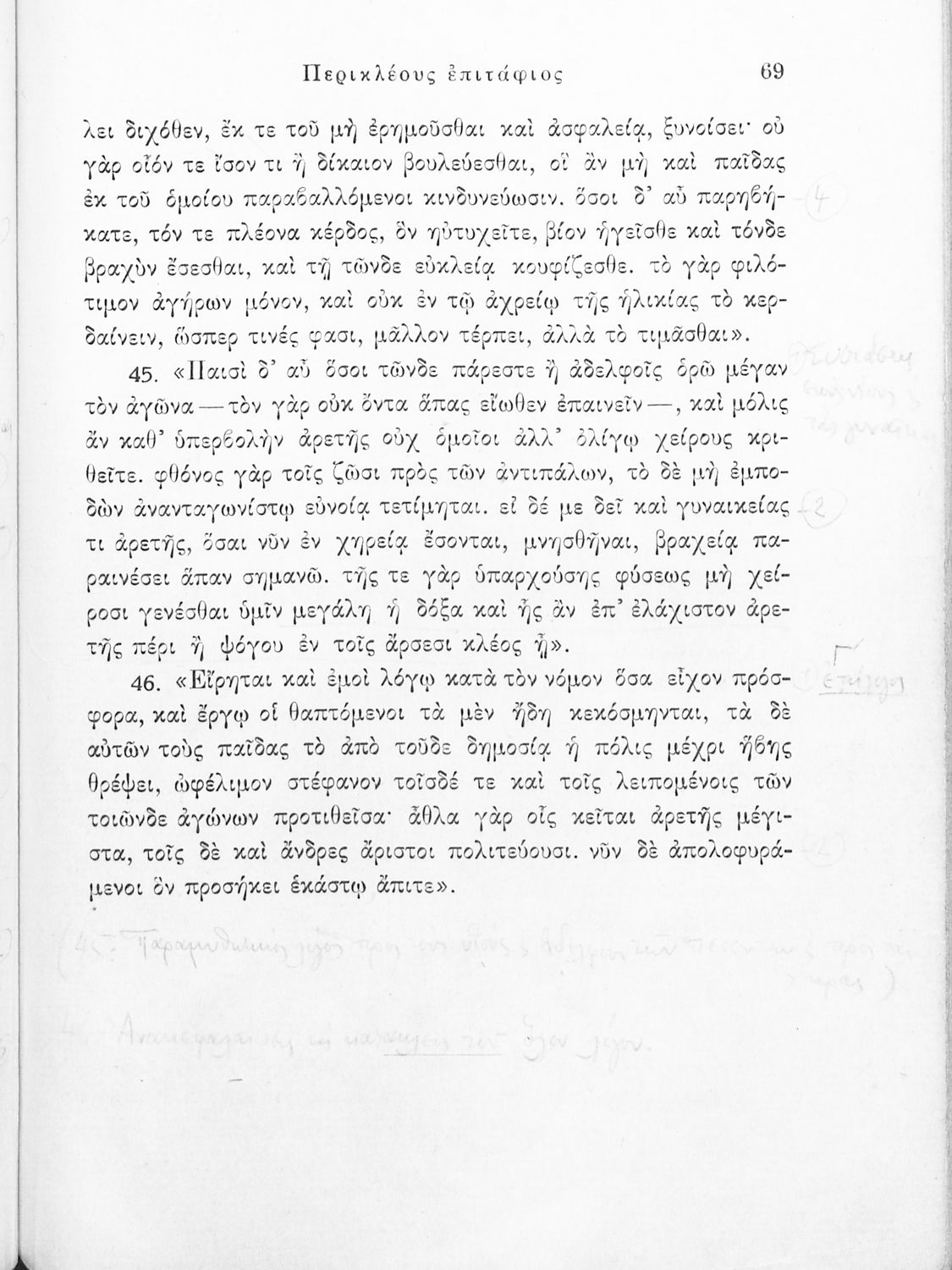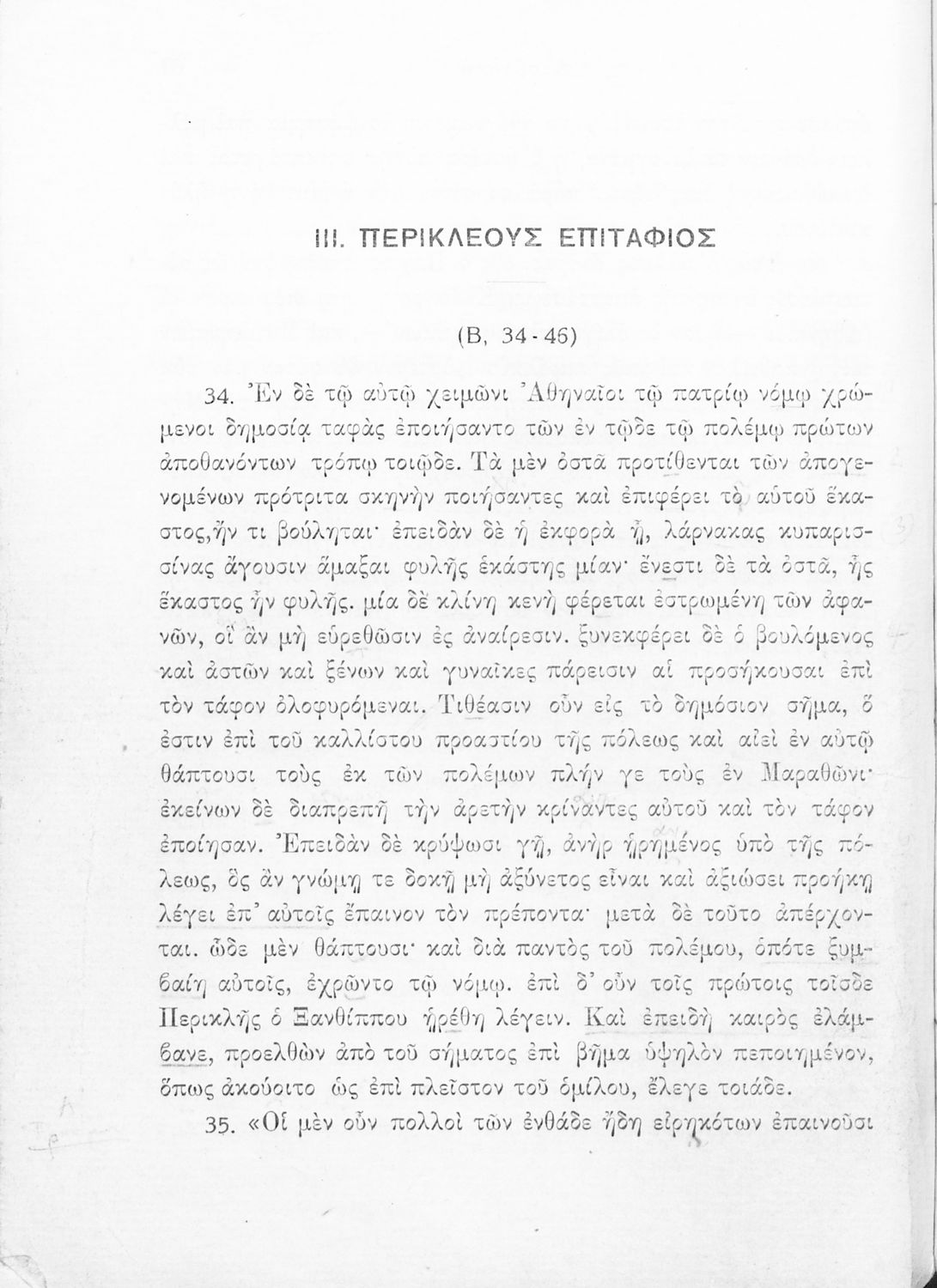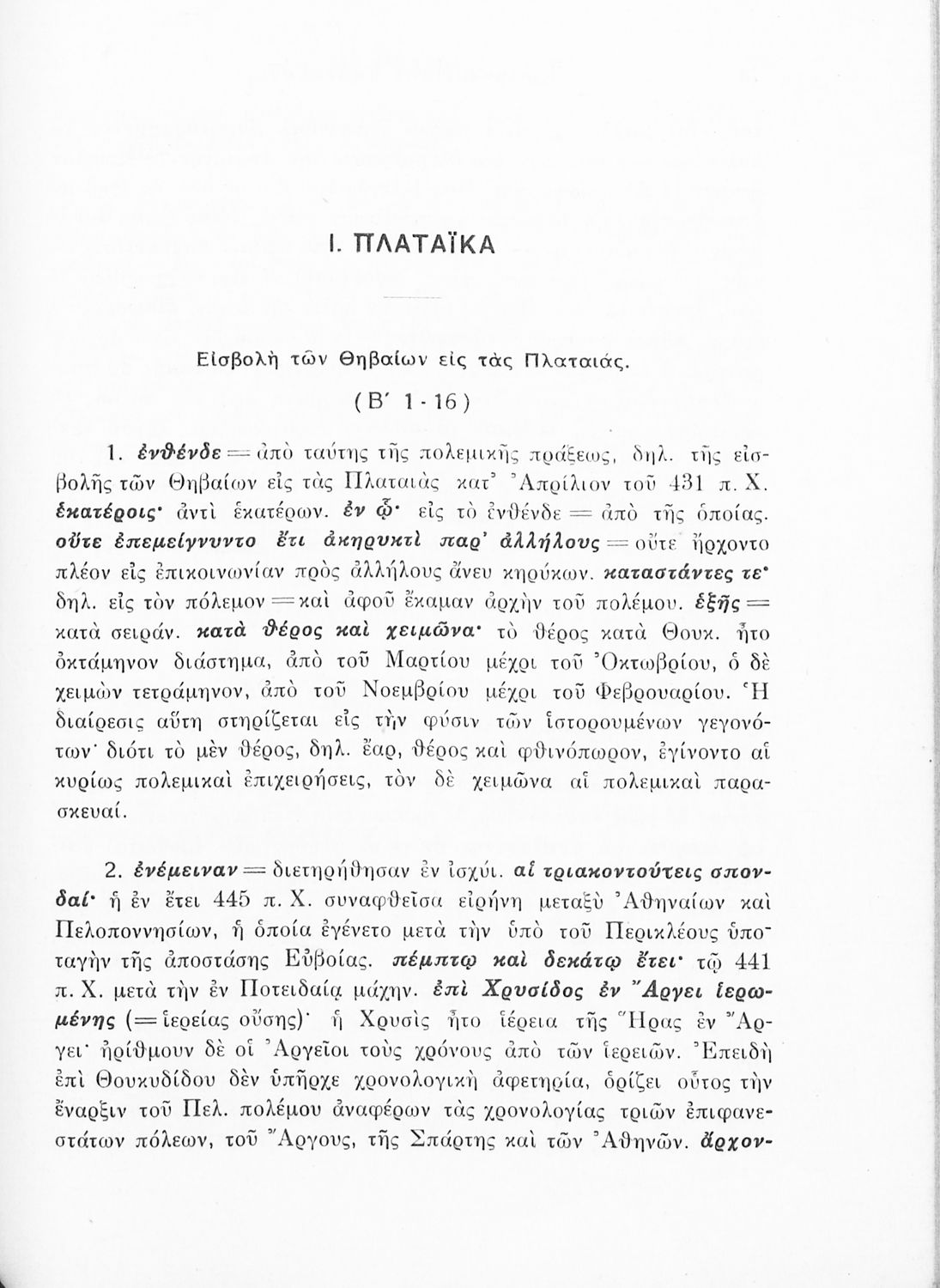 Σχολικό εγχειρίδιο Αρχαίων Ελληνικών για τις Δ΄, Ε΄ και ΣΤ΄ Γυμνασίου παλαιού τύπου που περιλαμβάνει σύντομο βιογραφικό σημείωμα του Θουκυδίδη, περιγραφή του ιστορικού πλαισίου, αποσπάσματα από τα Πλαταϊκά, τα Λεσβιακά και τον Επιτάφιο του Περικλή και ερμηνευτικές σημειώσεις.