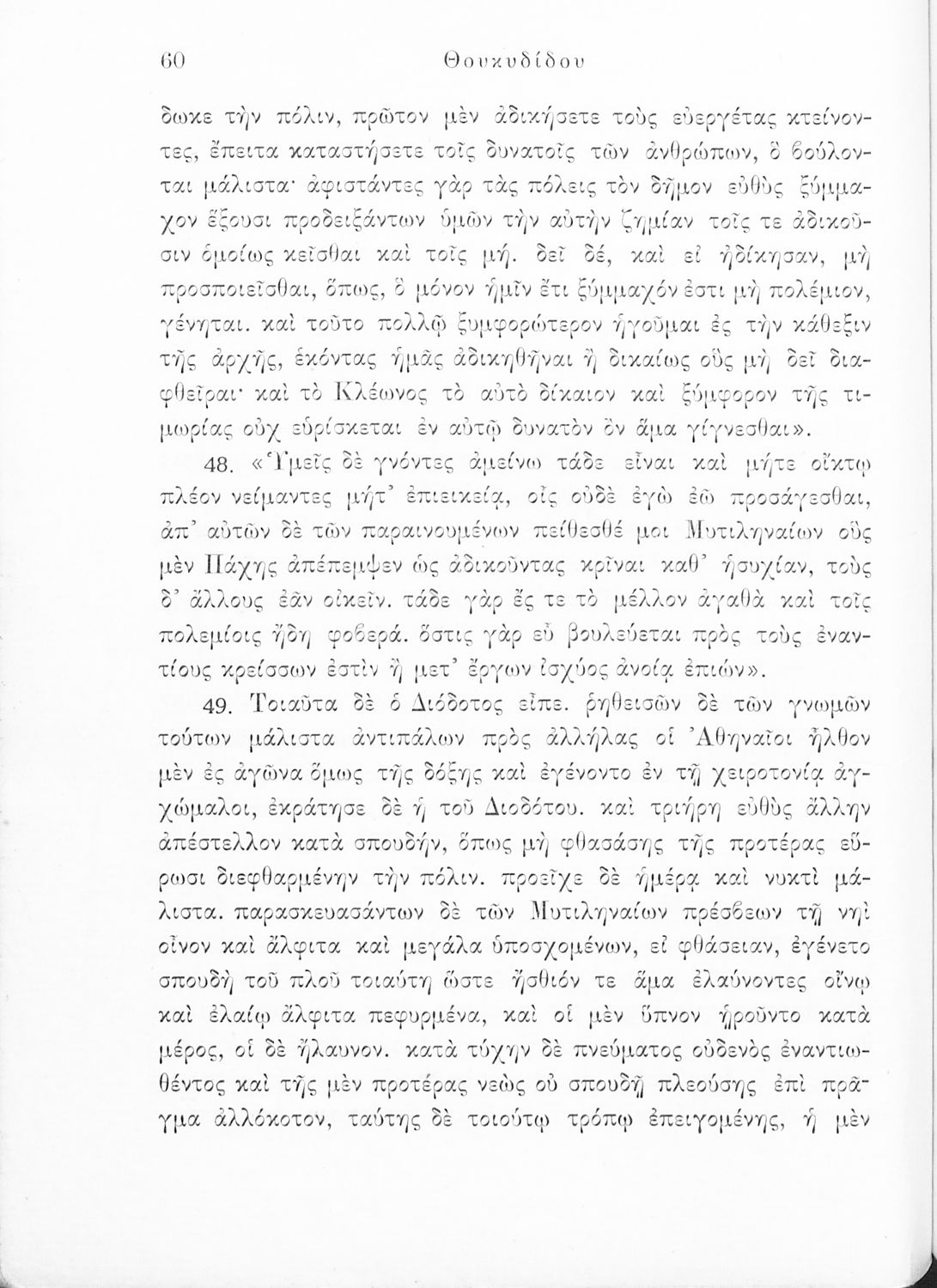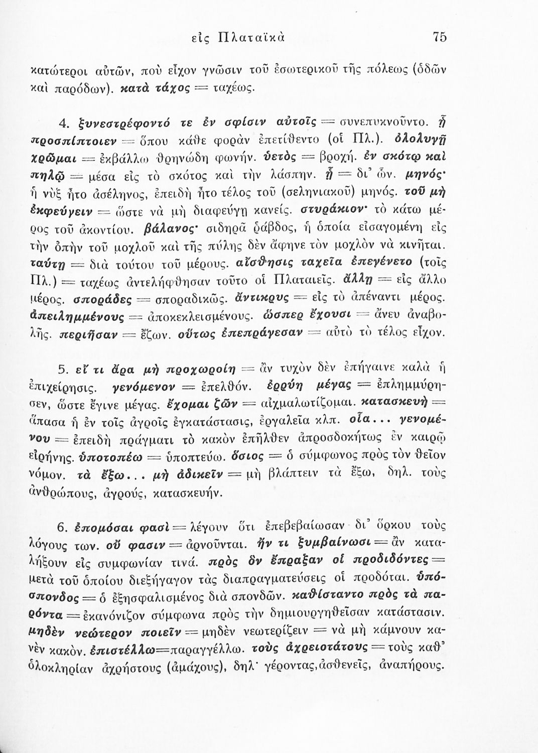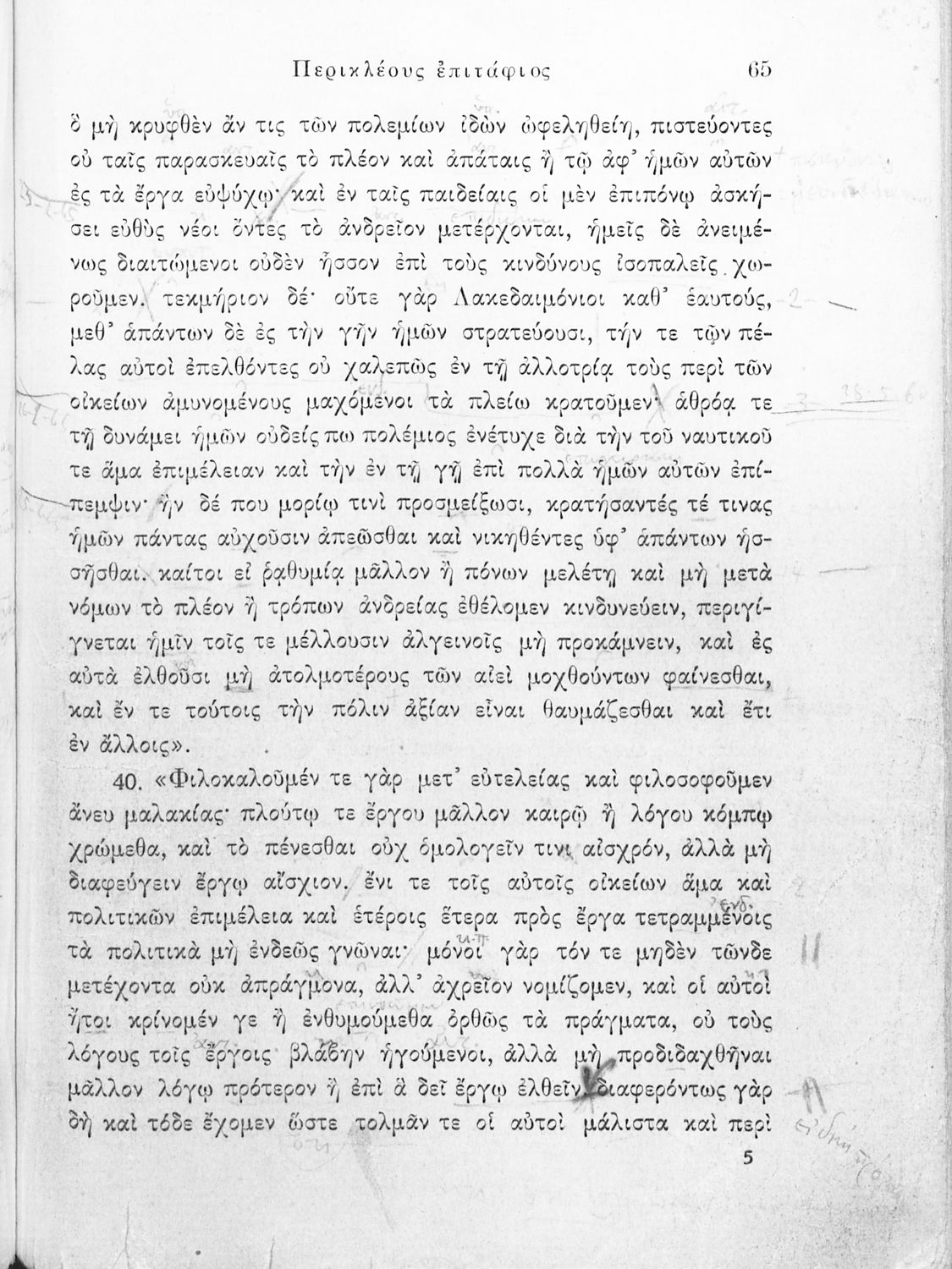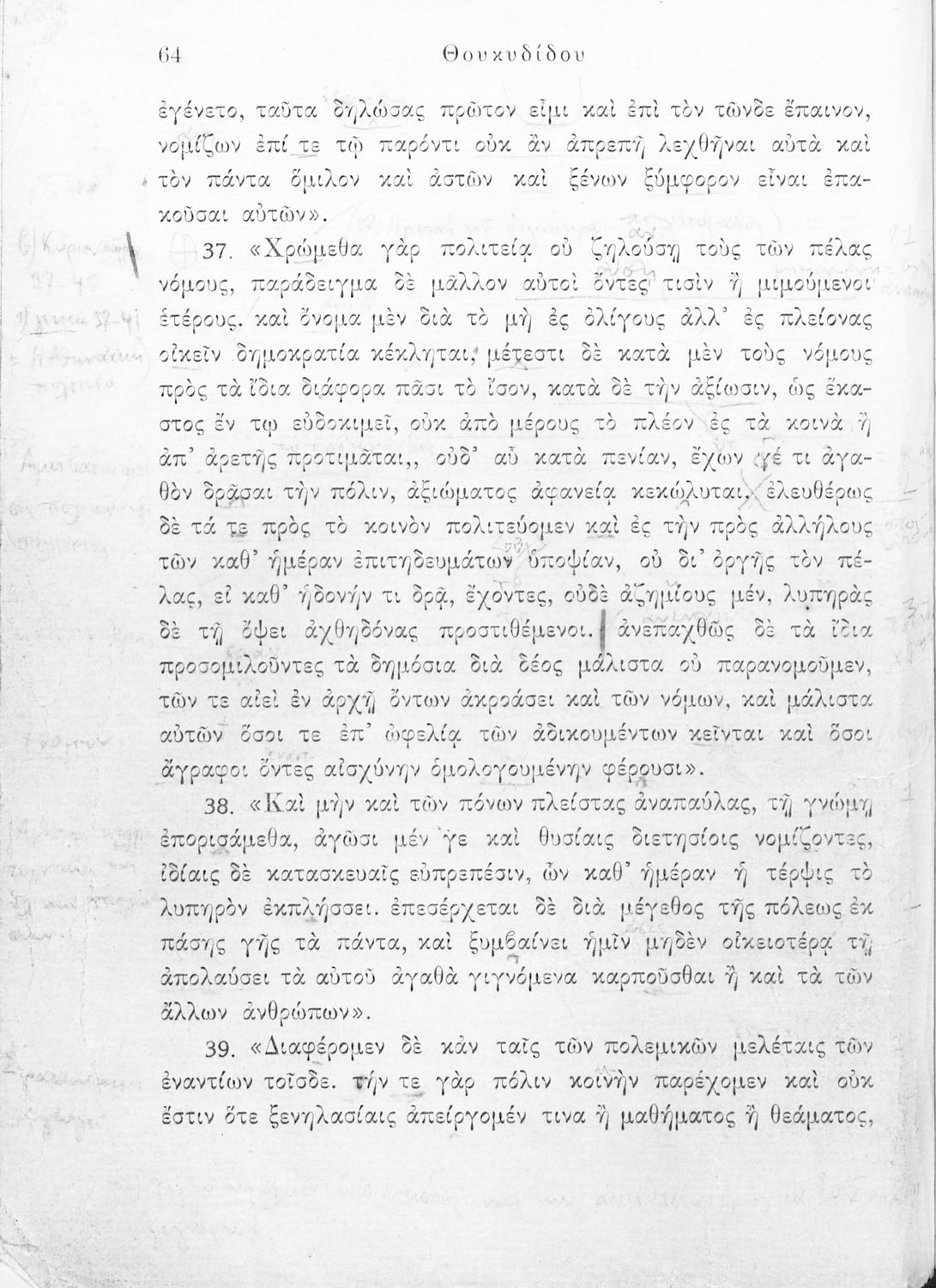 Σχολικό εγχειρίδιο Αρχαίων Ελληνικών για τις Δ΄, Ε΄ και ΣΤ΄ Γυμνασίου παλαιού τύπου που περιλαμβάνει σύντομο βιογραφικό σημείωμα του Θουκυδίδη, περιγραφή του ιστορικού πλαισίου, αποσπάσματα από τα Πλαταϊκά, τα Λεσβιακά και τον Επιτάφιο του Περικλή και ερμηνευτικές σημειώσεις.