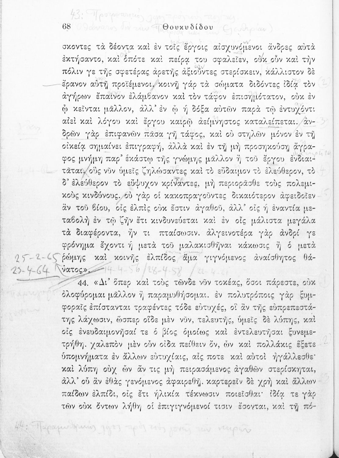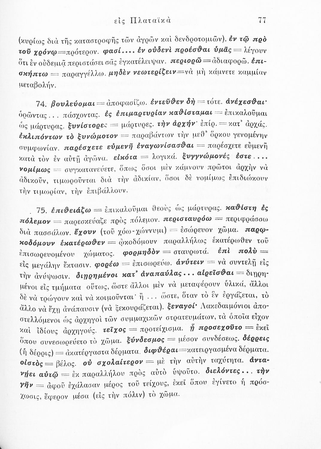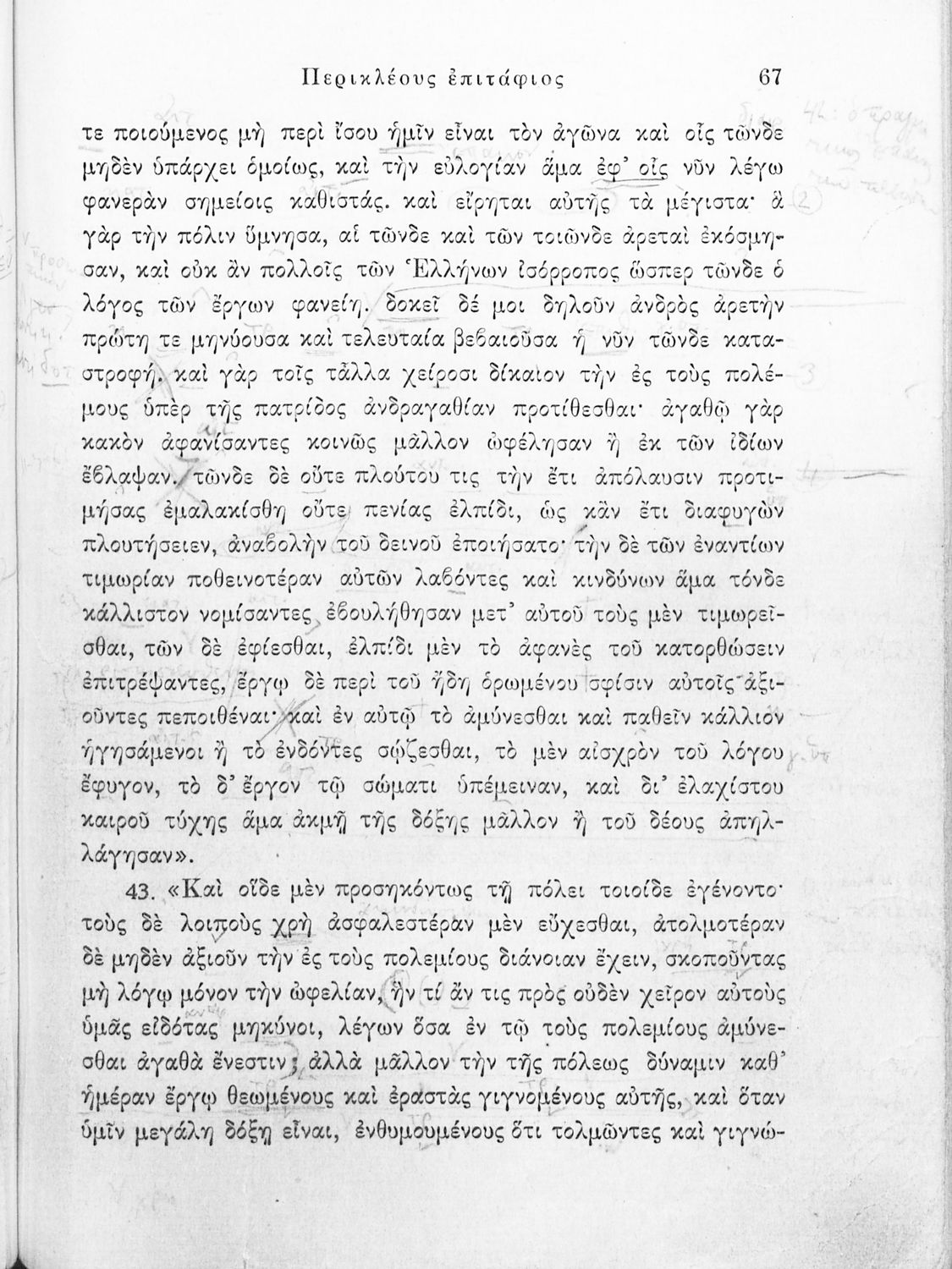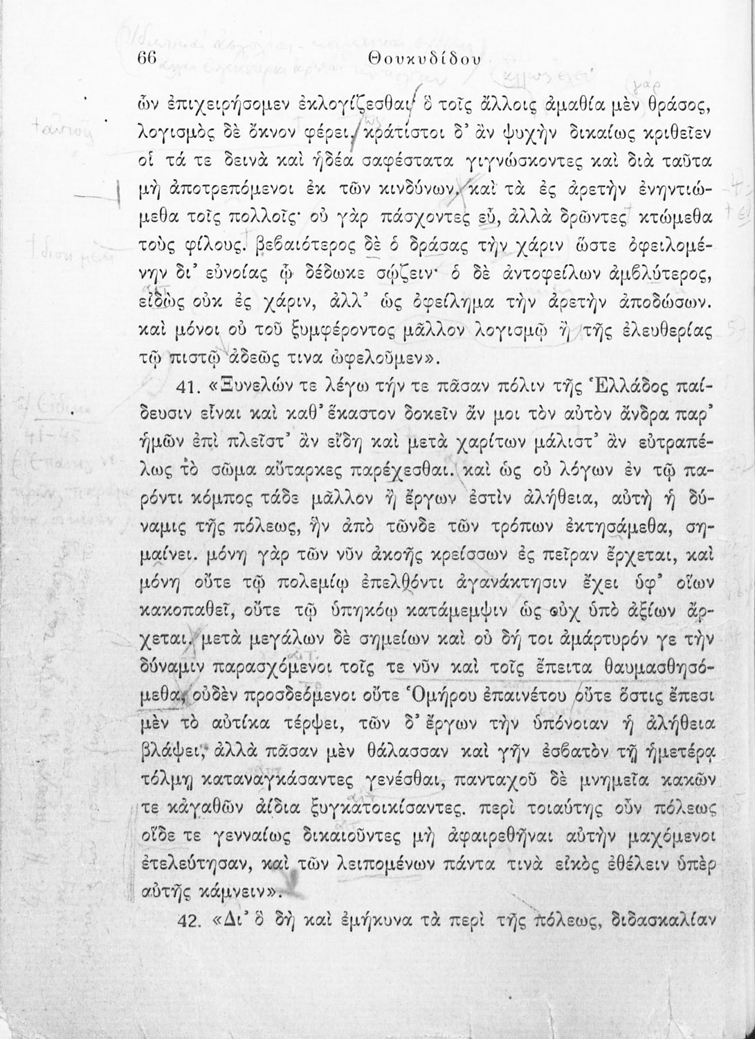 Σχολικό εγχειρίδιο Αρχαίων Ελληνικών για τις Δ΄, Ε΄ και ΣΤ΄ Γυμνασίου παλαιού τύπου που περιλαμβάνει σύντομο βιογραφικό σημείωμα του Θουκυδίδη, περιγραφή του ιστορικού πλαισίου, αποσπάσματα από τα Πλαταϊκά, τα Λεσβιακά και τον Επιτάφιο του Περικλή και ερμηνευτικές σημειώσεις.