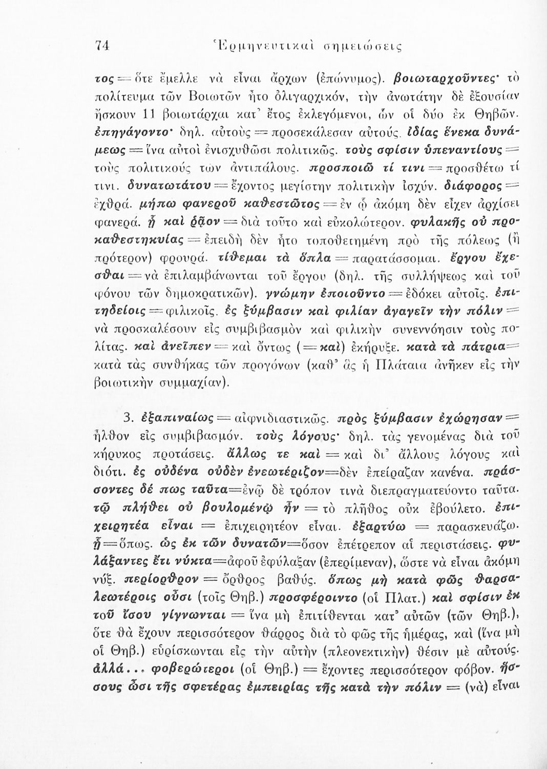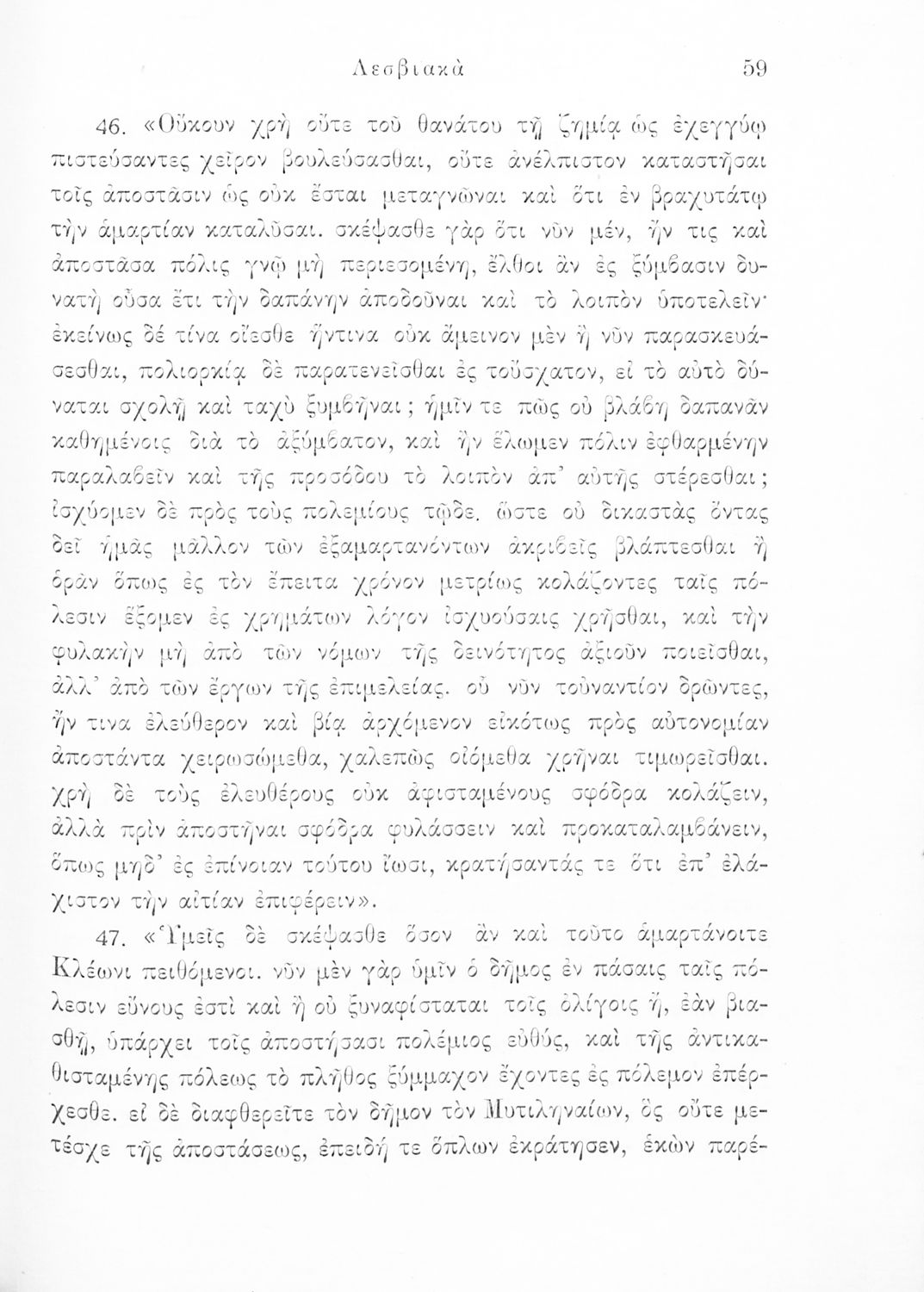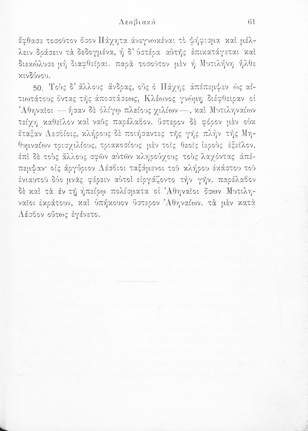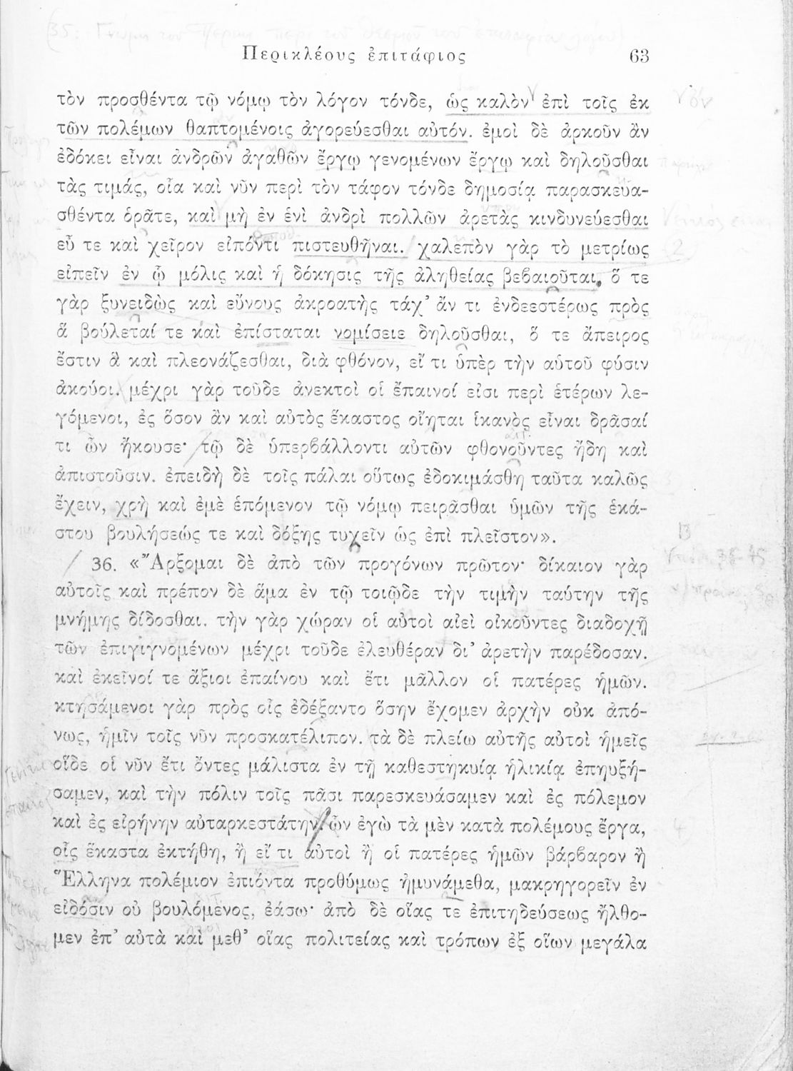Σχολικό εγχειρίδιο Αρχαίων Ελληνικών για τις Δ΄, Ε΄ και ΣΤ΄ Γυμνασίου παλαιού τύπου που περιλαμβάνει σύντομο βιογραφικό σημείωμα του Θουκυδίδη, περιγραφή του ιστορικού πλαισίου, αποσπάσματα από τα Πλαταϊκά, τα Λεσβιακά και τον Επιτάφιο του Περικλή και ερμηνευτικές σημειώσεις.