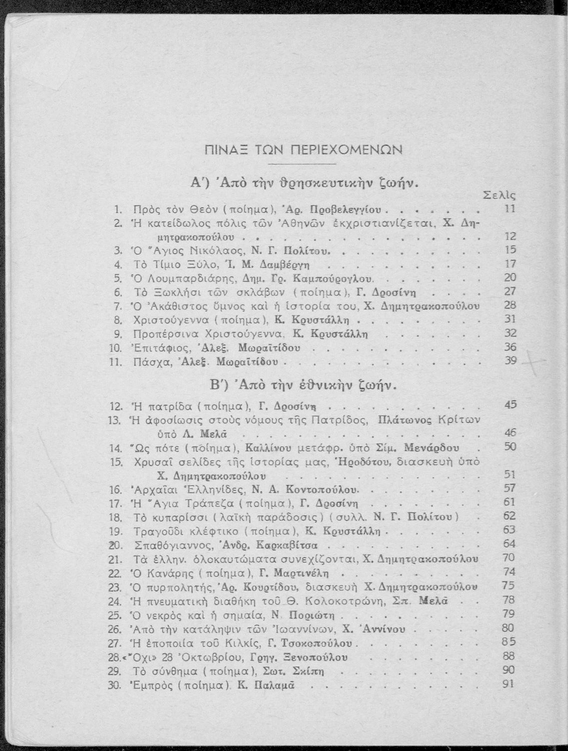 Σχολικό εγχειρίδιο Νέων Ελληνικών Δ΄ Γυμνασίου και Β΄ Αστικού Σχολείου που περιέχει πεζά και ποιήματα Ελλήνων συγγραφέων εμπνευσμένα από τη θρησκευτική και κοινωνική ζωή, την ελληνική μυθολογία, την αρχαία και
