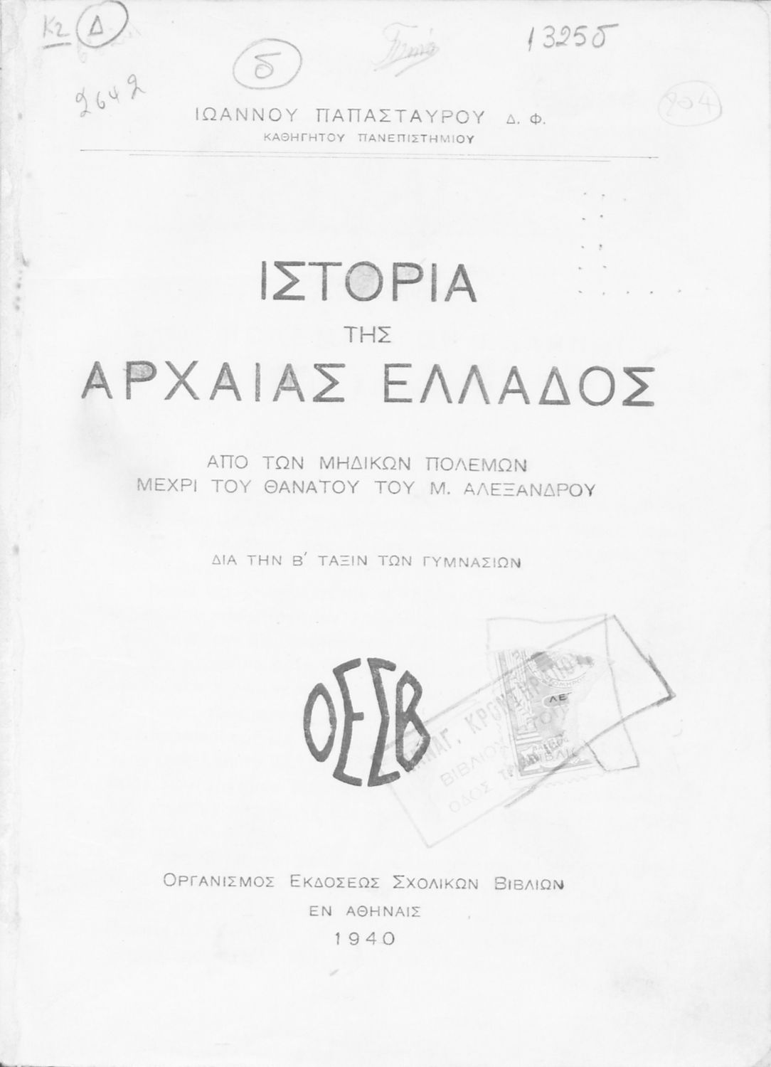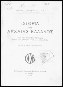 Κωδικός αναγνώρισης: 05-00204 Τίτλος: Ιστορία της Αρχαίας Ελλάδος. Από των Μηδικών πολέμων μέχρι του θανάτου του Μ. Αλεξάνδρου. Διά την Β΄ τάξιν των Γυμνασίων Συγγραφέας: Ιωάννης Παπασταύρου Μέγεθος και υπόστρωμα: Σχολικό εγχειρίδιο, 20εκ., σκληρό εξώφυλλο, 184 σελίδες. Σκίτσα, χάρτης, εικόνες (ασπρόμαυρα). |