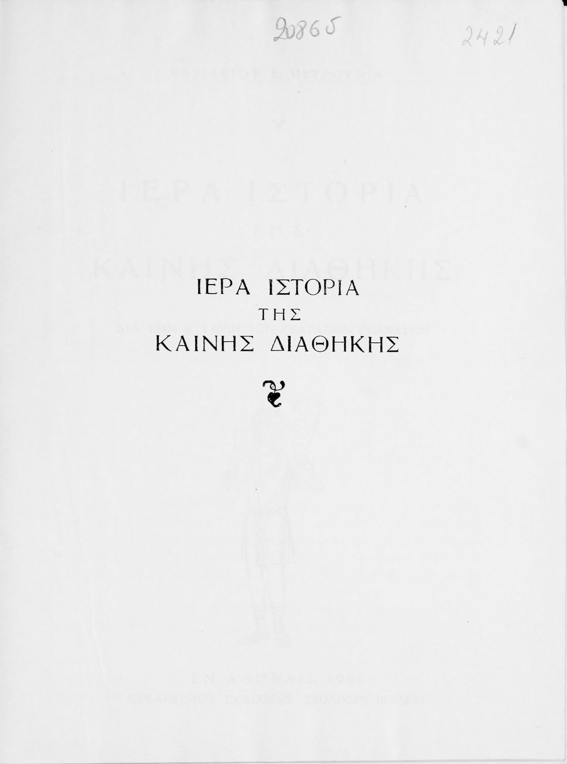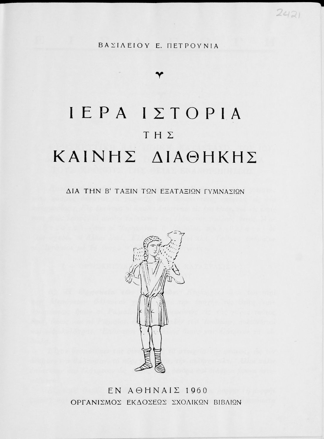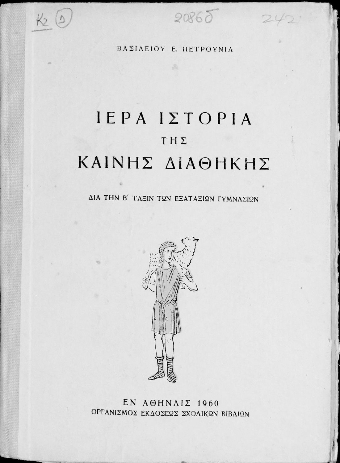 Κωδικός αναγνώρισης: 05-00205 Τίτλος: Ιερά Ιστορία της Καινής Διαθήκης Συγγραφέας: Βασίλειος Ε. Πετρούνιας Μέγεθος και υπόστρωμα: Σχολικό εγχειρίδιο, 20εκ., σκληρό εξώφυλλο, 169 σελίδες. Εικόνες (ασπρόμαυρες). |