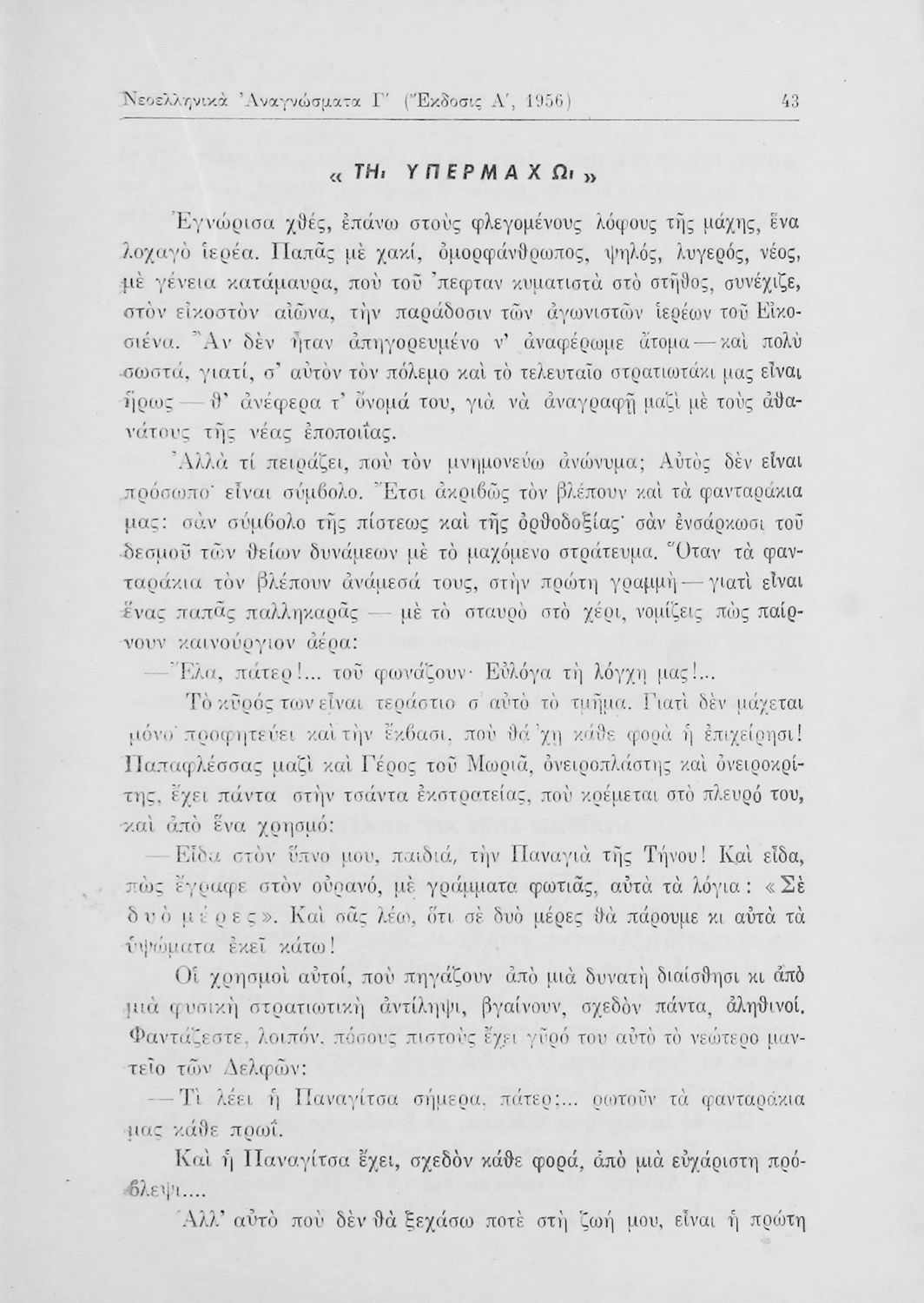 Σχολικό εγχειρίδιο Νέων Ελληνικών Γ΄ Γυμνασίου και Α' Αστικού Σχολείου που περιέχει πεζά και ποιήματα Ελλήνων συγγραφέων εμπνευσμένα από τη θρησκευτική και κοινωνική ζωή, την ελληνική μυθολογία, την αρχαία και