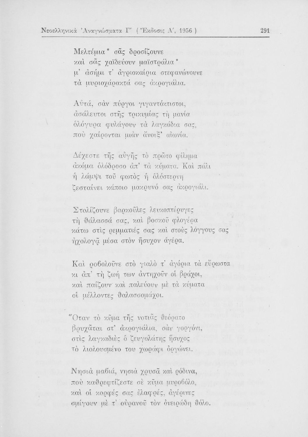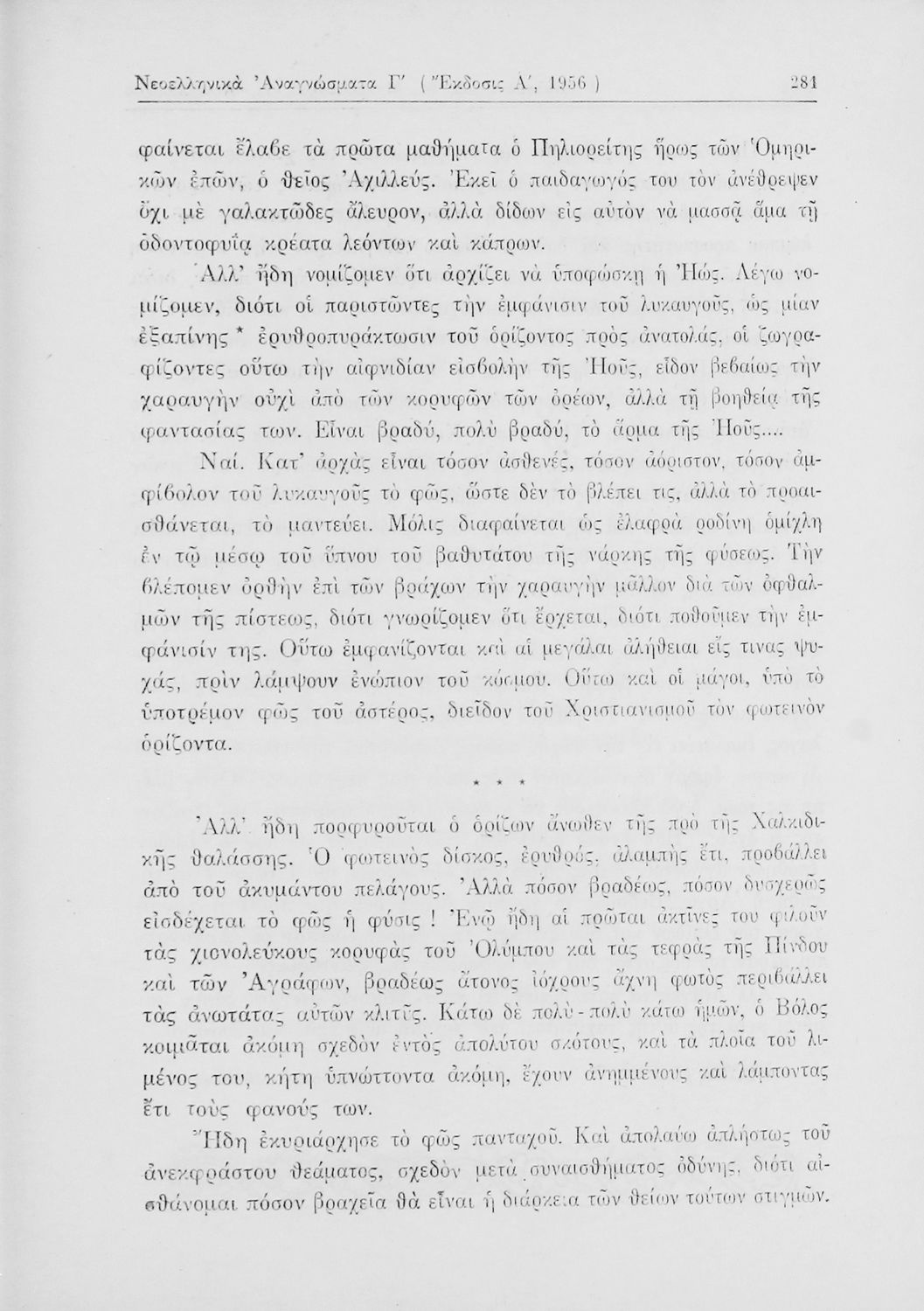 Σχολικό εγχειρίδιο Νέων Ελληνικών Γ΄ Γυμνασίου που περιέχει ποιήματα και πεζά Ελλήνων συγγραφέων εμπνευσμένα από τη θρησκευτική, οικογενειακή και κοινωνική ζωή, την σύγχρονή ελληνική ιστορία και την ελληνική φύση. Περιέχει παράρτημα με βιογραφίες των συγγραφέων και λεξιλόγιο.