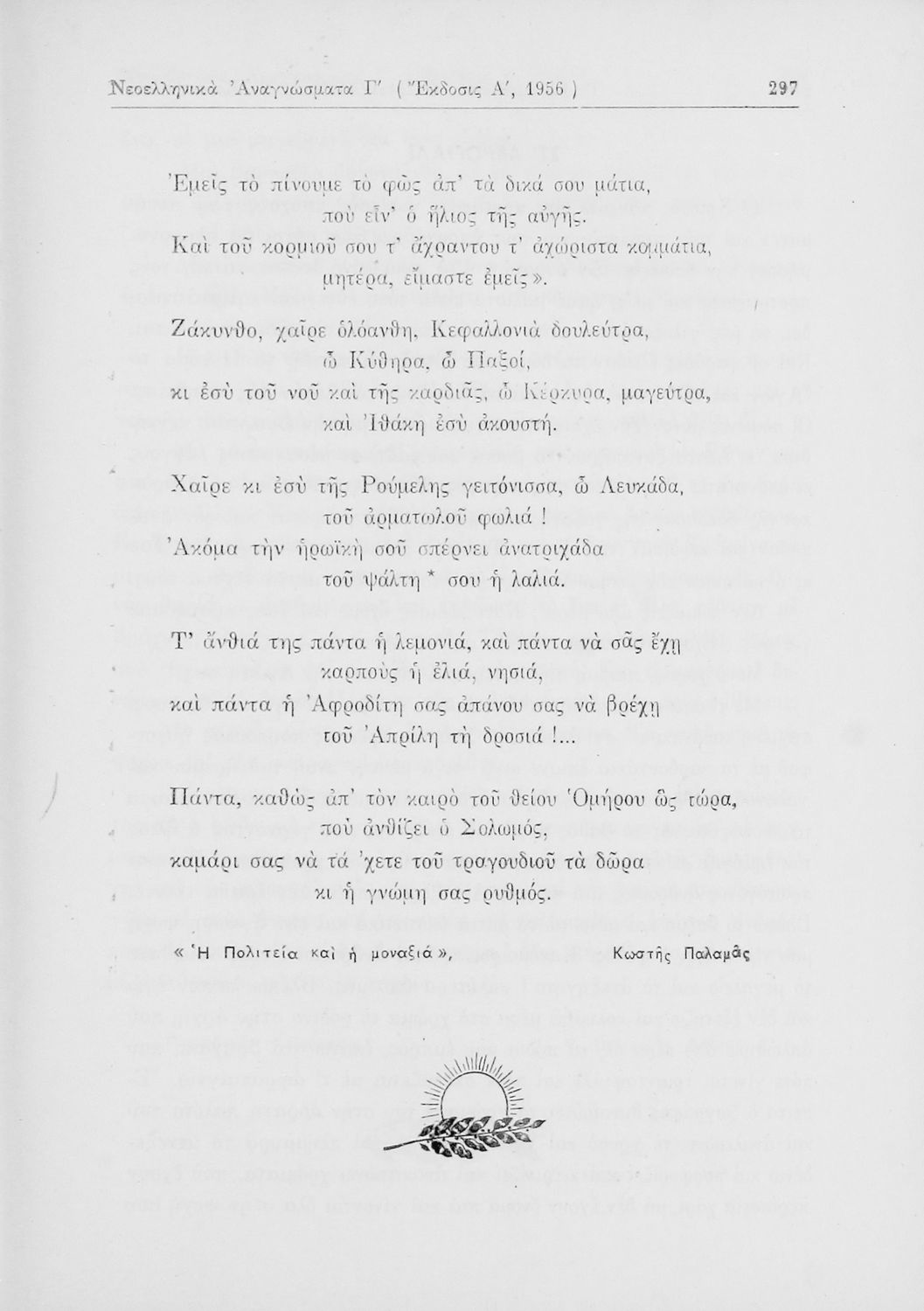 Σχολικό εγχειρίδιο Νέων Ελληνικών Γ΄ Γυμνασίου που περιέχει ποιήματα και πεζά Ελλήνων συγγραφέων εμπνευσμένα από τη θρησκευτική, οικογενειακή και κοινωνική ζωή, την σύγχρονή ελληνική ιστορία και την ελληνική ...