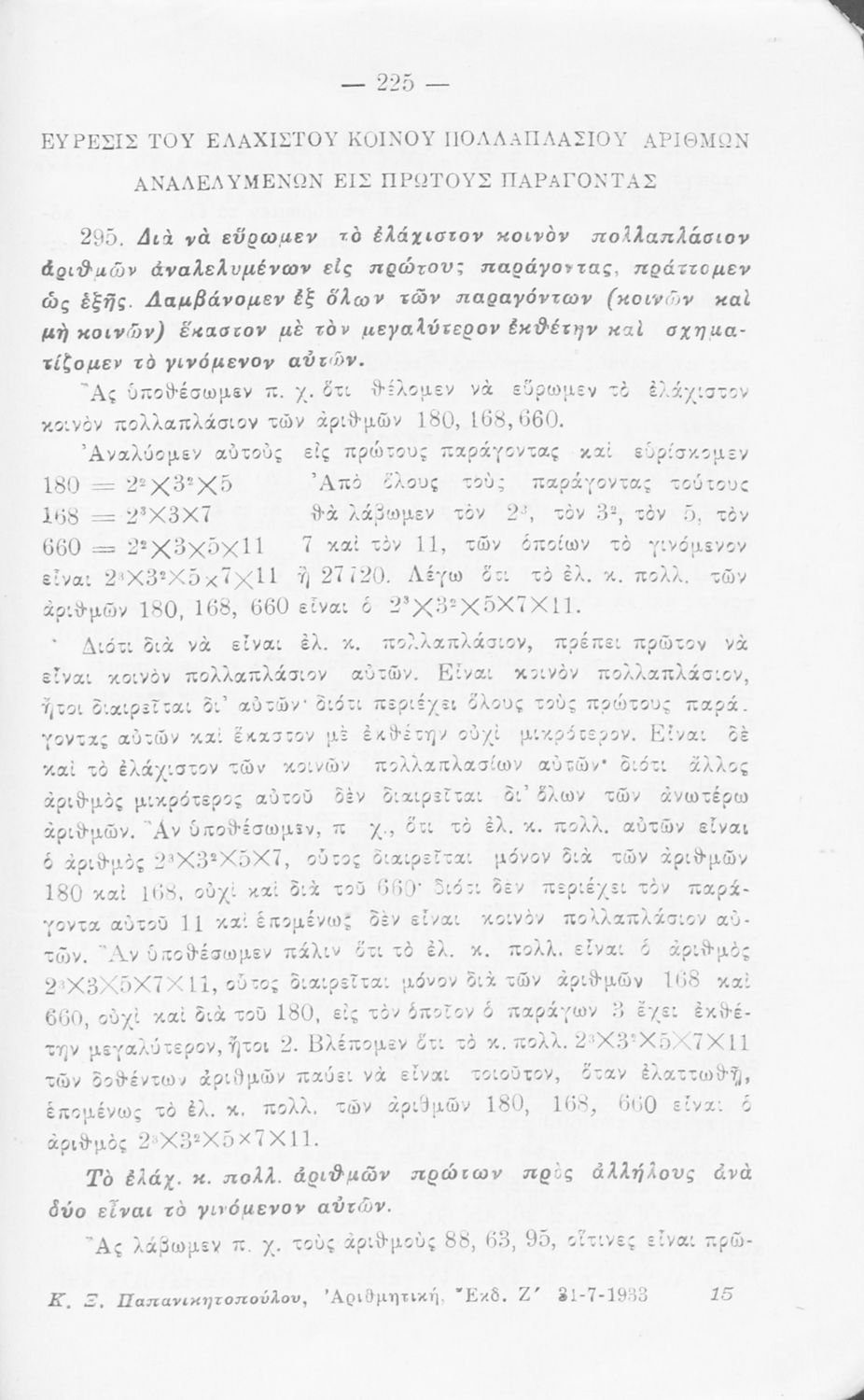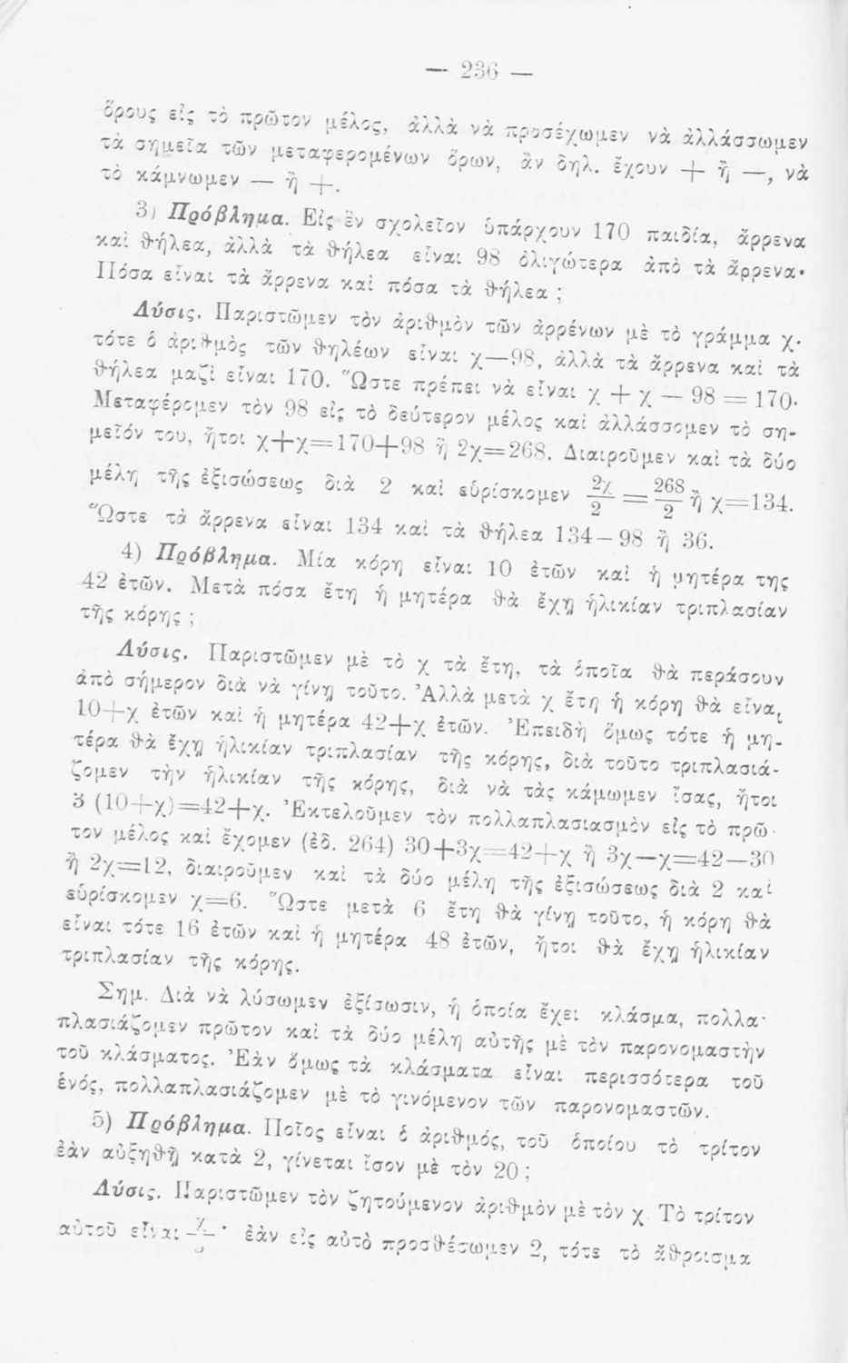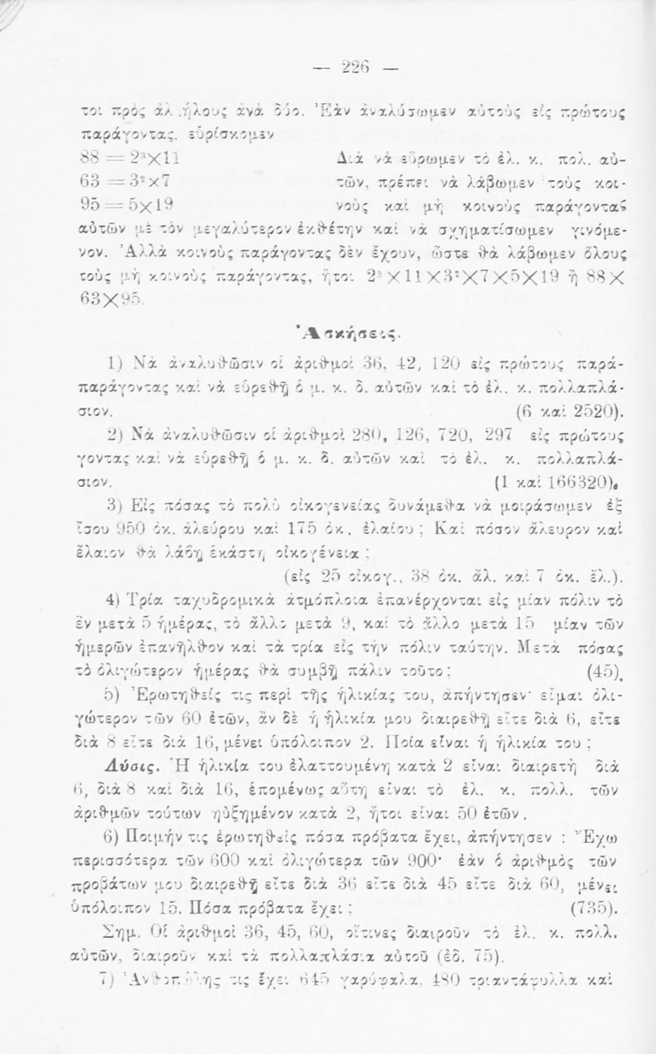 Βαθμίδα εκπαίδευσης: Δευτεροβάθμια Τάξη: Α' Γυμνασίου / Β' Γυμνασίου / Γ' Γυμνασίου Μάθημα: Αριθμητική Γλώσσα: Καθαρεύουσα Παρουσίαση περιεχομένου: Σχολικό εγχειρίδιο Αριθμητικής για τις Α΄, Β΄, Γ΄ Γυμνασίου και τα Ανώτερα Παρθεναγωγεία που είναι χωρισμένο σε θεωρία και ασκήσεις και εστιάζει στις αριθμητικές πράξεις με κλάσματα και ακέραιους και συμμιγείς αριθμούς. |